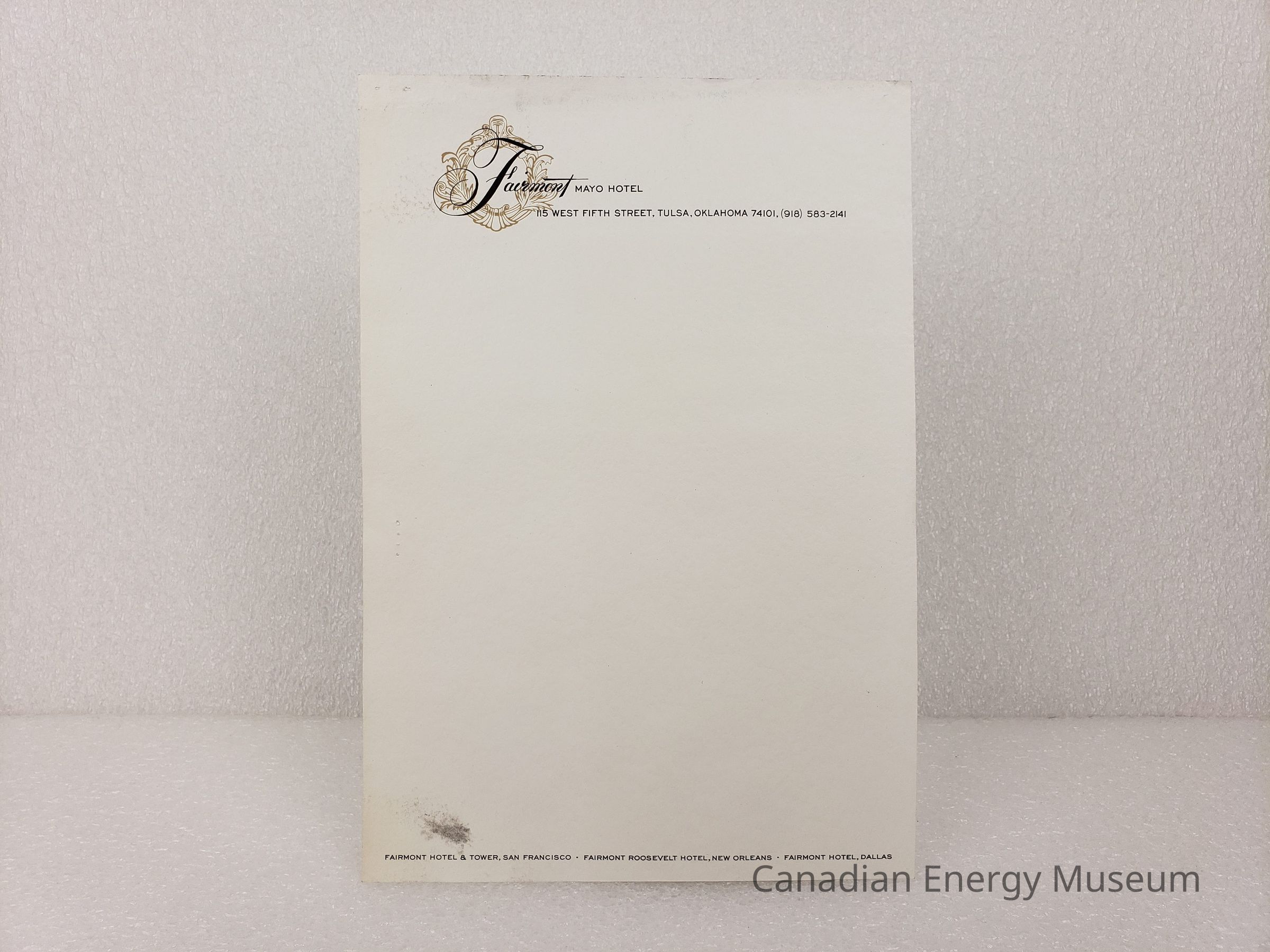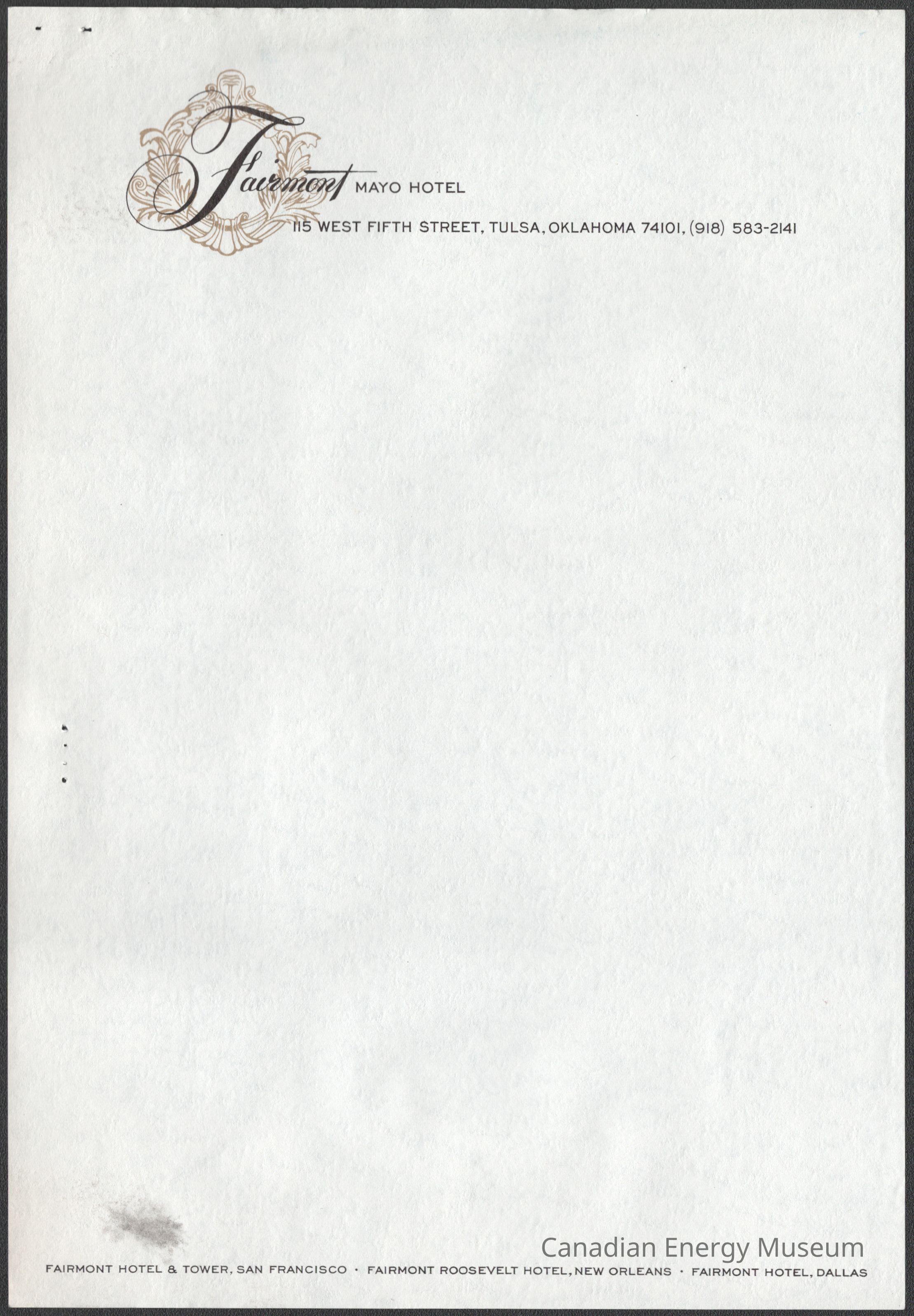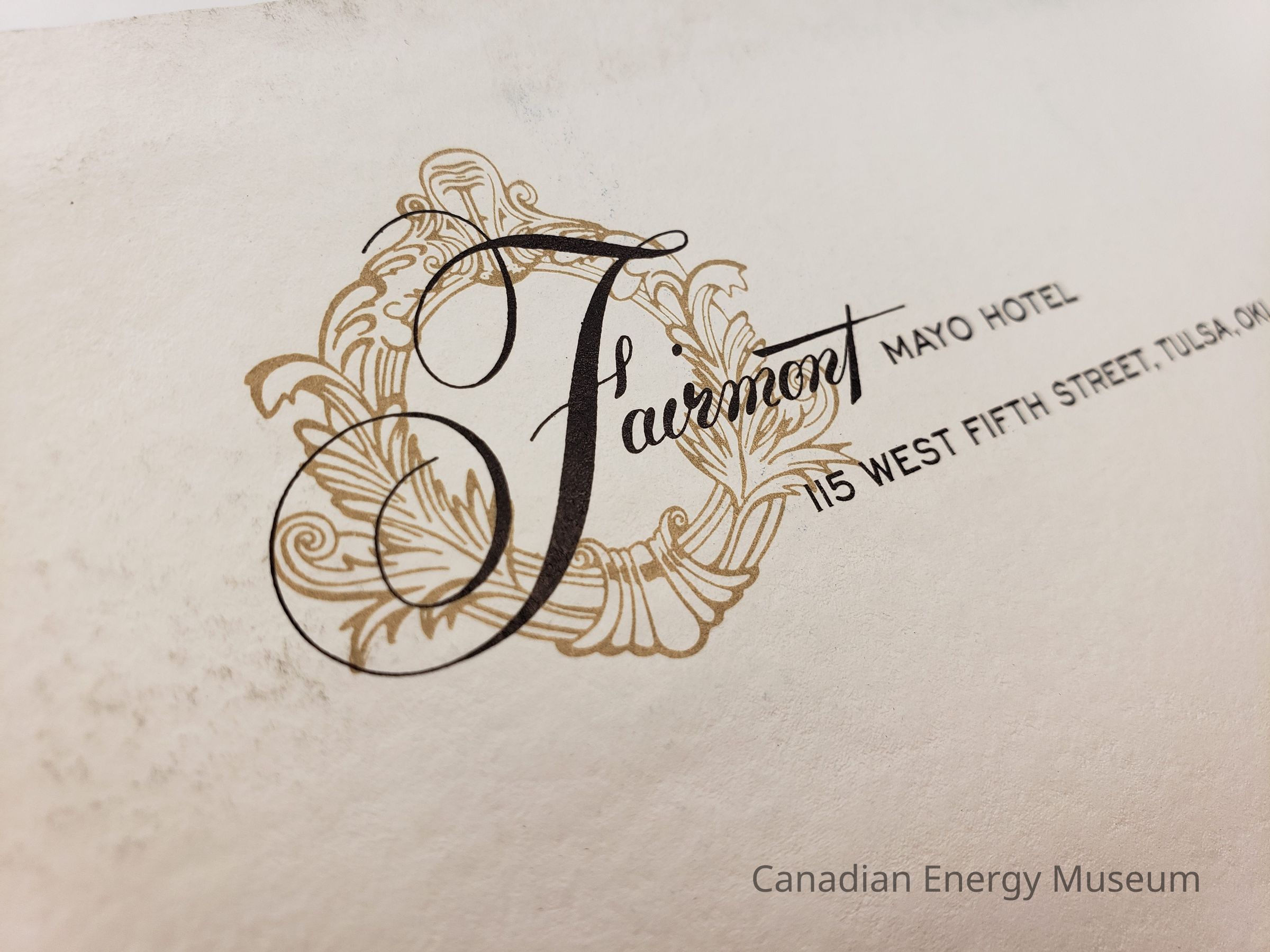 A branded sheet of letter paper, from the Fairmont Mayo Hotel, Tulsa Oklahoma. Hotel letter head is positioned in the top-left, with black print text and gold print decorative wreath design. Black text is also present along the bottom.