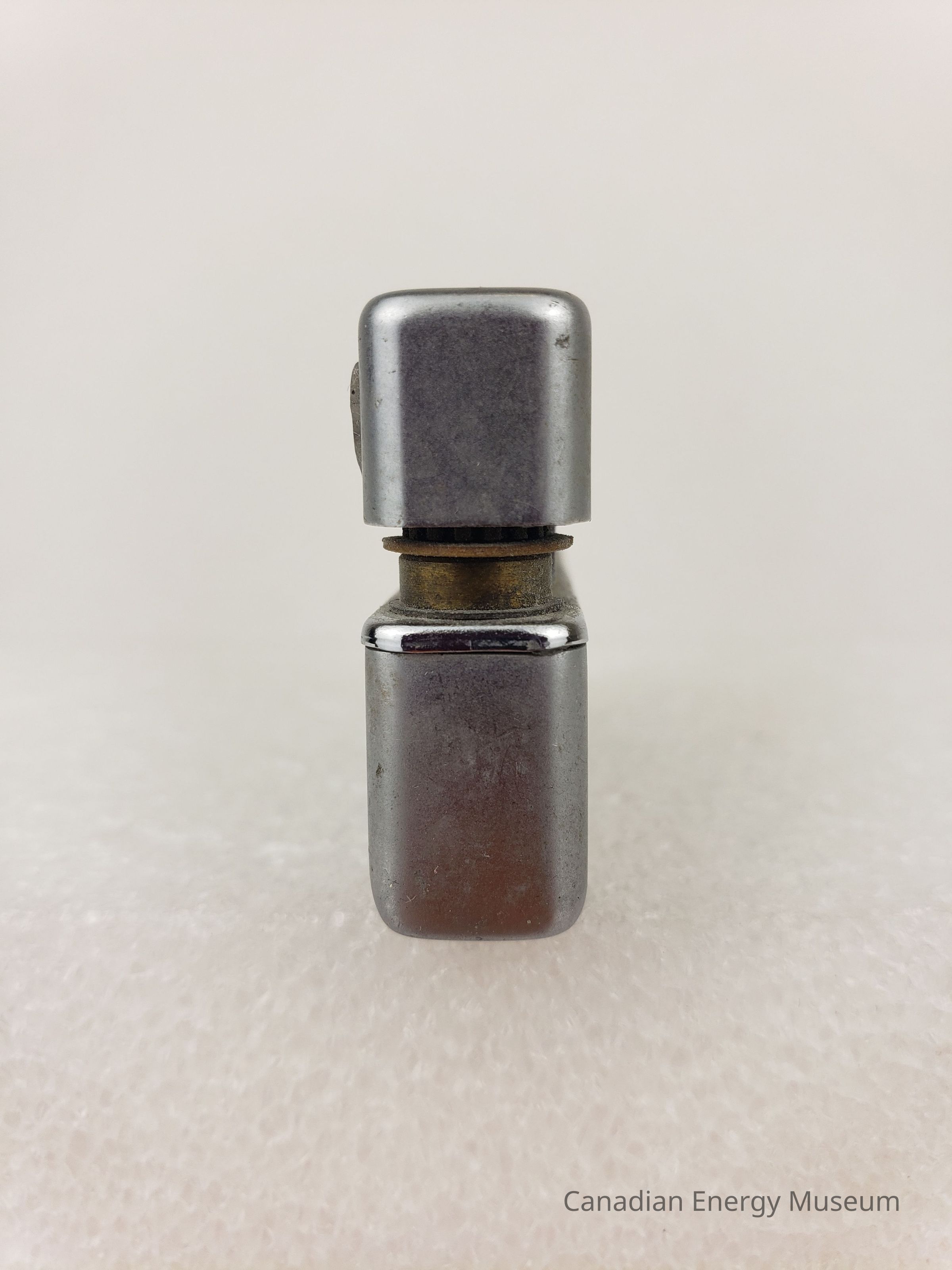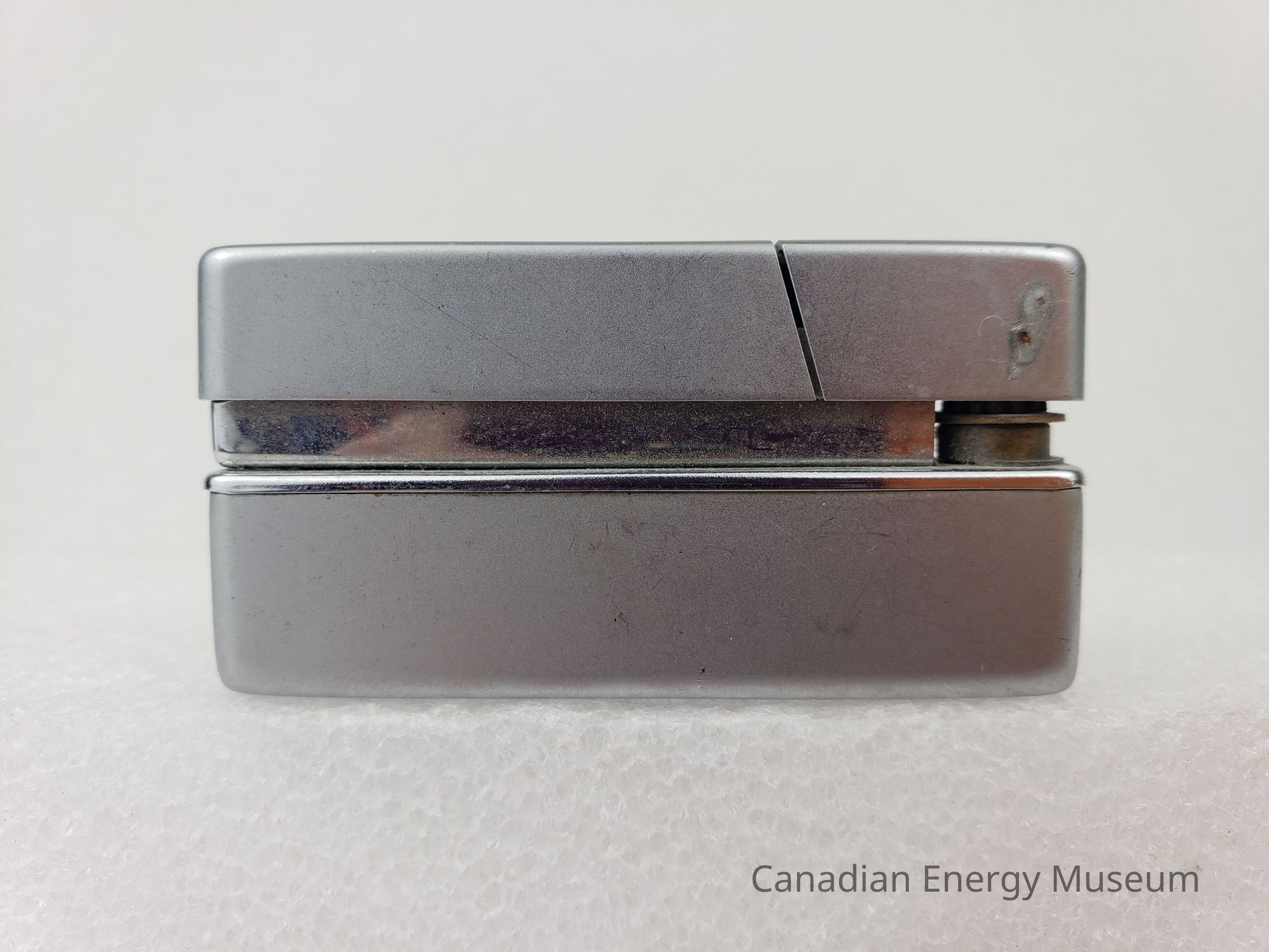Description: A rectangular lighter, with a long top button to strike the flint. On the front is the red print "Jet Perforators; CALGARY 262-4156; EDMONTON 465-0477" along with the brand "MADE IN FRANCE".