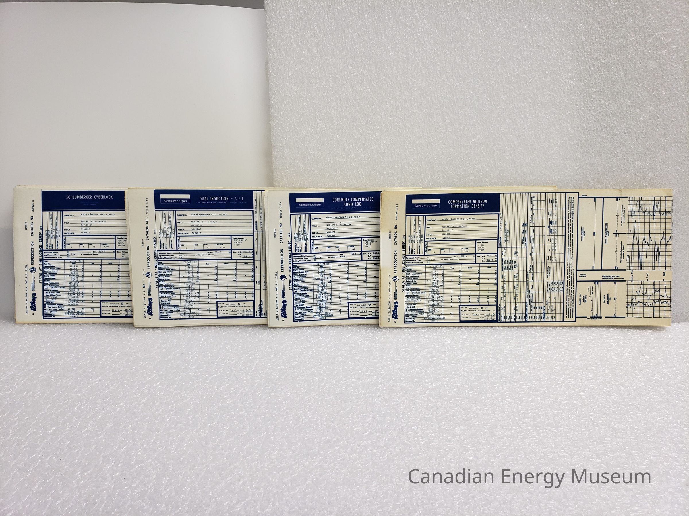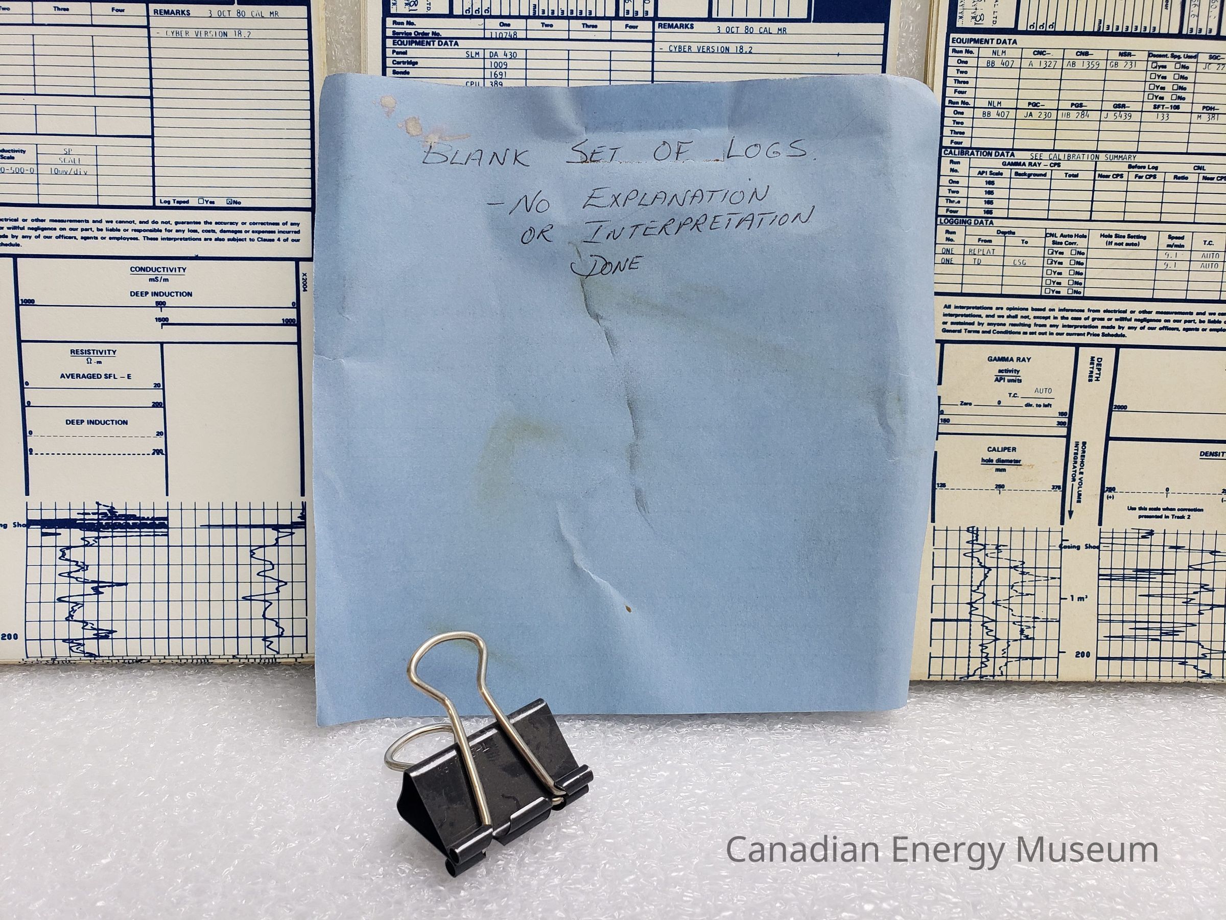 A set of four log forms, with an attached not reading "BLANK SET OF LOGS; —NO EXPLANATION OR INTERPRETATION DONE".
