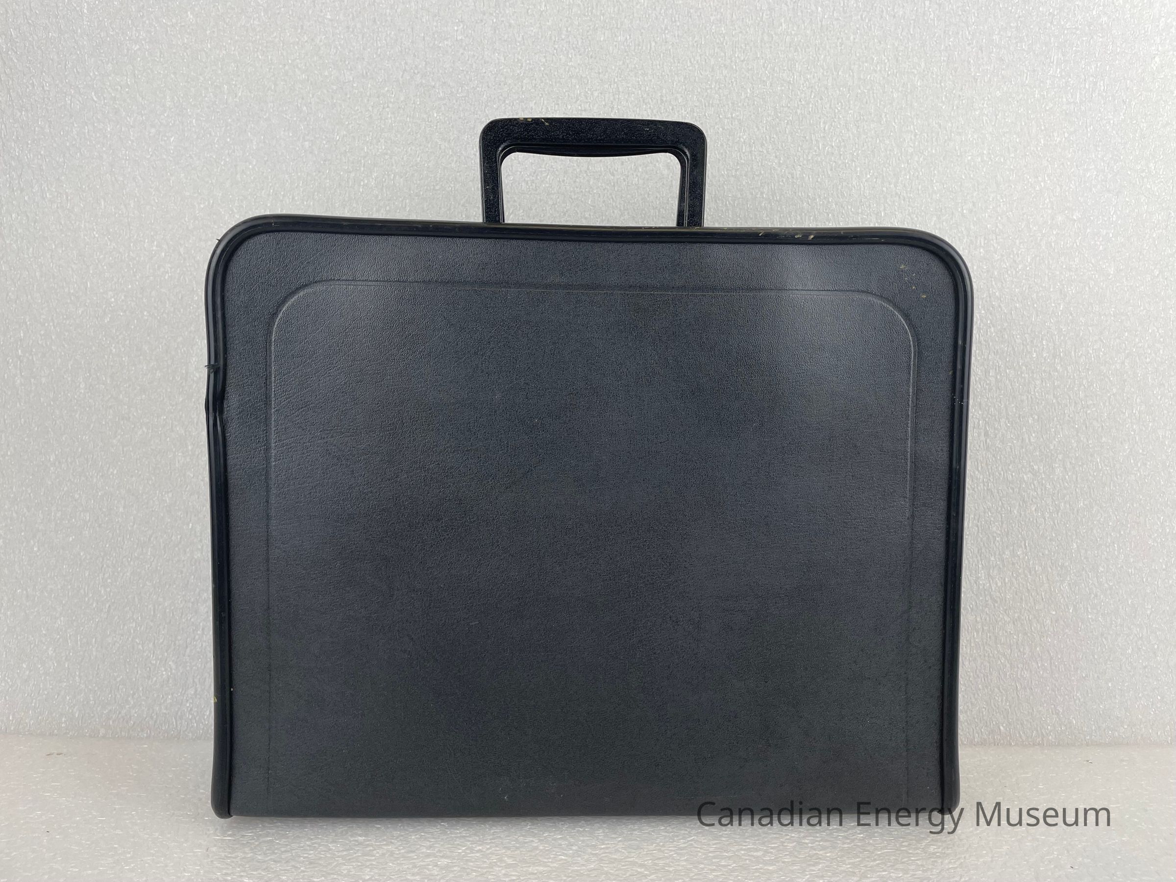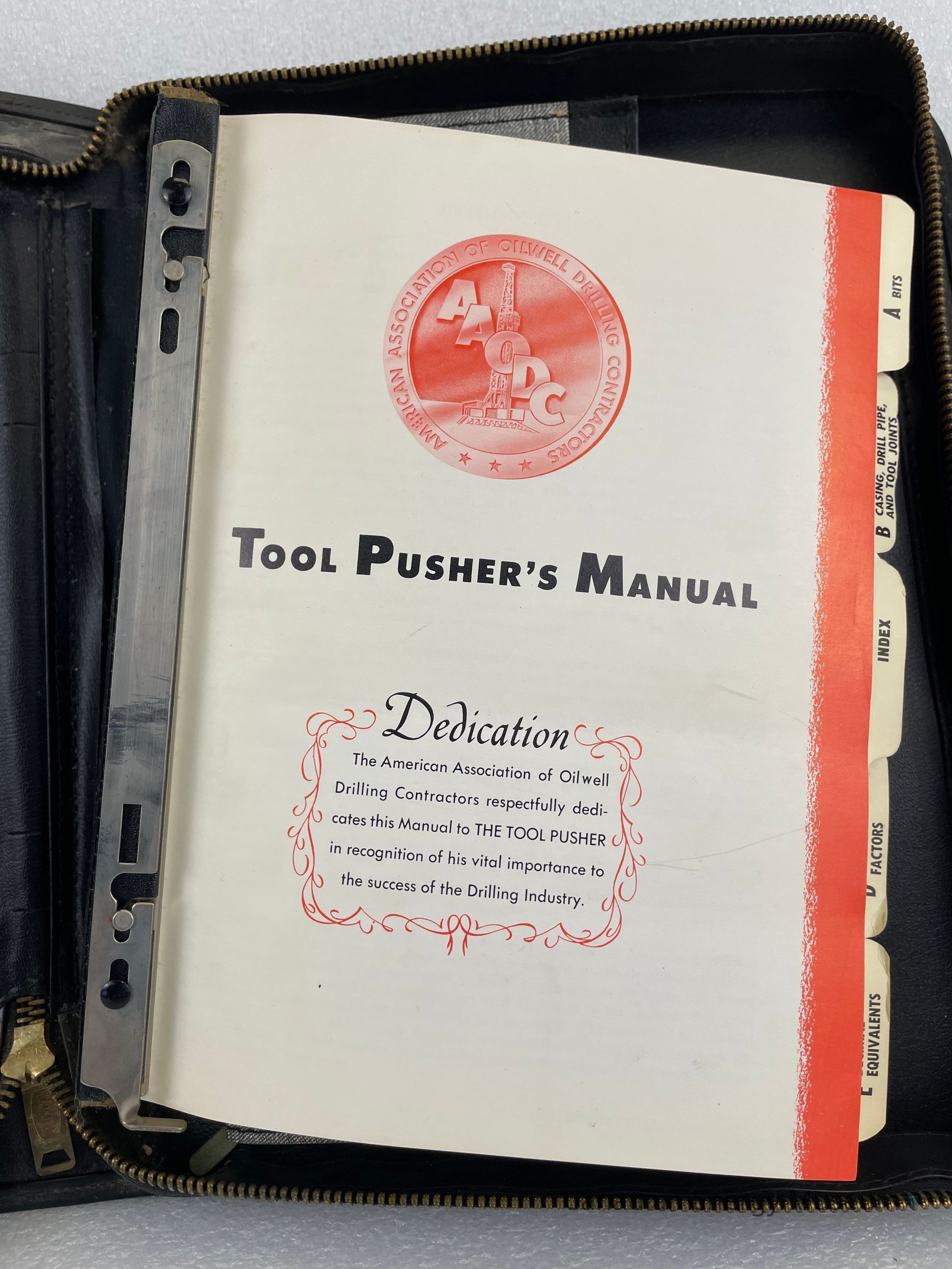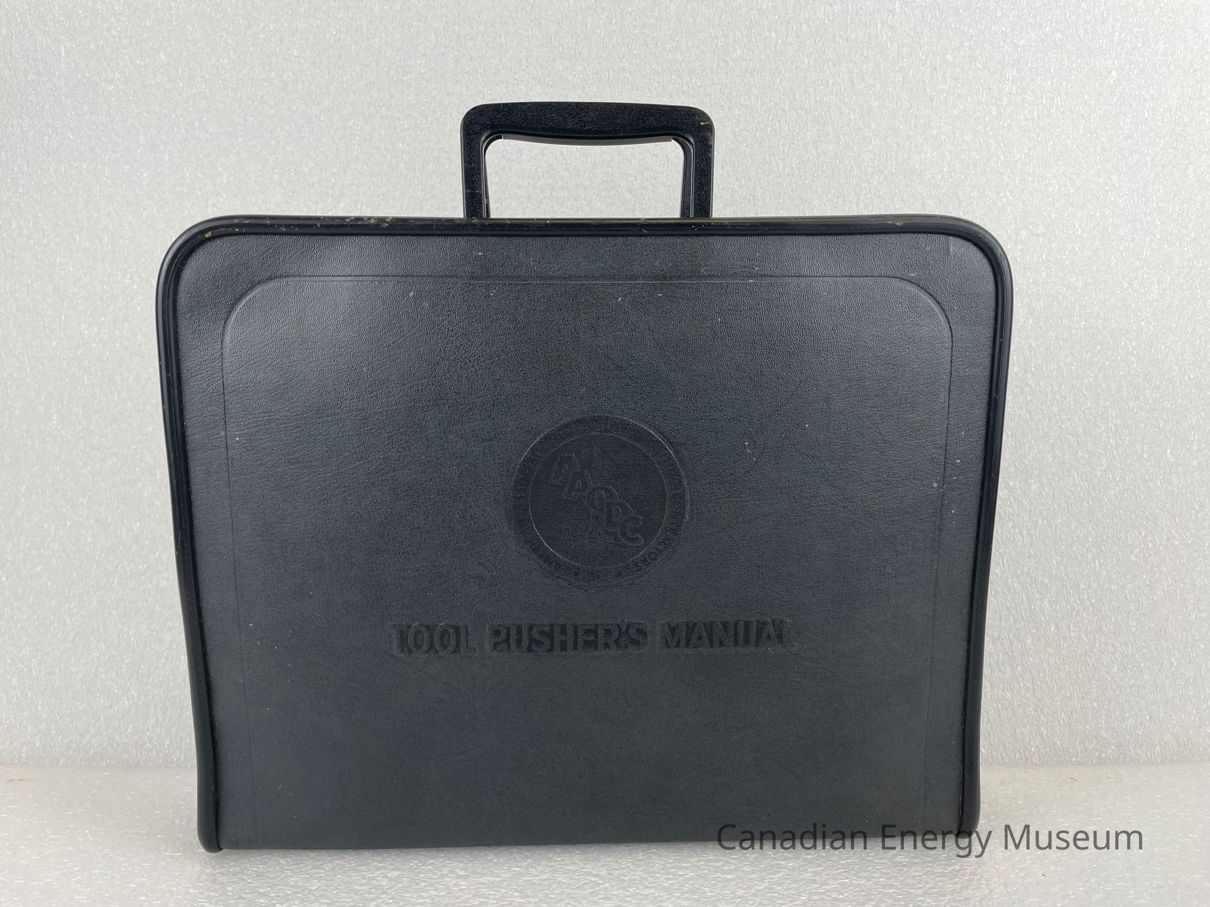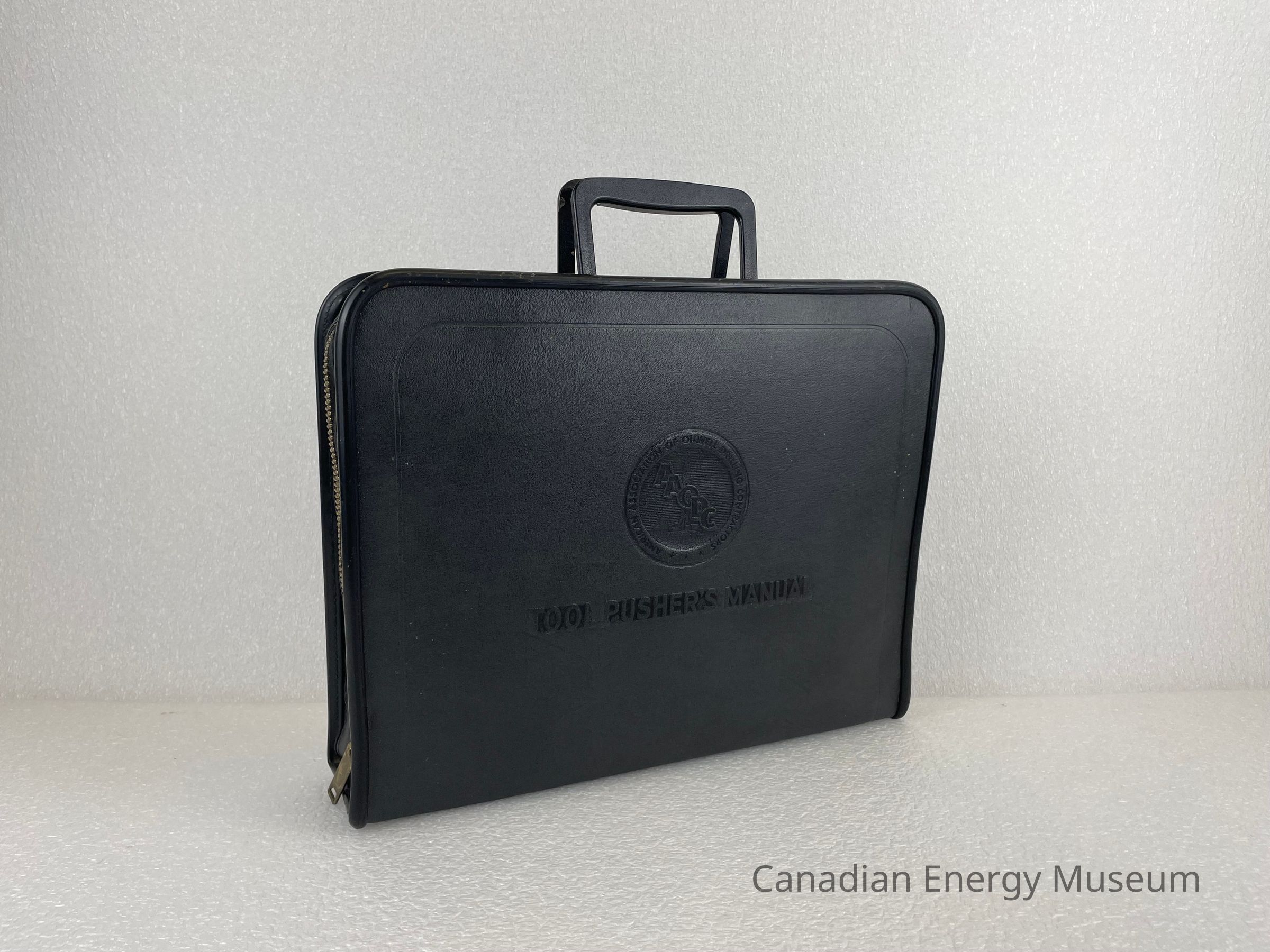 A black briefcase with a bronze zipper and two plastic handles contains a Tool Pusher's Manual. The front of the briefcase displays an embossed circular logo with the letters "AAODC" slightly layered over one another in a diagonal line in the centre of the circle. Another circle borders the centre with text reading, "American Association of Oilwell Drilling Contractors". The zipper is bronze and features an etching of a rounded rectangle with the text, "SCOVILL".