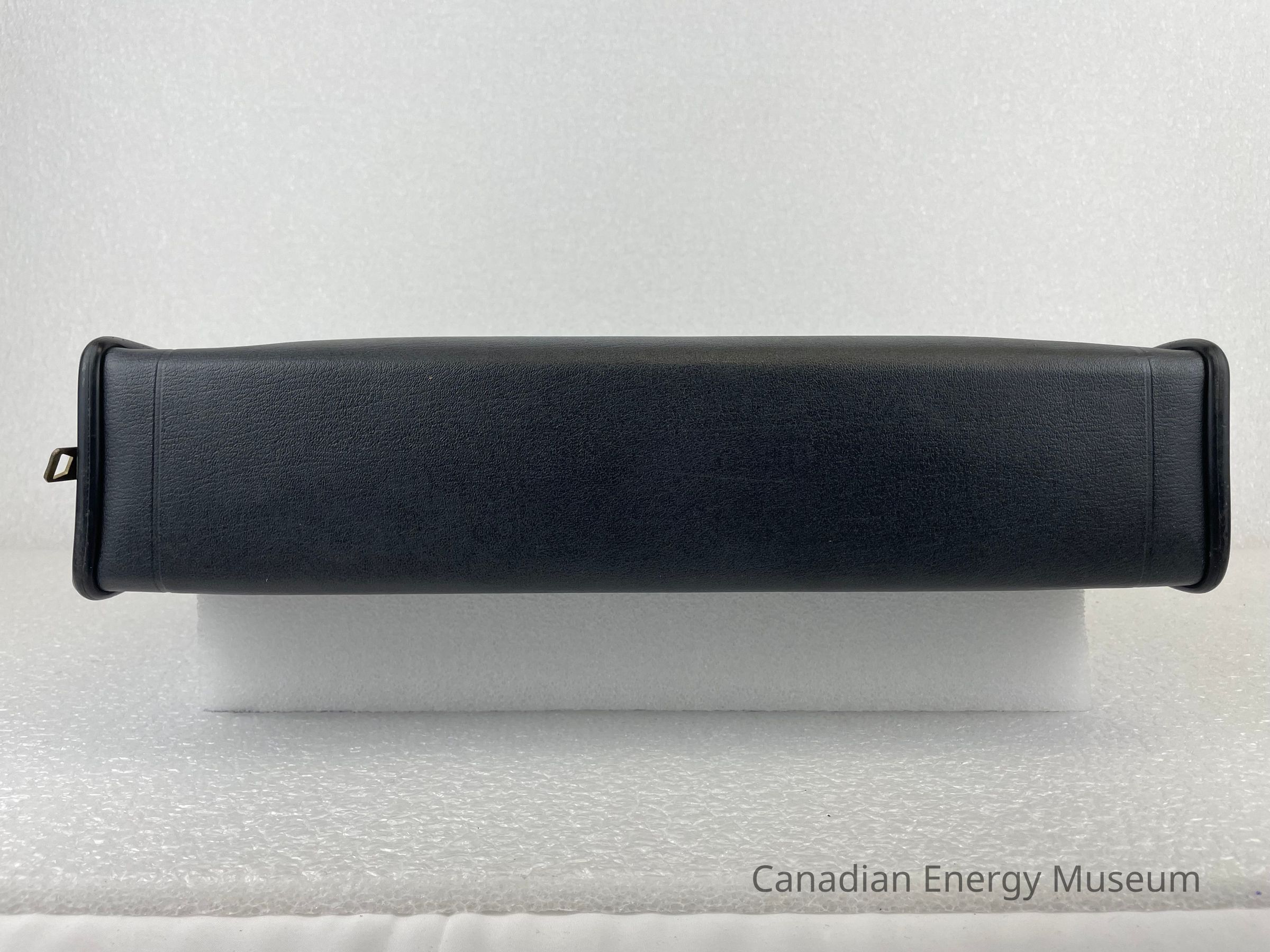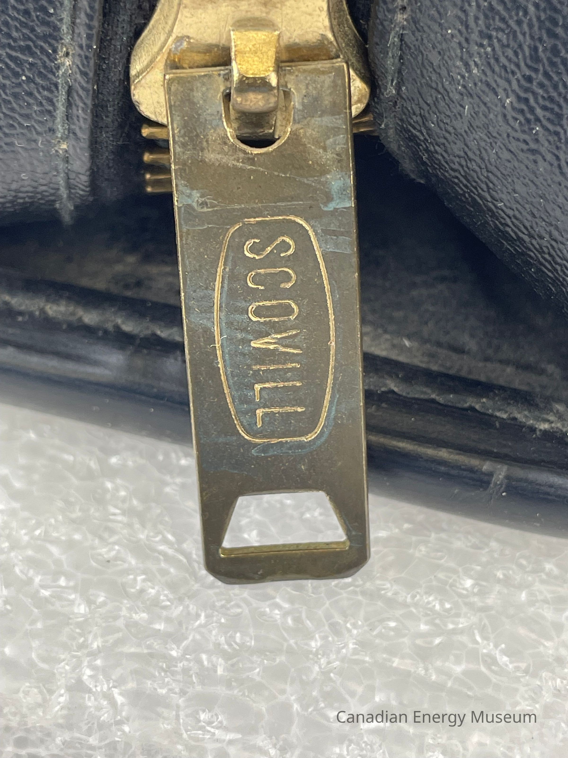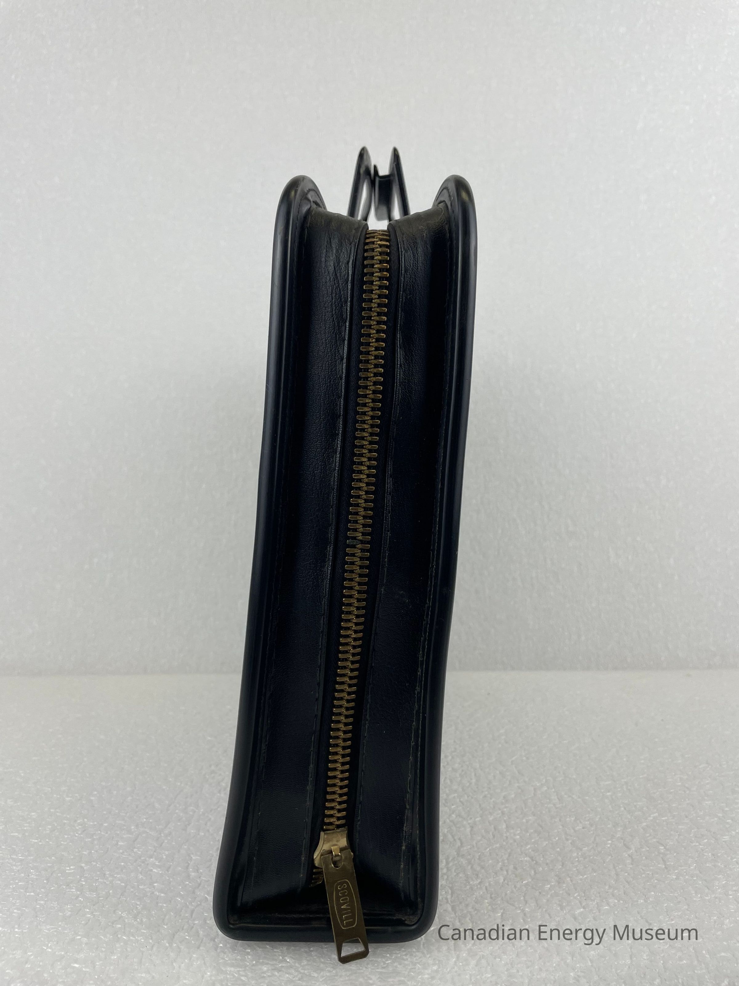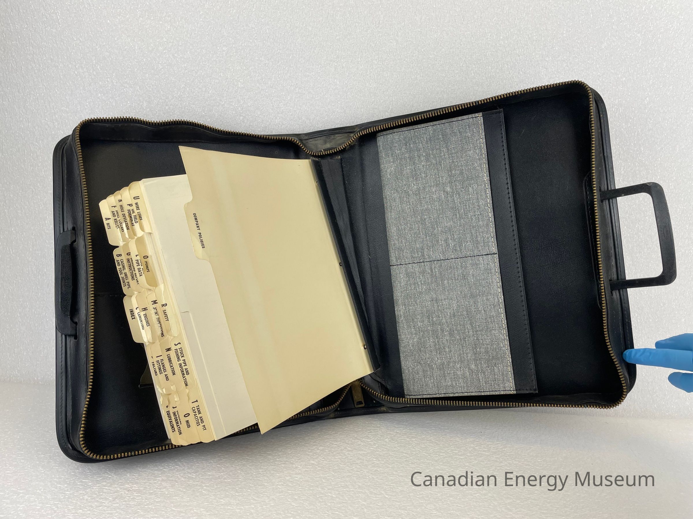 A black briefcase with a bronze zipper and two plastic handles contains a Tool Pusher's Manual. The front of the briefcase displays an embossed circular logo with the letters "AAODC" slightly layered over one another in a diagonal line in the centre of the circle. Another circle borders the centre with text reading, "American Association of Oilwell Drilling Contractors". The zipper is bronze and features an etching of a rounded rectangle with the text, "SCOVILL".