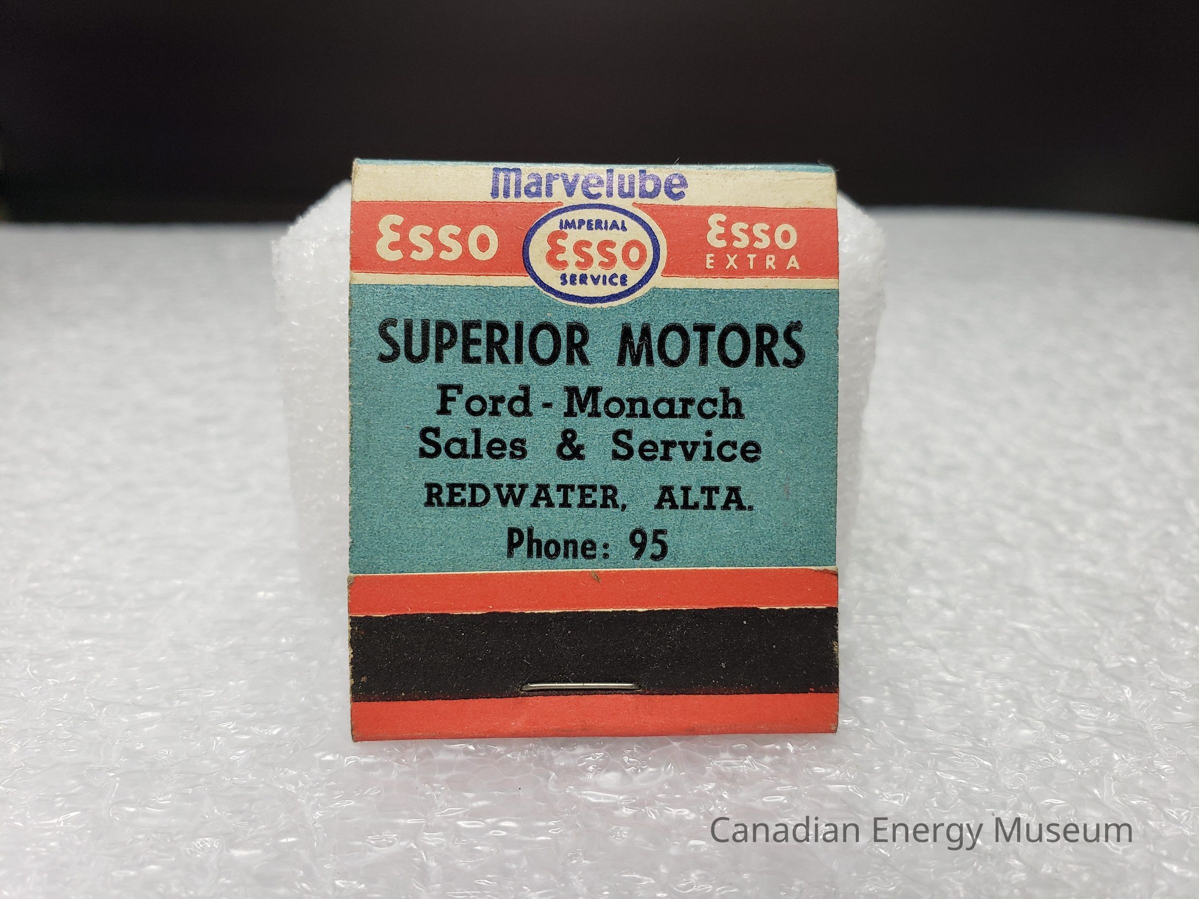 Front Cover: Along top branding for Esso Gas/Marvelube across top. Center and bottom features turquoise base with back text: "SUPERIOR MOTORS; Ford-Monarch Sales & Service; REDWATER, ATLA.; Phone: 95"