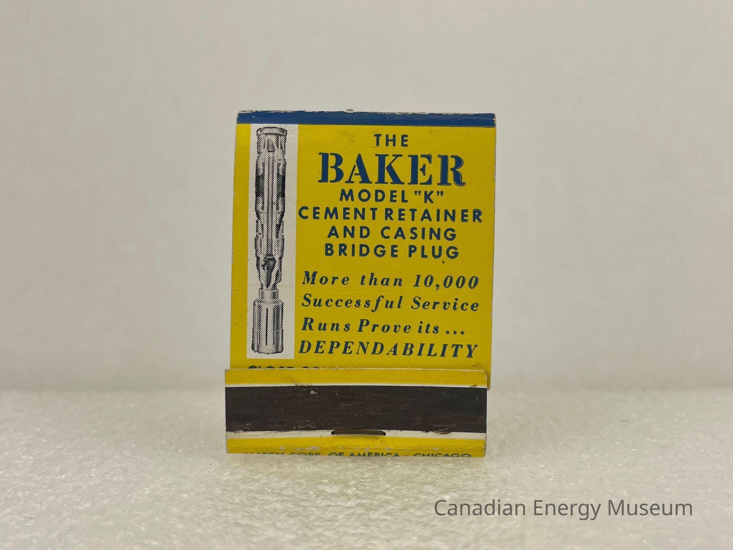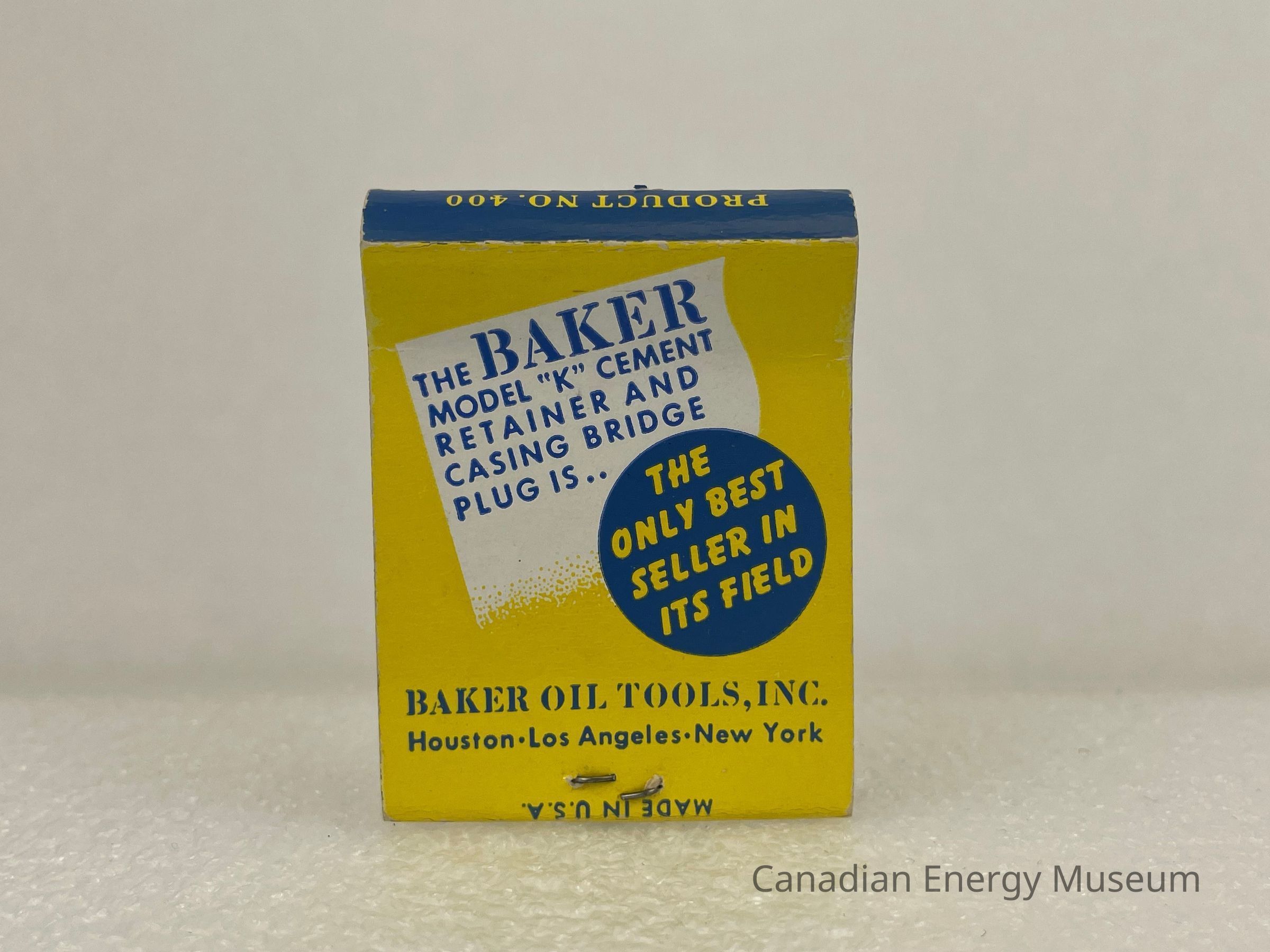 A 20-strike matchbook, branded to Baker Oil Tools Inc. The exterior is yellow with blue text. The front features blue sans-serif text reading, "THE BAKER MODEL "K" CEMENT RETAINER AND CASING BRIDGE PLUG", and in a serif, italic blue text reads, "More than 10,000 Successful Service Runs Prove its... DEPENDABILITY". To the left of the text is a thin image of a cement retainer and casing bridge plug, on a white rectangular background. The top of the matchbook, where the cardboard folds, is a blue rectangle with yellow text reading, "PRODUCT NO. 400". The back of the matchbook features a white rectangle sitting at an angle with blue text reading, "THE BAKER MODEL "K" CEMENT RETAINER AND CASING BRIDGE PLUG IS...". A Blue circle with yellow text is layered overtop the white rectangle reading, "THE ONLY BEST SELLER IN ITS FIELD". Below in blue text reads, "BAKER OIL TOOLS, INC.", "Houston - Los Angeles - New York".