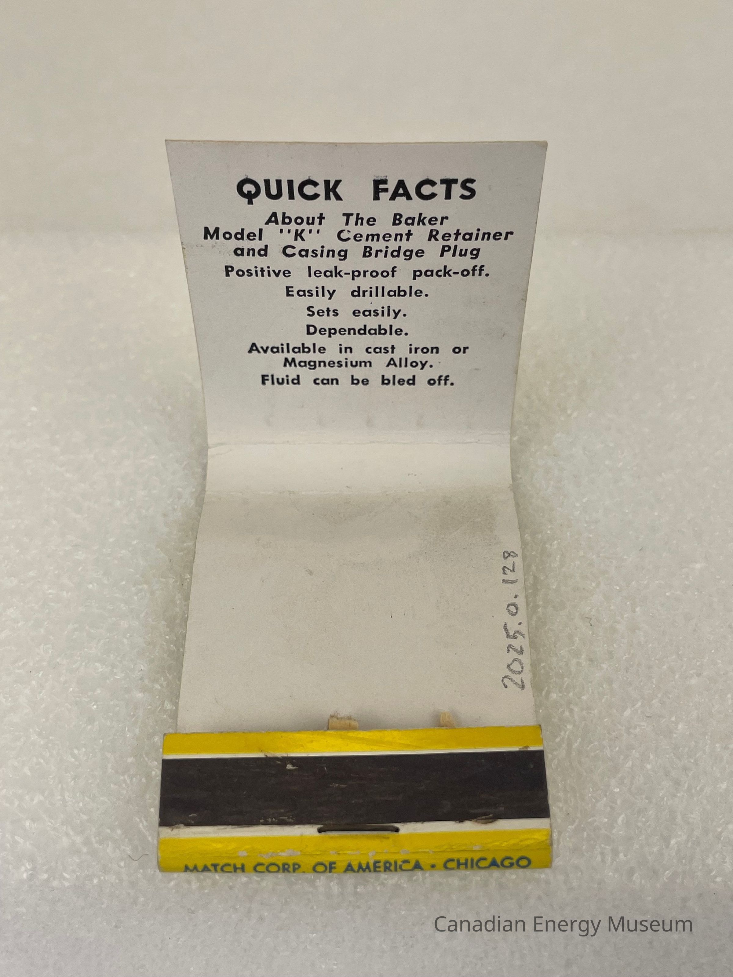 No matches are present. The interior is white with black text at the top of the matchbook flap reading, "QUICK FACTS", "About the Baker Model "K" Cement Retainer and Casing Bridge Plug Positve leak-proof pack-off. Easily drillable. Sets easily. Dependable. Available in cast iron or Magnesium Alloy. Fluid can be bled off."Collection