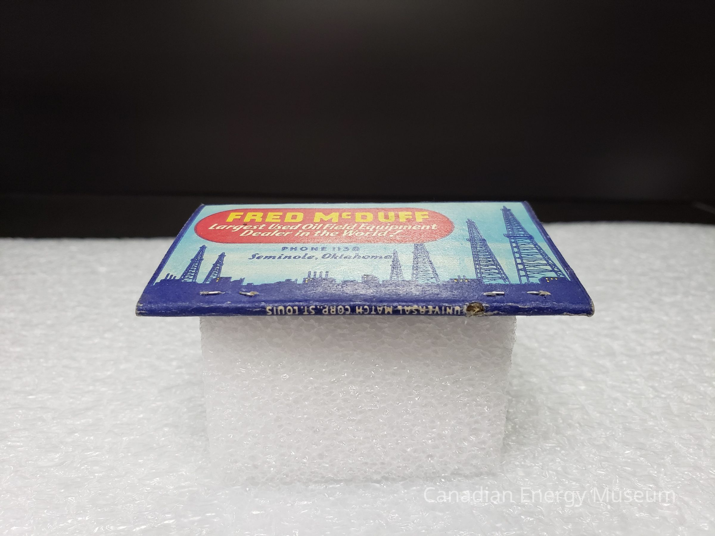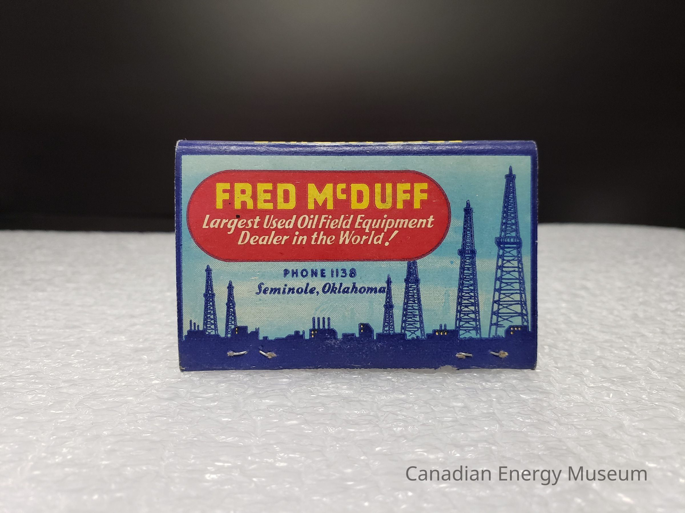 Interior: Full-colour interior. Blue-on-blue imagery of two oil rigs inside a vertical oval on right. On left-side reads the text (yellow and white): "FRED MCDUFF; OIL FIELD EQUIPMENT; FOR THE OIL FIELDS OF THE WORLD; Seminole, Okla."