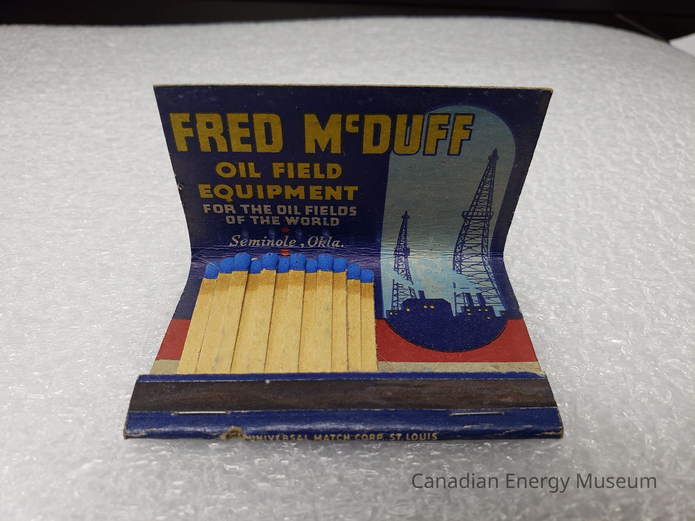 Interior: Full-colour interior. Blue-on-blue imagery of two oil rigs inside a vertical oval on right. On left-side reads the text (yellow and white): "FRED MCDUFF; OIL FIELD EQUIPMENT; FOR THE OIL FIELDS OF THE WORLD; Seminole, Okla."