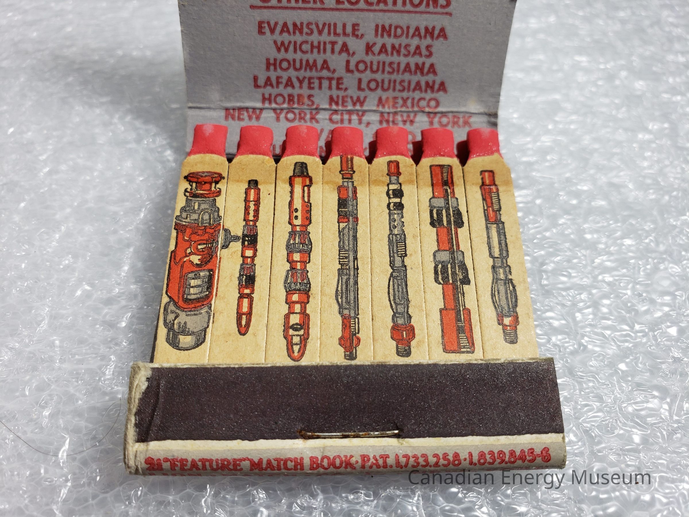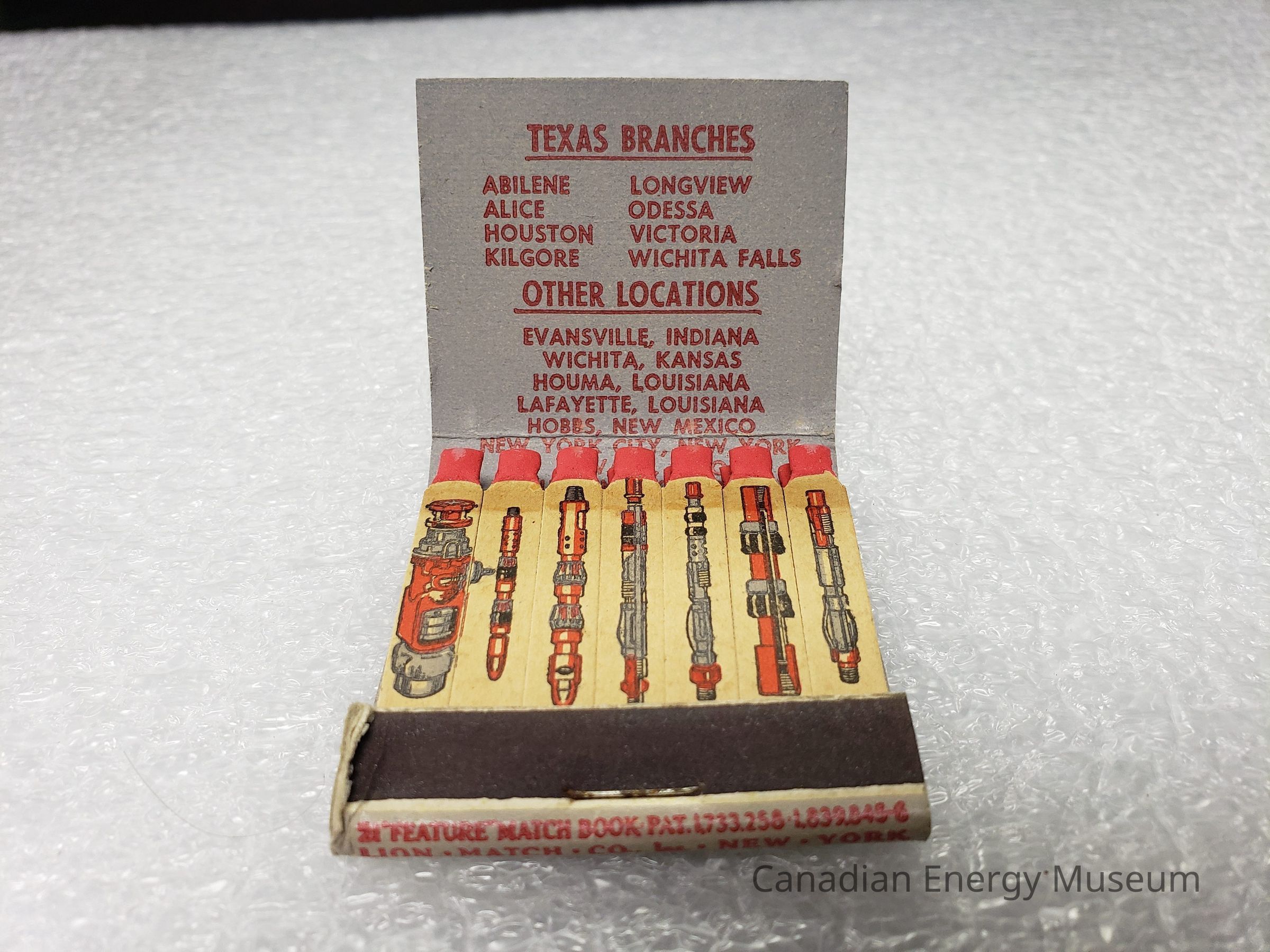 Matches: wide, flat matches with custom print of oil drilling equipment in red, grey, and black print; red match heads.