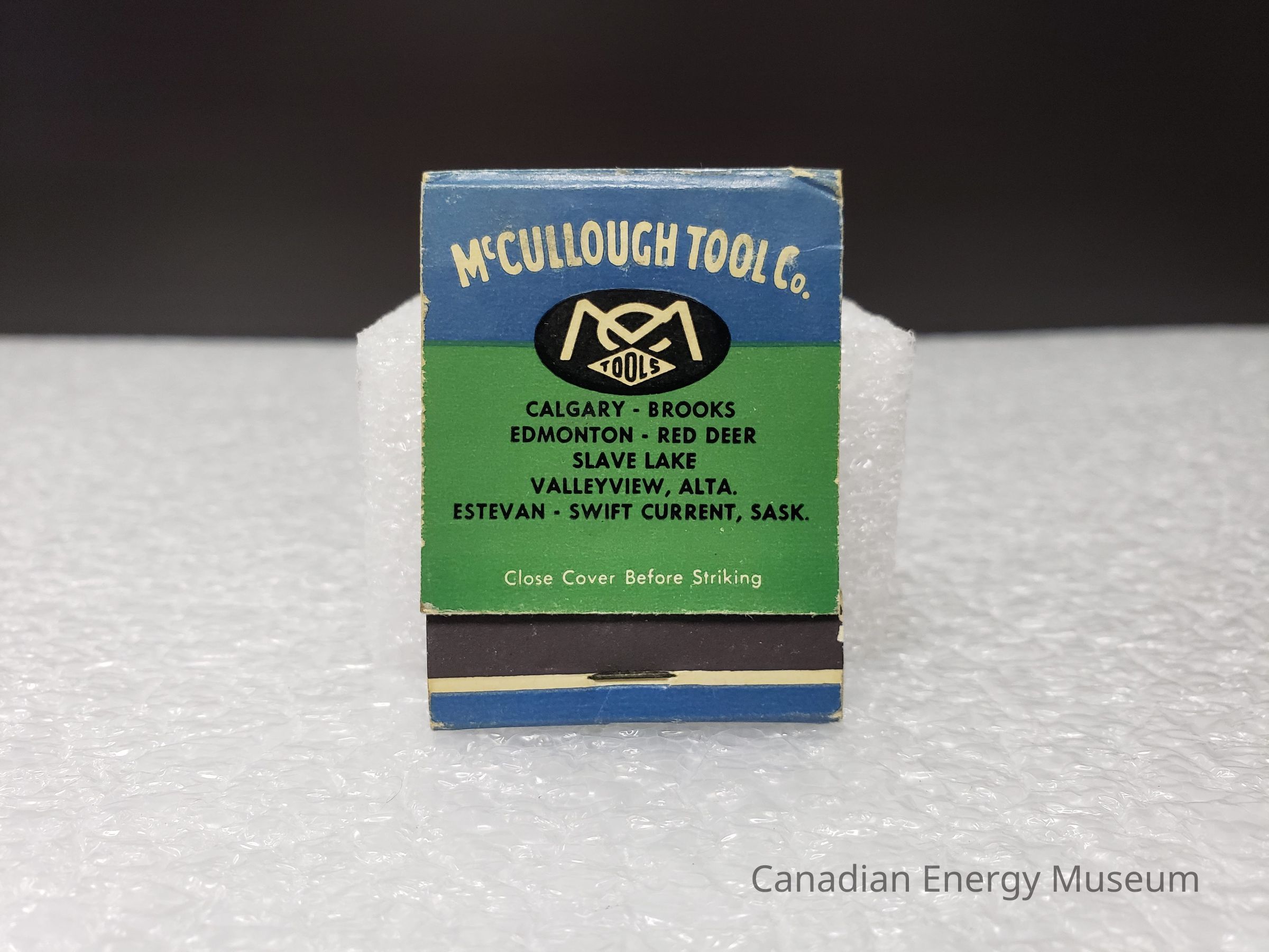 Matchbook, Matches, Paper, Paper Ephemera, McCullough Tool Co., Blue, Green, Calgary, Edmonton, Brooks, Slave Lake, Red Deer, Valleyview, Estevan, Swift Current, Alberta, Saskatoon, CanadaDescription