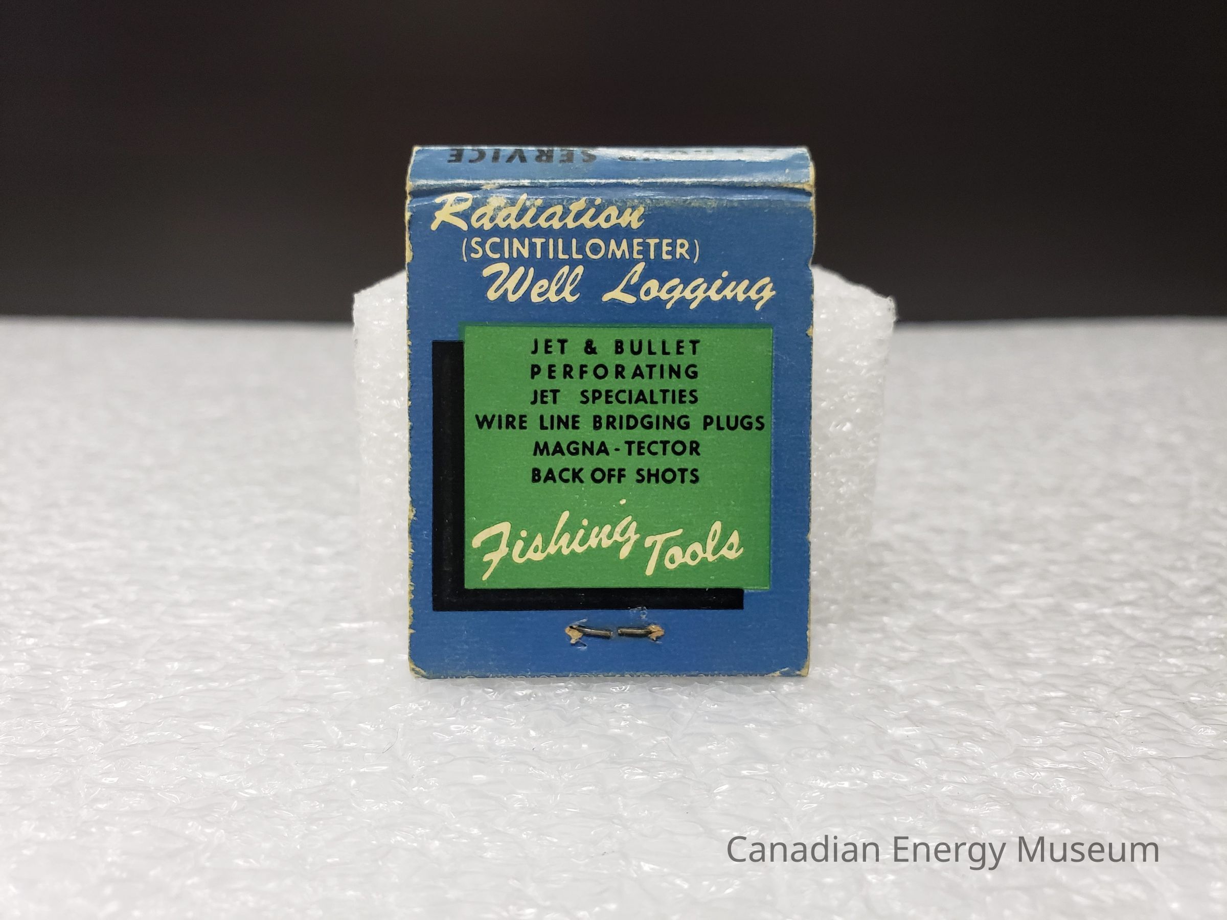 Back Cover: Blue base. White cursive test at top: "Radiation (SCINTILLOMETER) Well Logging". Below, a green square box with black drop-shadow, containing the following black text: "JET & BULLER PERFORATING; JET SPECIALITIES; WIRE LINE BRIDGING PLUGS; MAGNA-TECTOR; BACK OFF SHOTS". In white cursive at the bottom of the green square: "Fishing Tools".