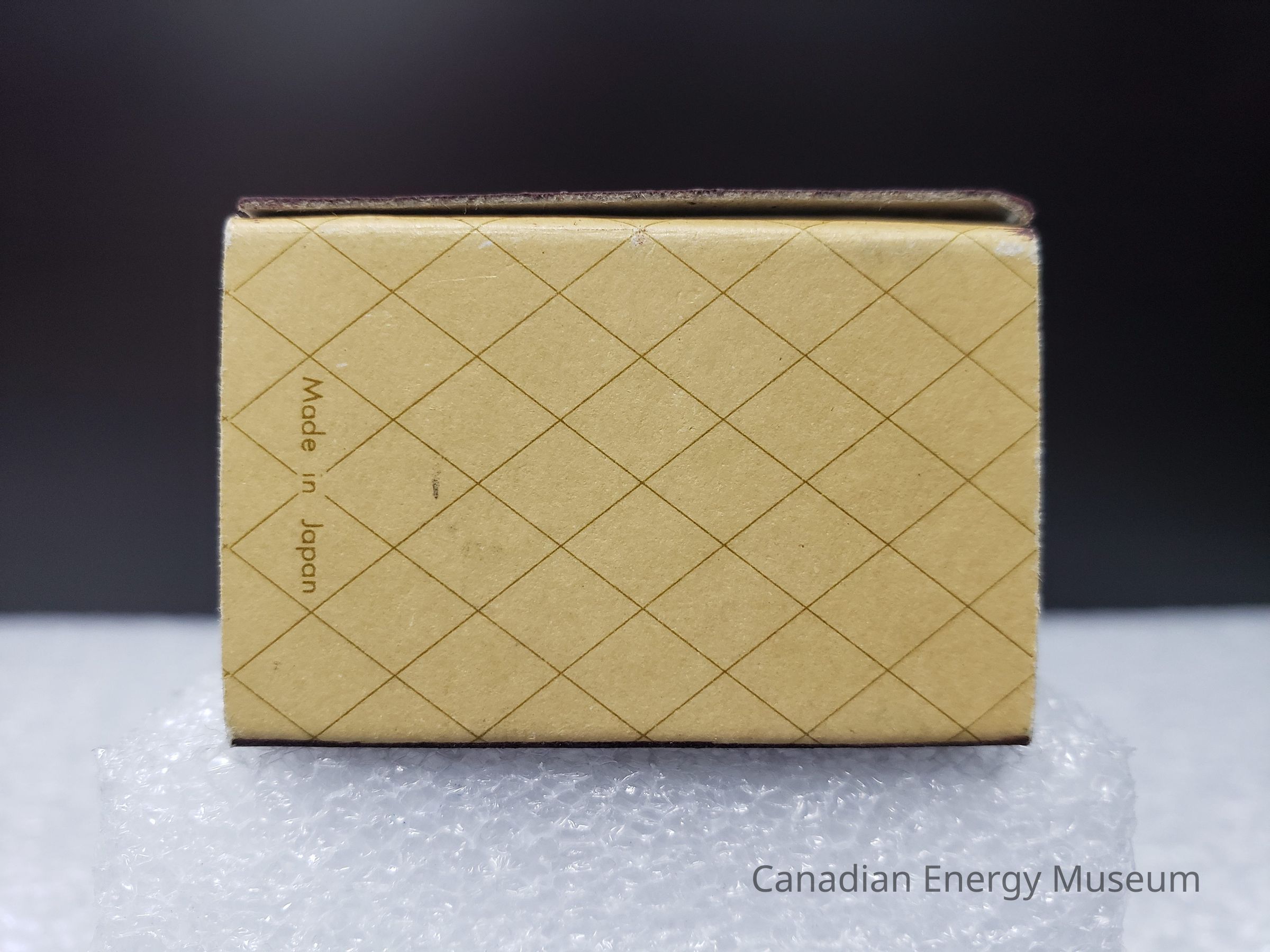 "DIAMANT BOART" with a stylized logo of a connected lowercase 'd' and 'b' to the left of the text.the text is surrounded by a raised bubble in the paper that has deflated towards the middle. The side of the shell have reddish-brown scratch paper to light the match. the bottom of the shell has a dark brown diamond cross-hatch pattern on a beige background. The short end of the bottom says "Made In Japan". the inside of the shell is a gray-brown cardboard.