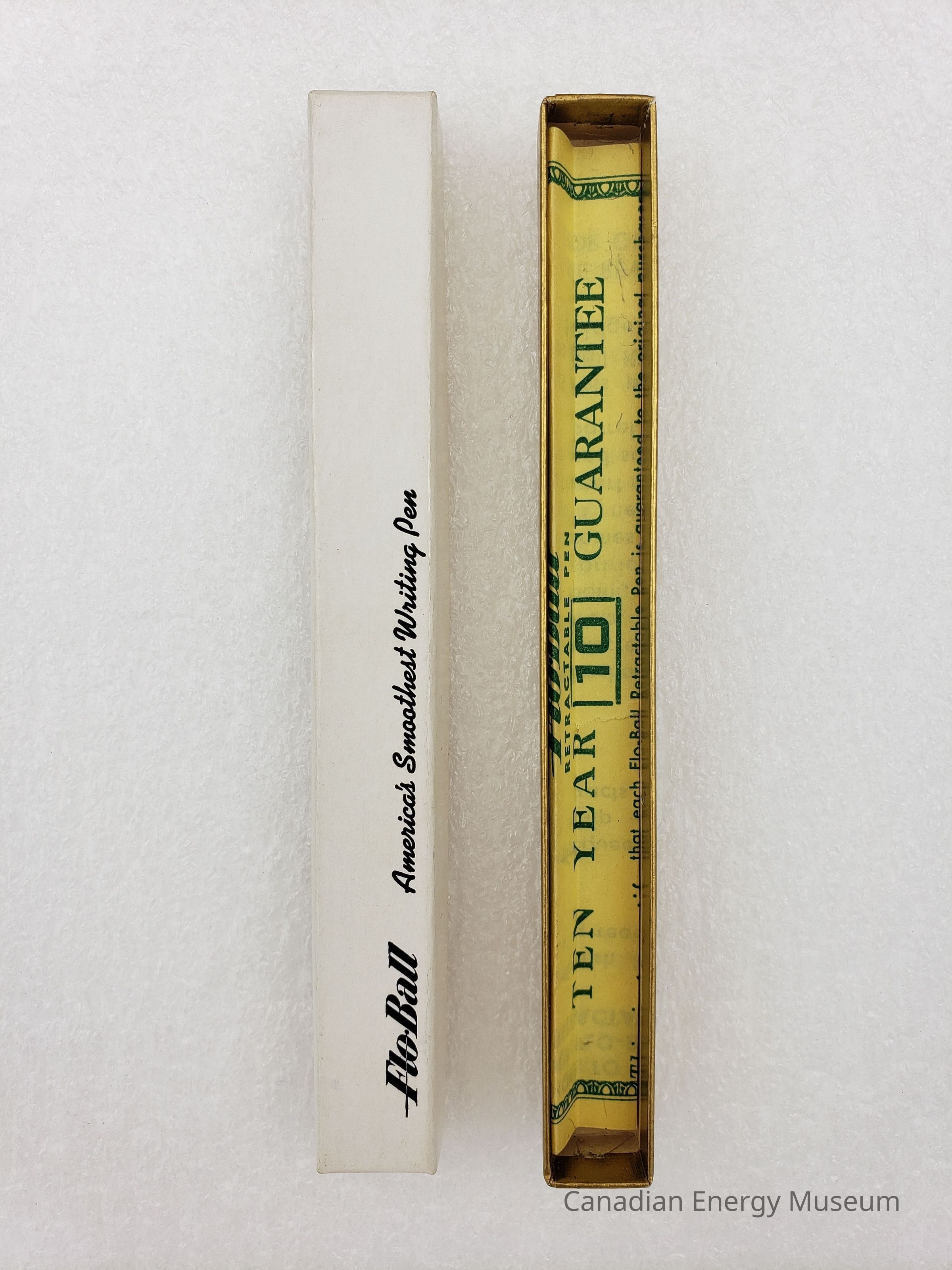 Box: A cardboard box, with a telescope style lid and base. The lid is white with black print, reading "FloBall America's Smoothest Writing Pen". The base is a plain metallic gold.