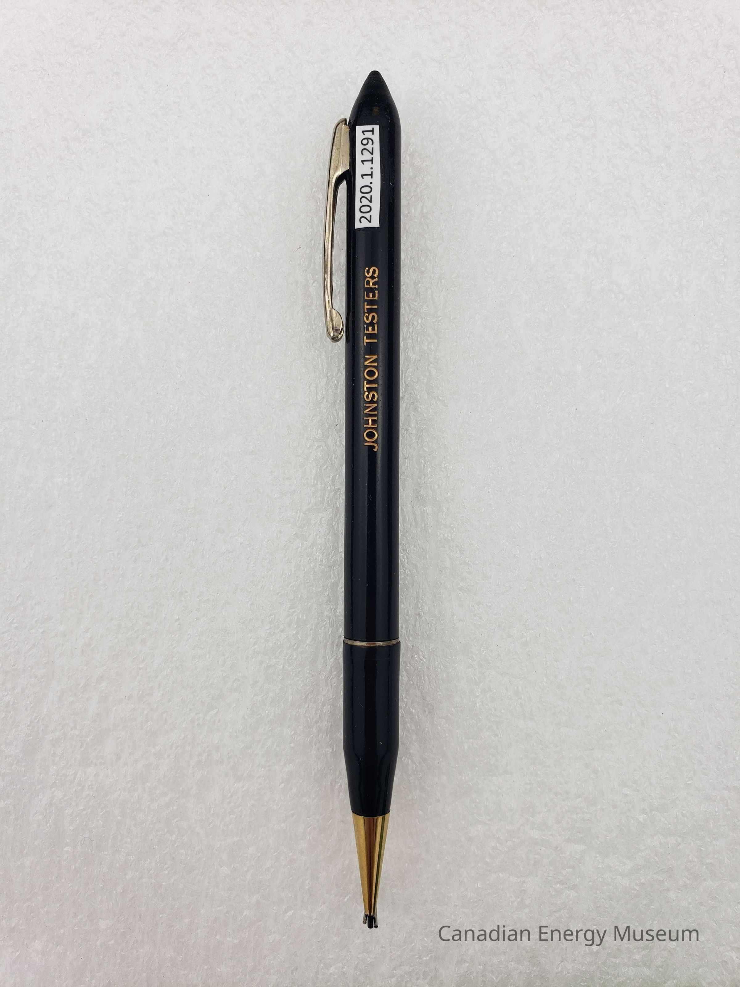 Pen: A mechanical pencil, with a plastic body and metal detailing. The body is black plastic, with gold print, reads "JOHNSTON TESTERS". The metal detailing includes a gold-coloured section at the pencil tip; a fine gold-coloured bands near to the pencil tip; and a gold-coloured clip. The pencil led mechanism is a twist motion at the fine band mentioned above.