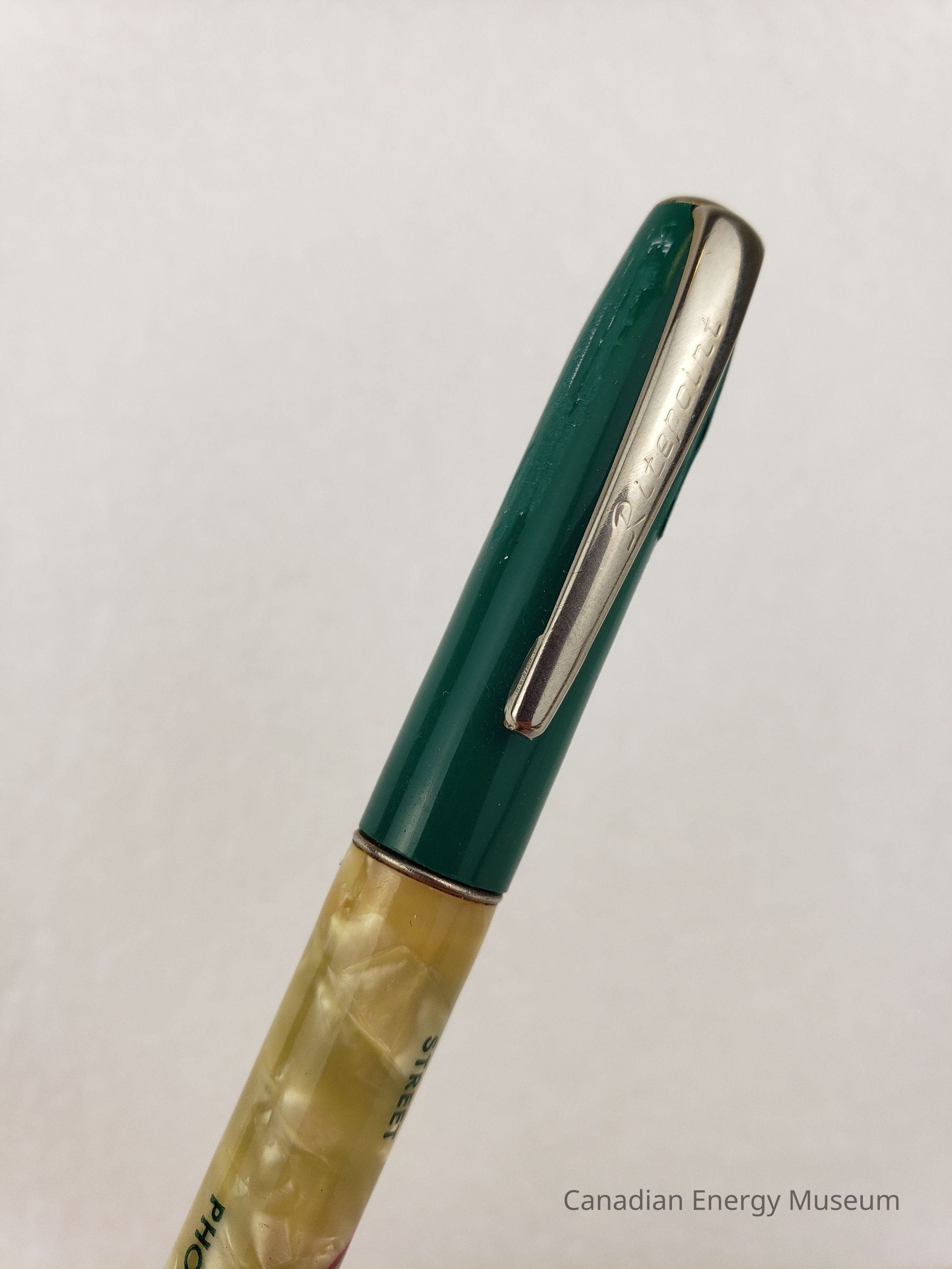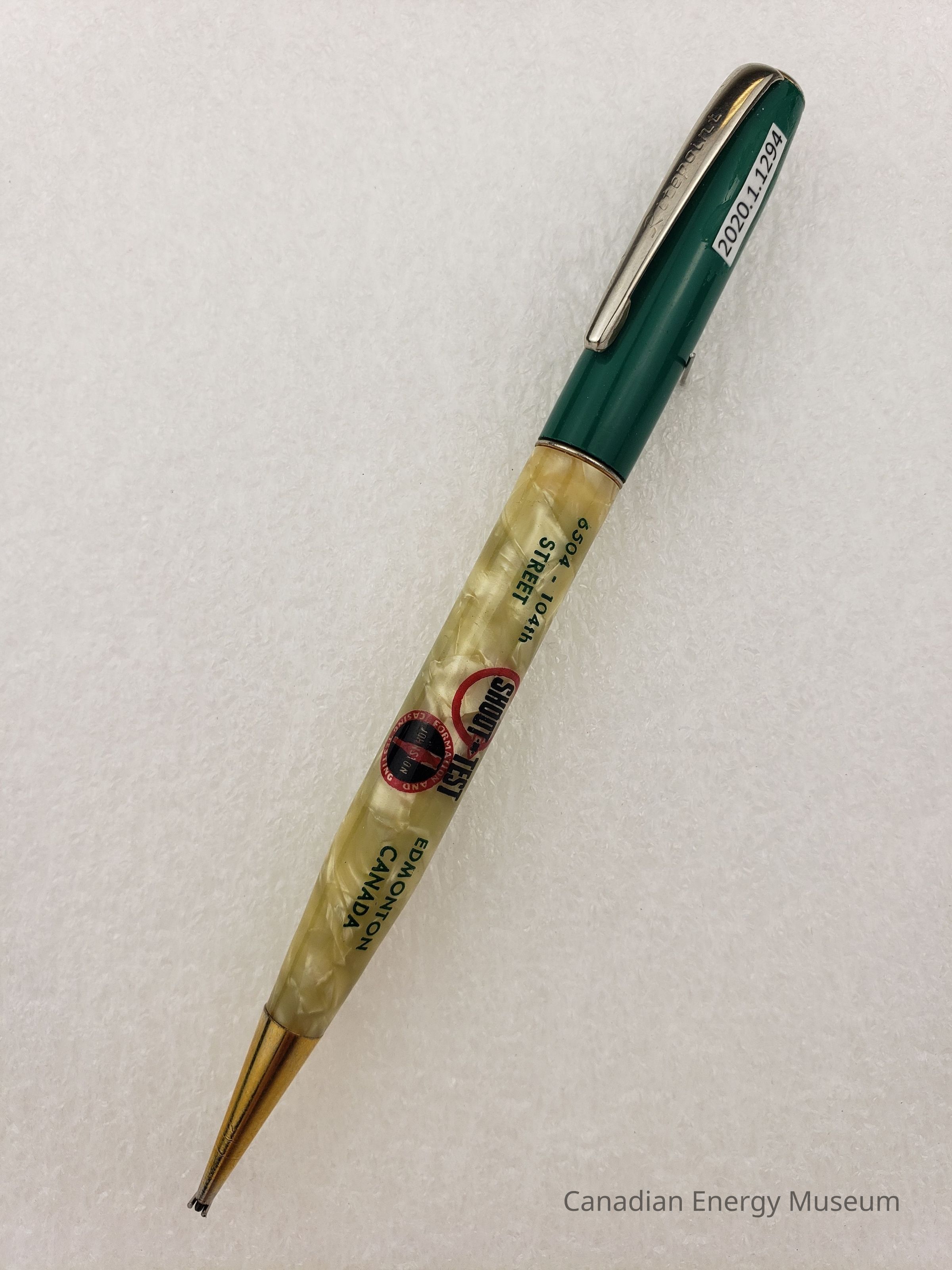 Pen: A mechanical pencil, with a plastic body and metal detailing. The lower body is a pearlized yellow-cream plastic, with green, black, and red print, reading "M. O. JOHNSTON OIL FIELD SERVICE LTD.; 6504 - 104TH STREET; EDMONTON CANADA; PHONE 36115" and a small illustrated logo reading "SHOOT - TEST". The upper body is a plain green plastic. The metal detailing includes a gold-coloured section around the pencil tip; a fine silver-coloured band seporating the yellow-cream and green section; the silver-coloured clip branded to "Ritepoint" with end-cap. The pencil led mechanism is a twist motion at the fine band mentioned above.