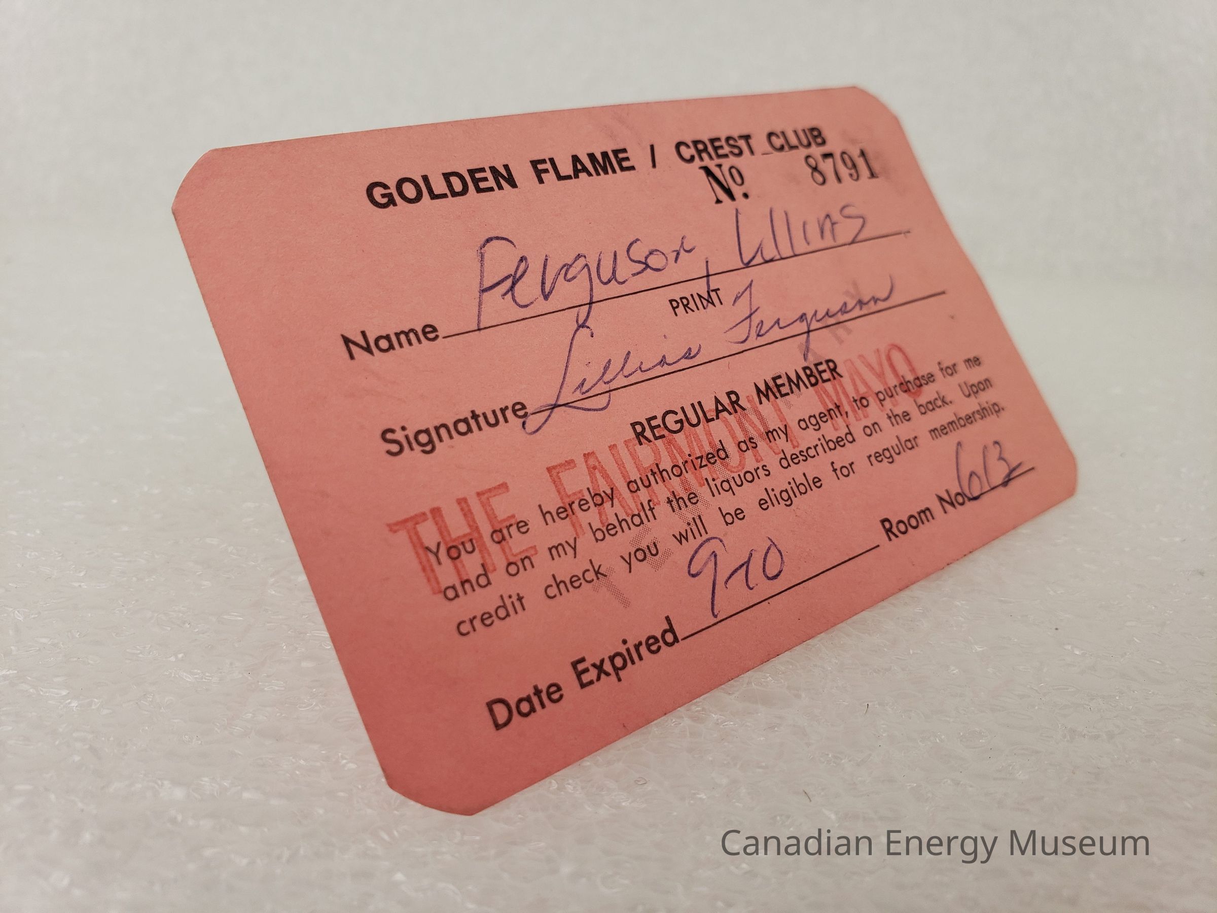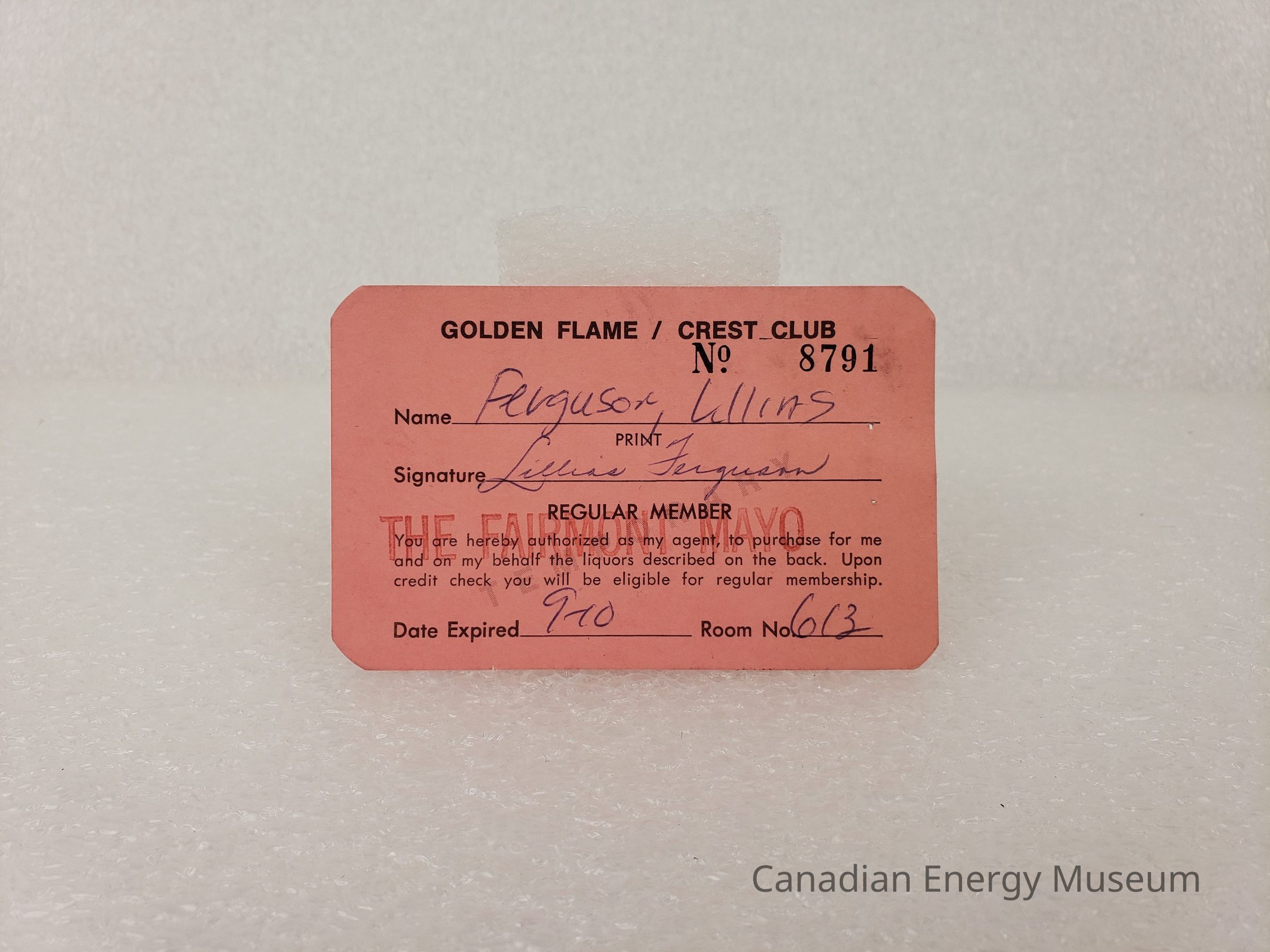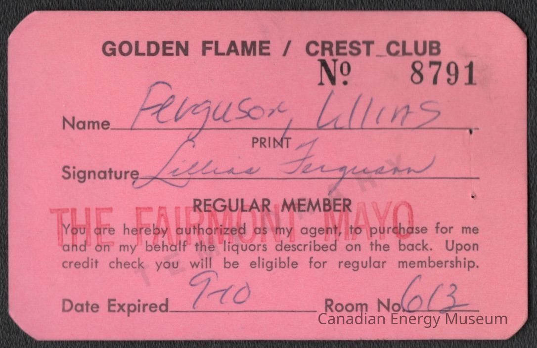 A membership card for the Golden Flame/Crest Club, belonging to Lillias Ferguson.