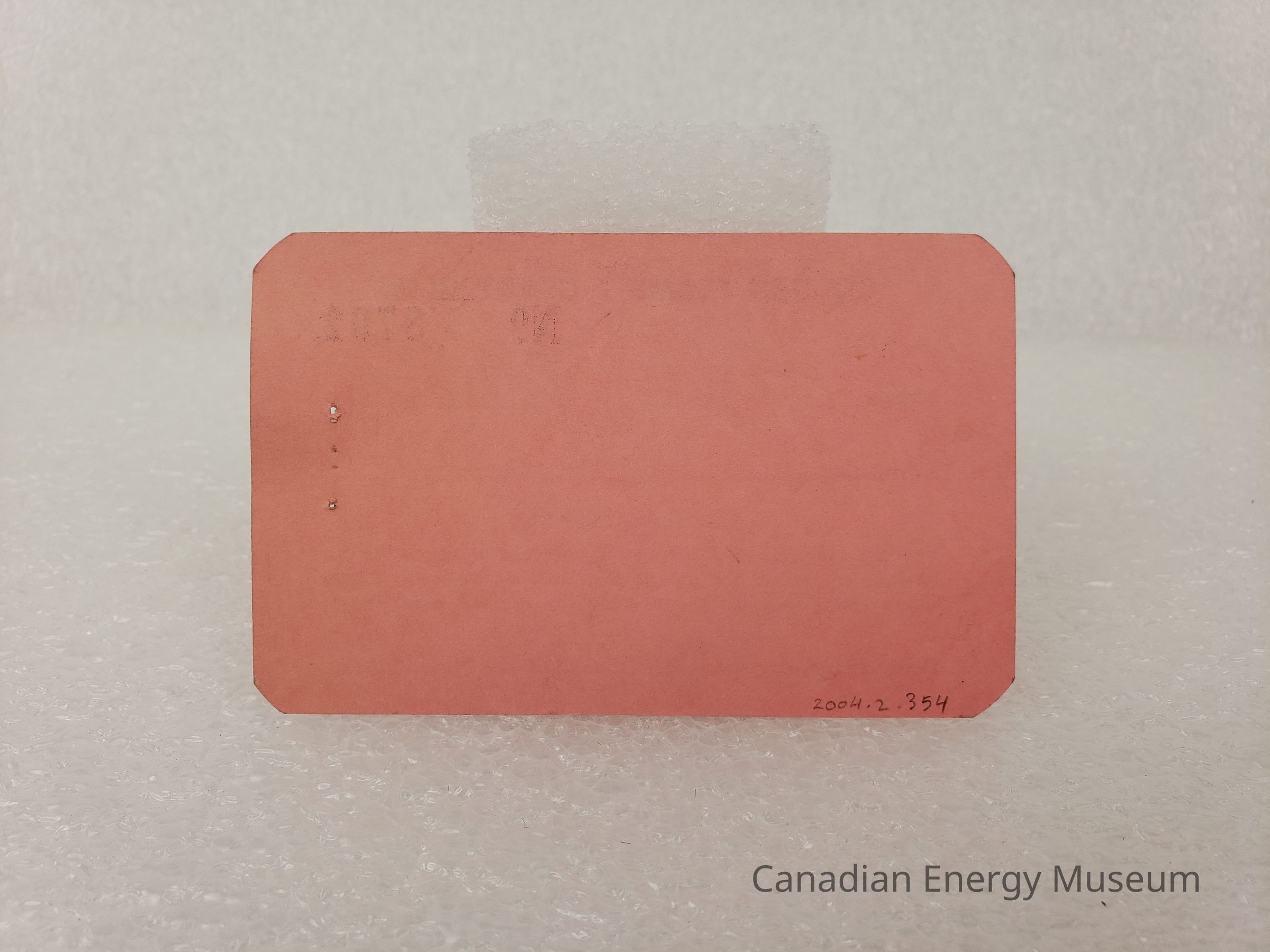 Material: Medium-weight card stock, pink with black print, blue ballpoint, and red stamp ink, rounded corners.