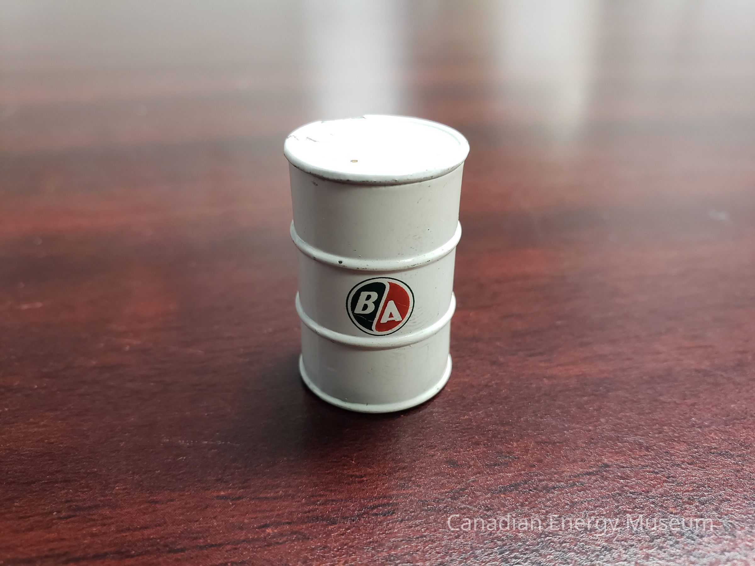 This small model is designed to look like an oil barrel, and on once side bears the British American Oil Company (B/A) logo in green and red. Based on the logo design this was likely produced between 1948-1967. The model is painted in white, and small details include a raised lip around the top and base; two raised bands around the middle; and raised details for the opening of the barrel on the top side of the cylinder.Collection