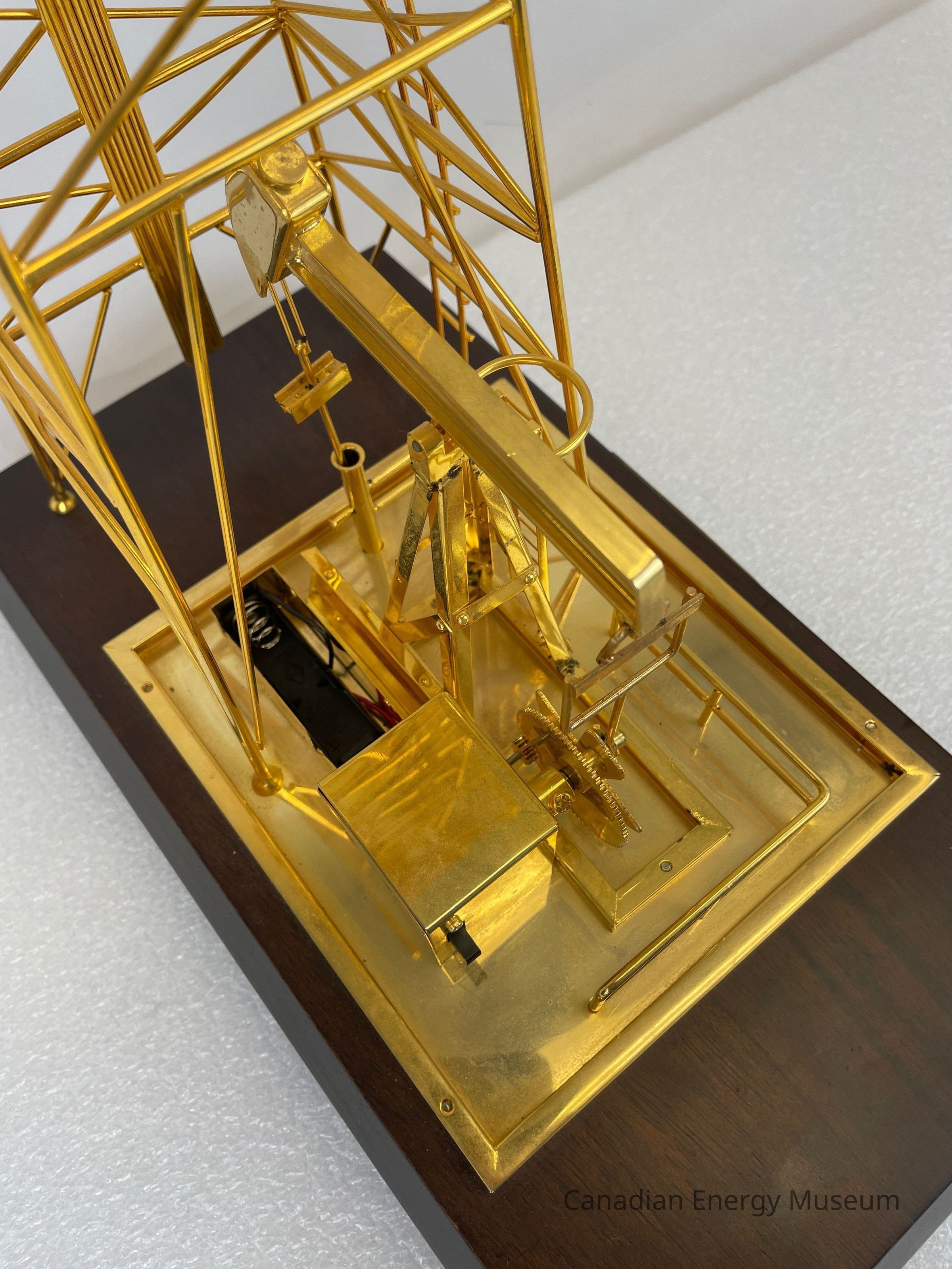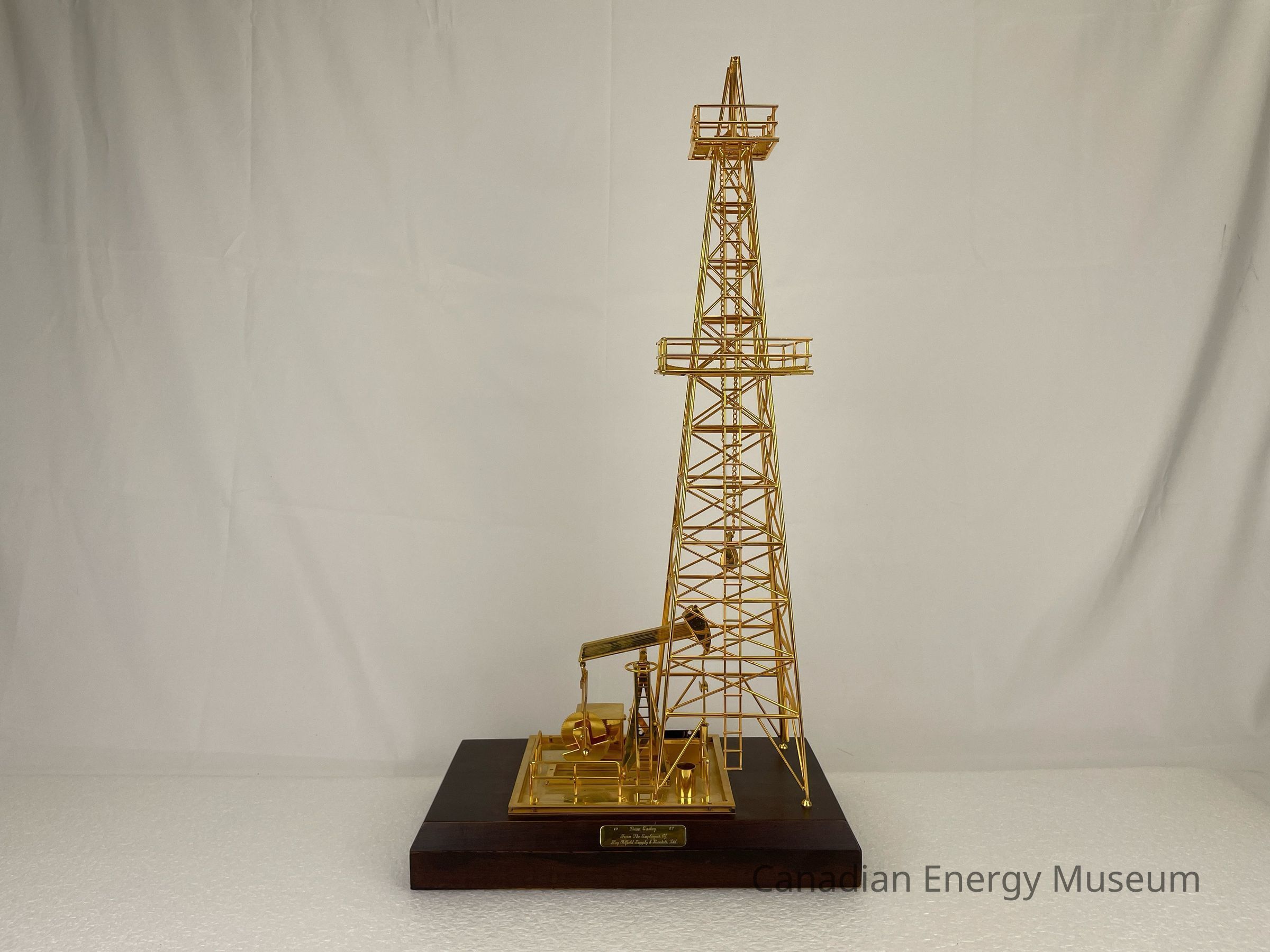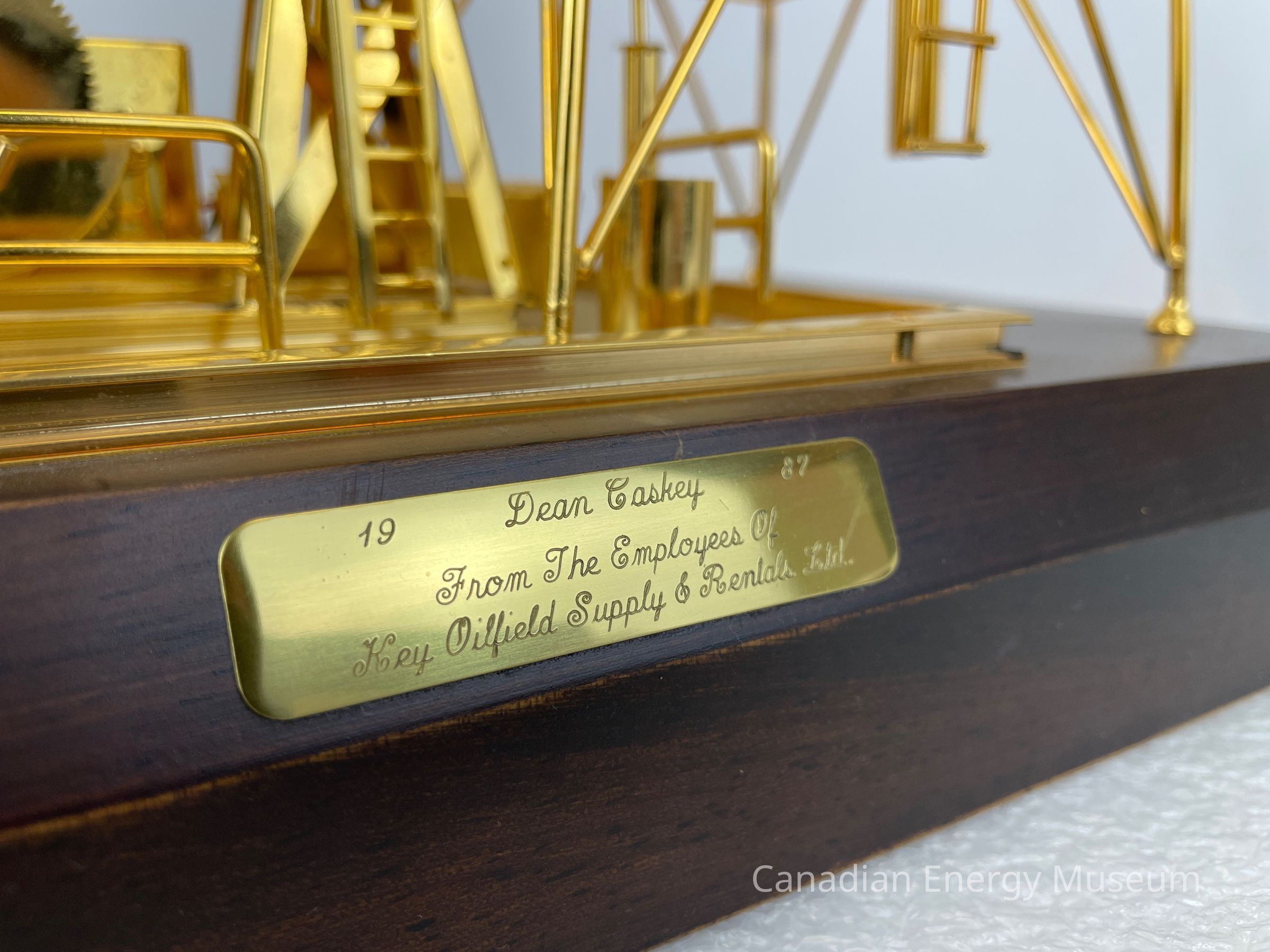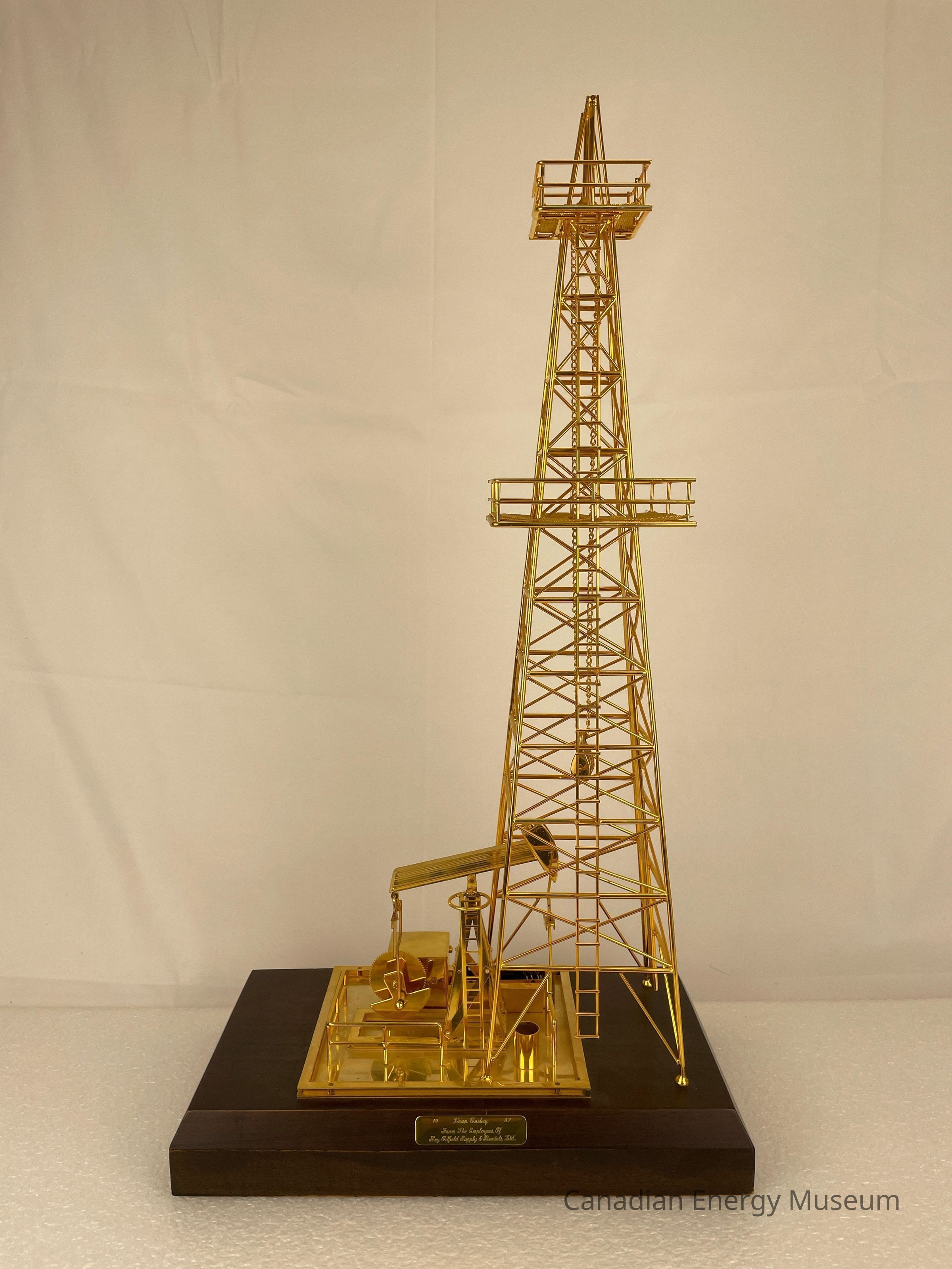 Golden derrick with pump jack overlapping inside. The model is battery-operated, so the pumpjack raises and dips. The wooden base is a dark coloured wood with a gold-plated plaque that reads, "1987 / Dean Caskey / From the Employees of / Key Oilfield Supply & Rentals Ltd." The text on the plaque is etched in a cursive font.Collection