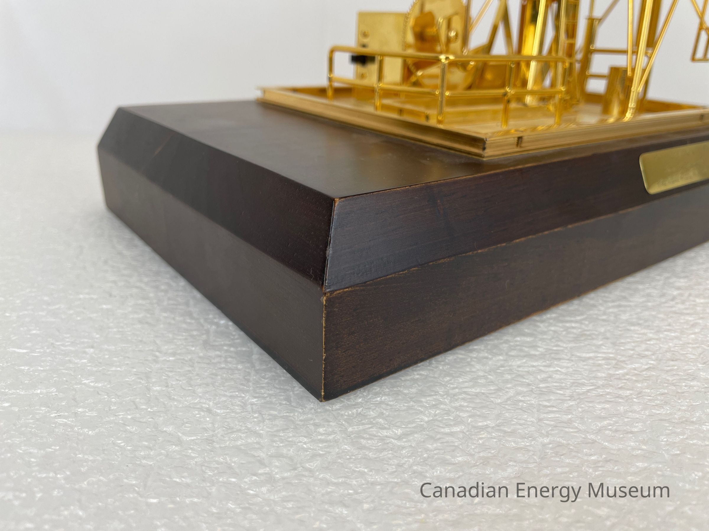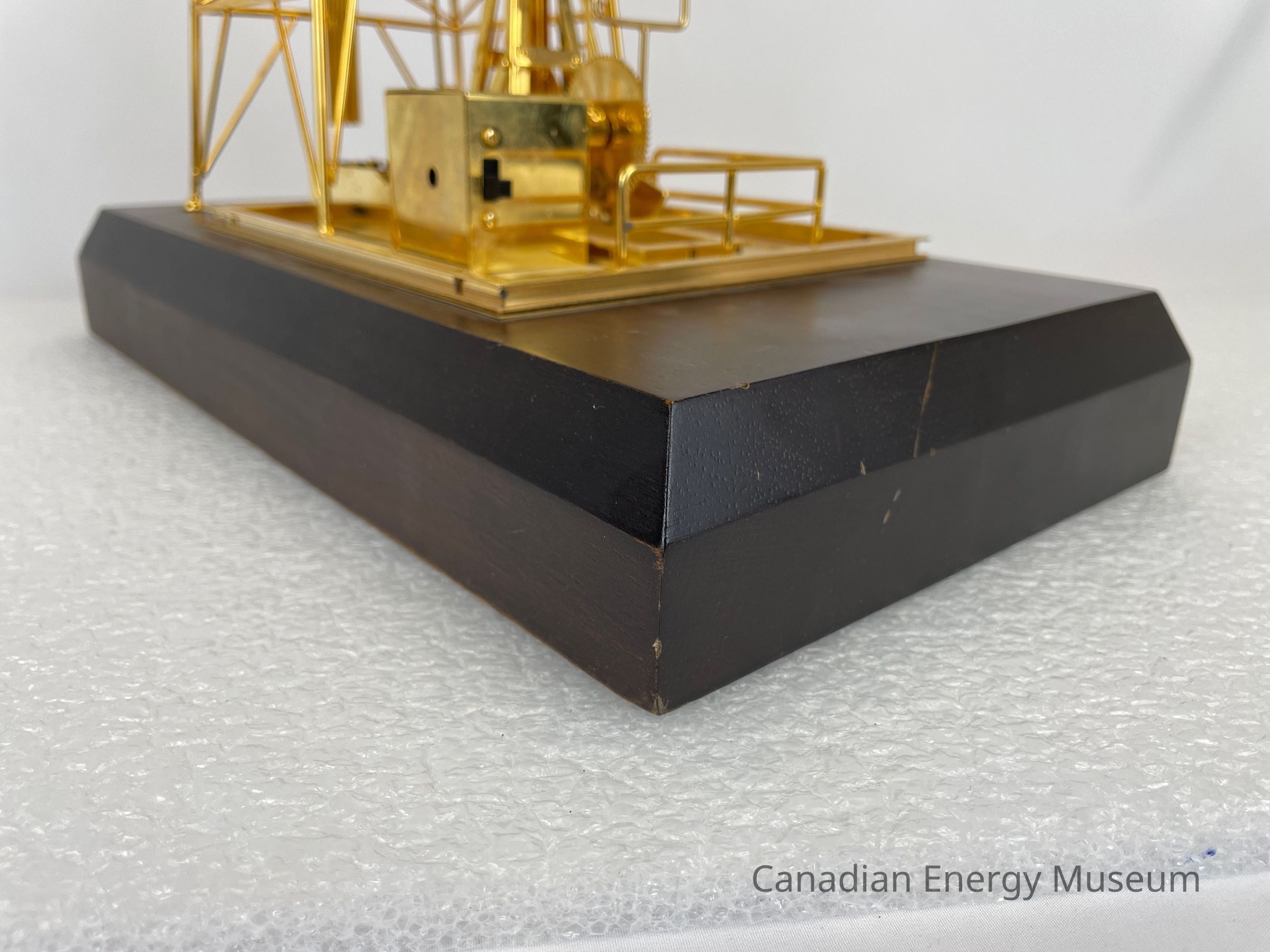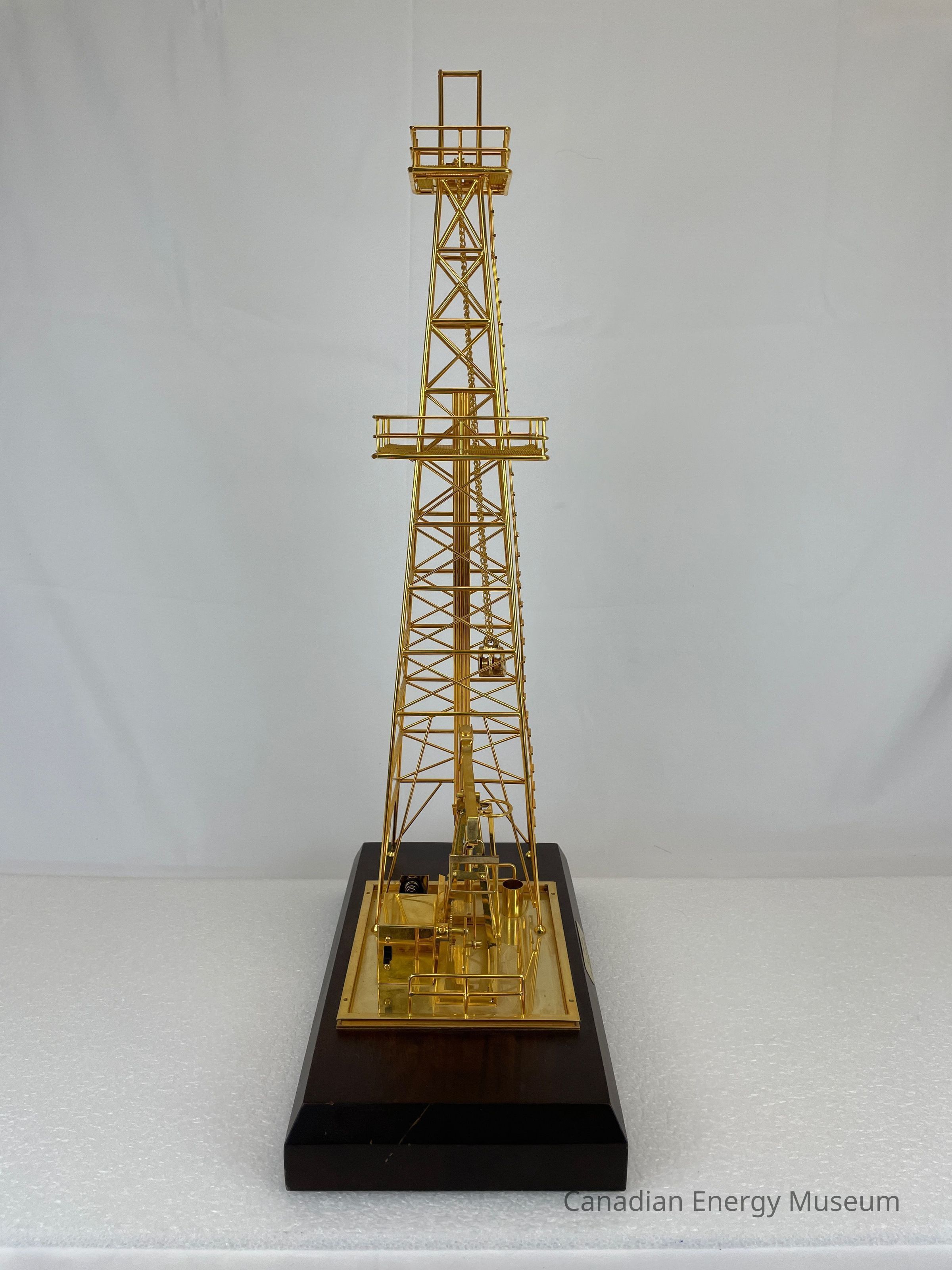 Golden derrick with pump jack overlapping inside. The model is battery-operated, so the pumpjack raises and dips. The wooden base is a dark coloured wood with a gold-plated plaque that reads, "1987 / Dean Caskey / From the Employees of / Key Oilfield Supply & Rentals Ltd." The text on the plaque is etched in a cursive font.Collection