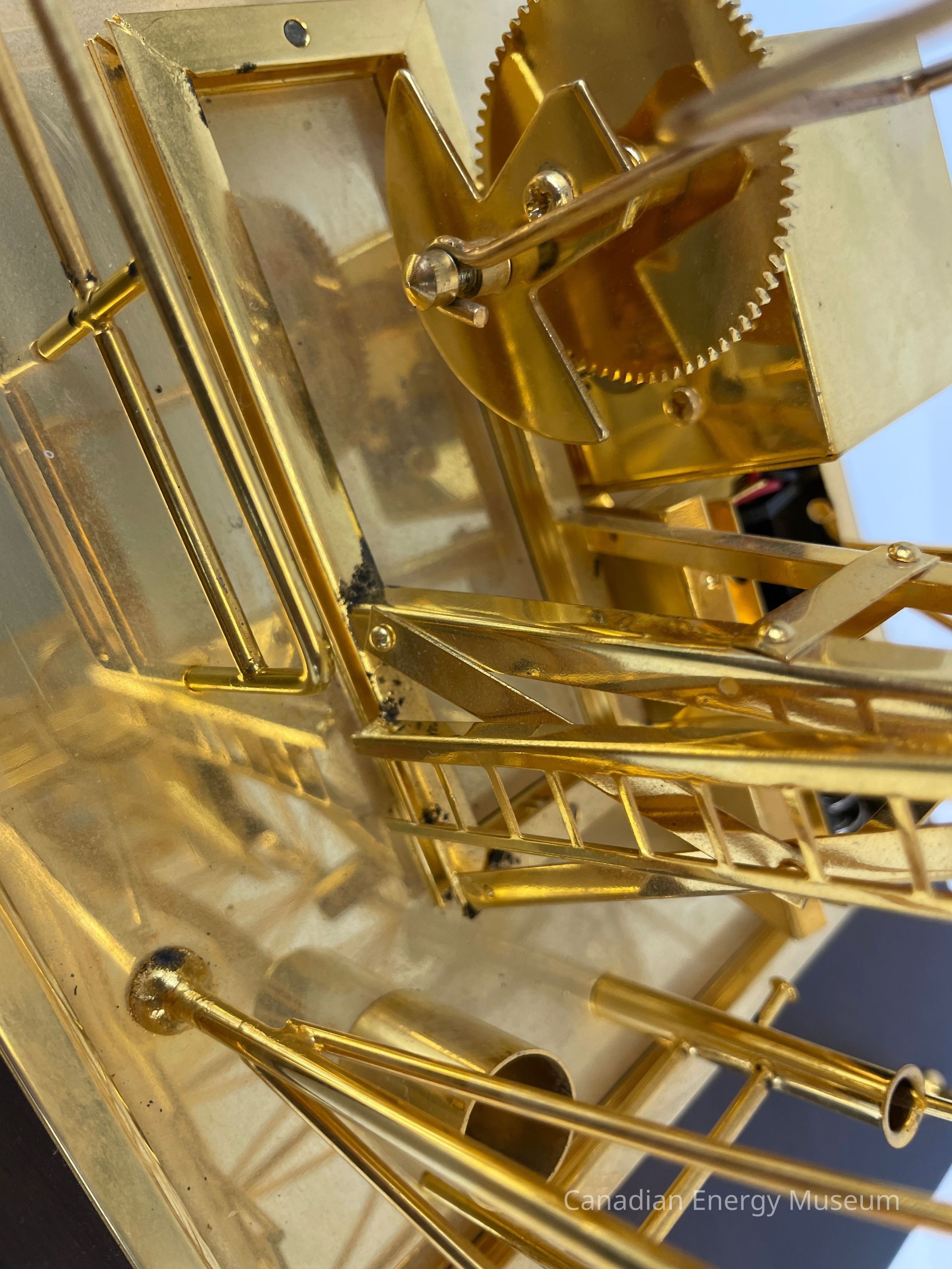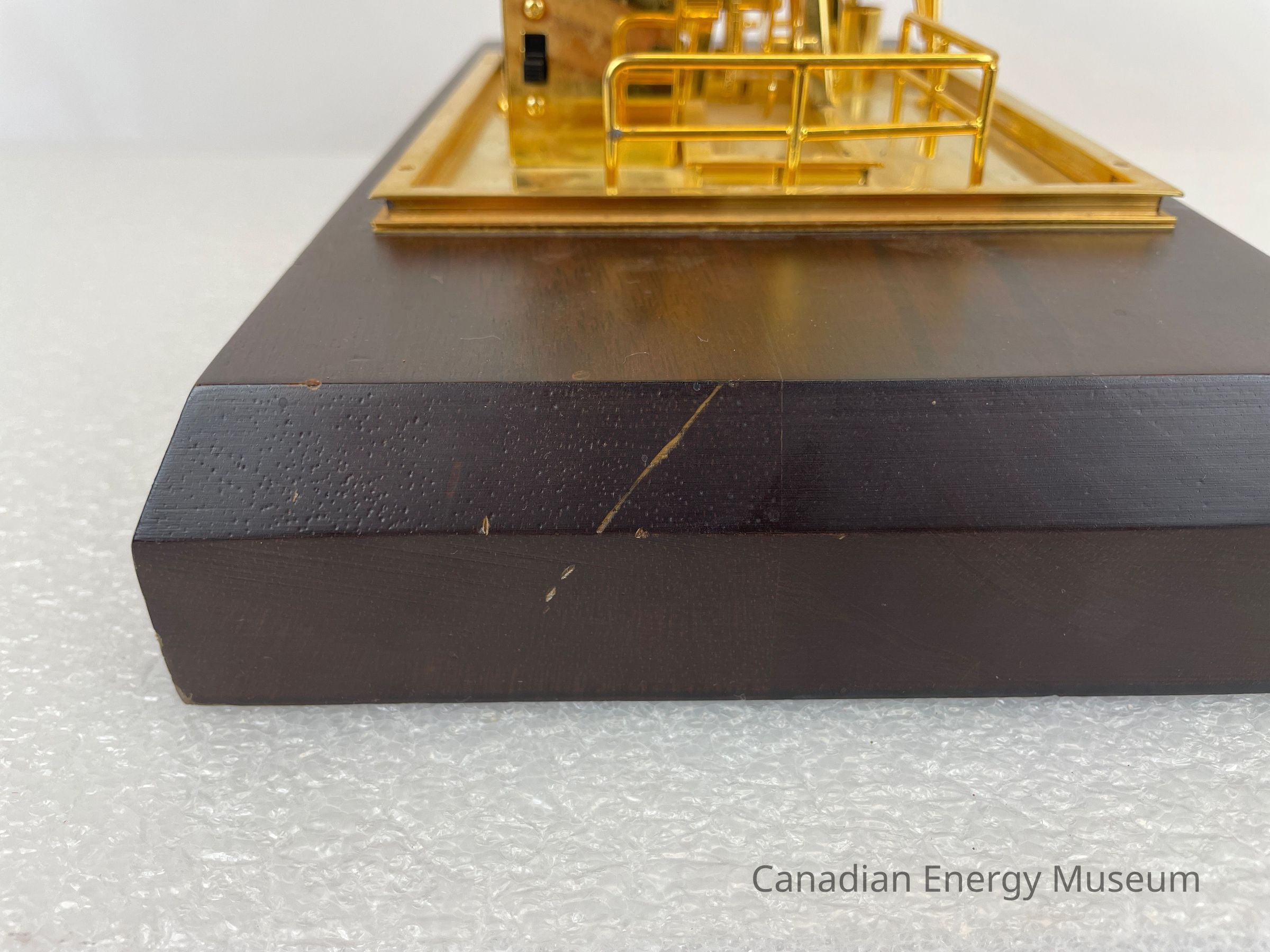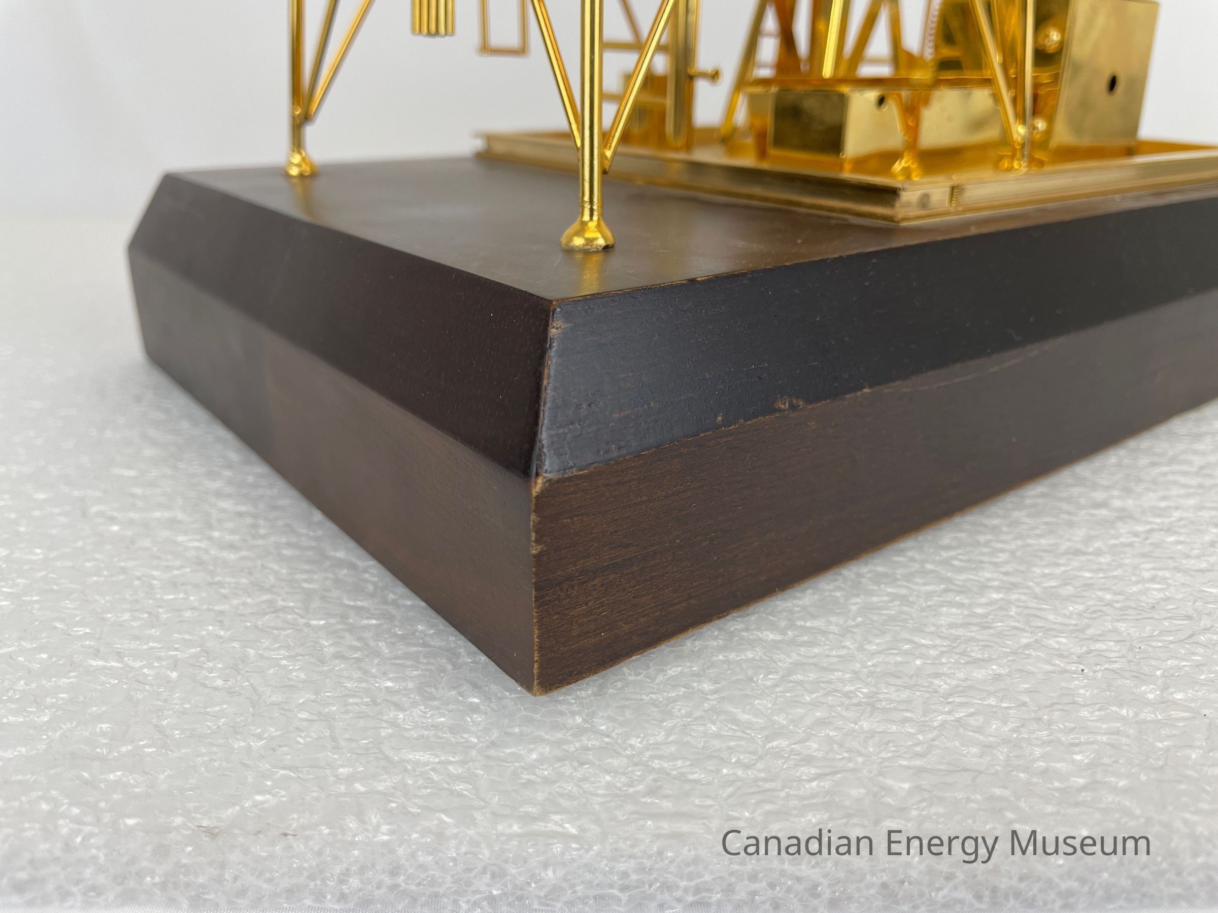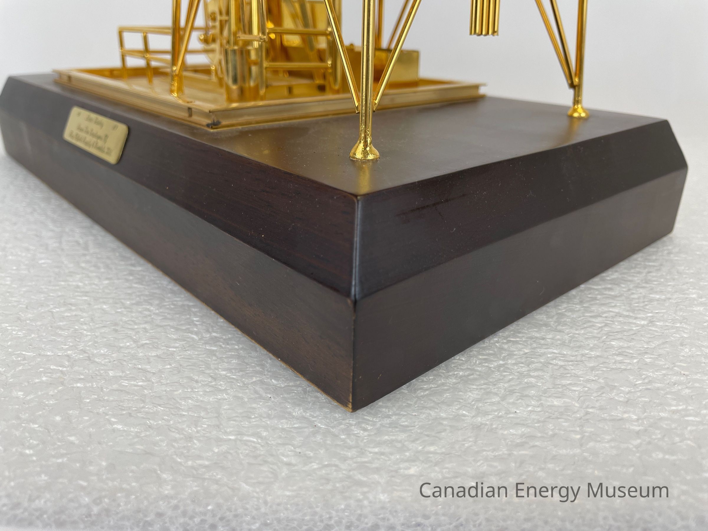 Golden derrick with pump jack overlapping inside. The model is battery-operated, so the pumpjack raises and dips. The wooden base is a dark coloured wood with a gold-plated plaque that reads, "1987 / Dean Caskey / From the Employees of / Key Oilfield Supply & Rentals Ltd." The text on the plaque is etched in a cursive font.Collection
