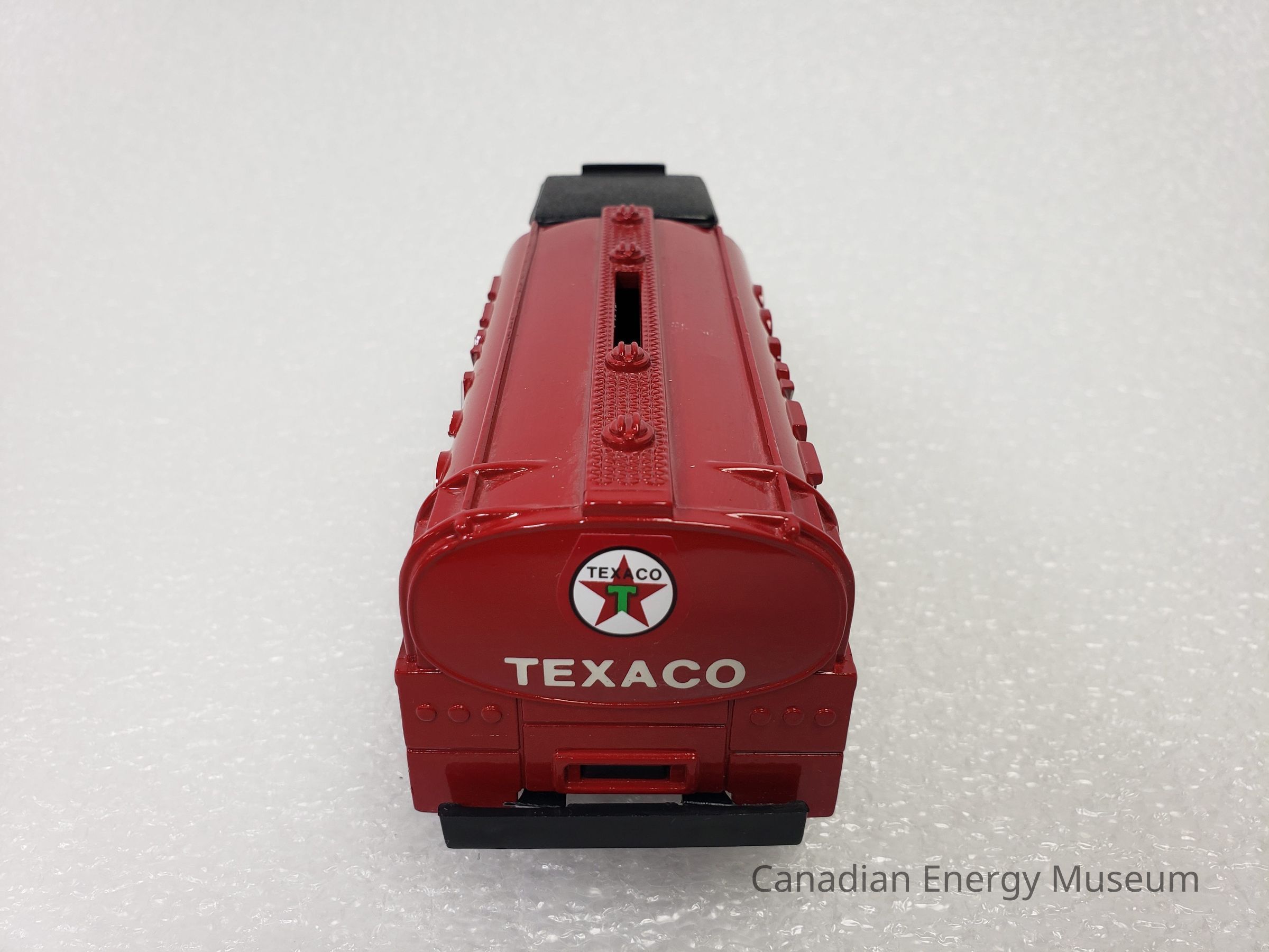 The piece is comprised of metal, plastic, and rubber. The cab and tank of the vehicle are red metal, with black metal running boards/mudguards. The vehicle has branding for Texaco, in the form of a round star logo on the passenger’s door, the raised text “TEXACO” on the left and right sides of the tank, and the round star logo and "TEXACO" text on the rear of the tank. There is also a small text "TEXACO" label above the widescreen of the cab. Other moulded features in the metal are a raised strip along the top of the tank with four raised domes; radiator elements on the hood of the cab; and taillights and licence plate on the rear. Plastic elements include those on the interior (black console, steering wheel, and bench seat), the cab roof (black with a canvas texture), the grill and headlights (silver), front and rear bumpers (black), the wheel spokes (red), and the undercarriage (black). There are eleven wheels total, with two wheels at the front of the vehicle; a spare mounted on the driver's door; and eight wheels at the back of the vehicle in a configuration of four sets of two. The tires are black rubber with the ERTL text logo in the moulding and are functional with a full range of motion. The tanker portion of the vehicle acts as a money bank, with a slit at the top, and a locking closure on the underside (key attached). On the plastic underside of the vehicle are moulded wheel axles, the model's manufacturer's marks, and the serial number (debossed stamp).