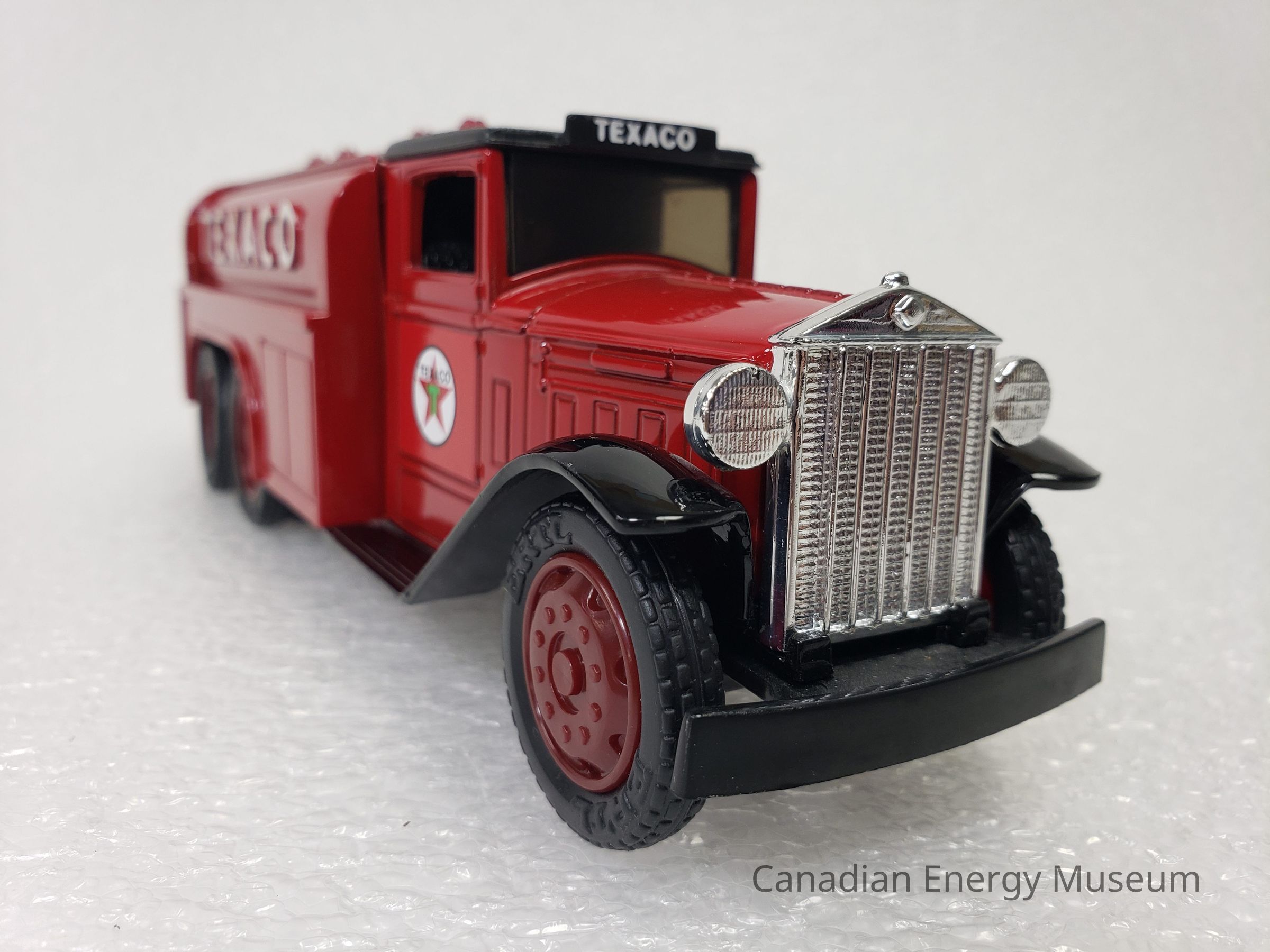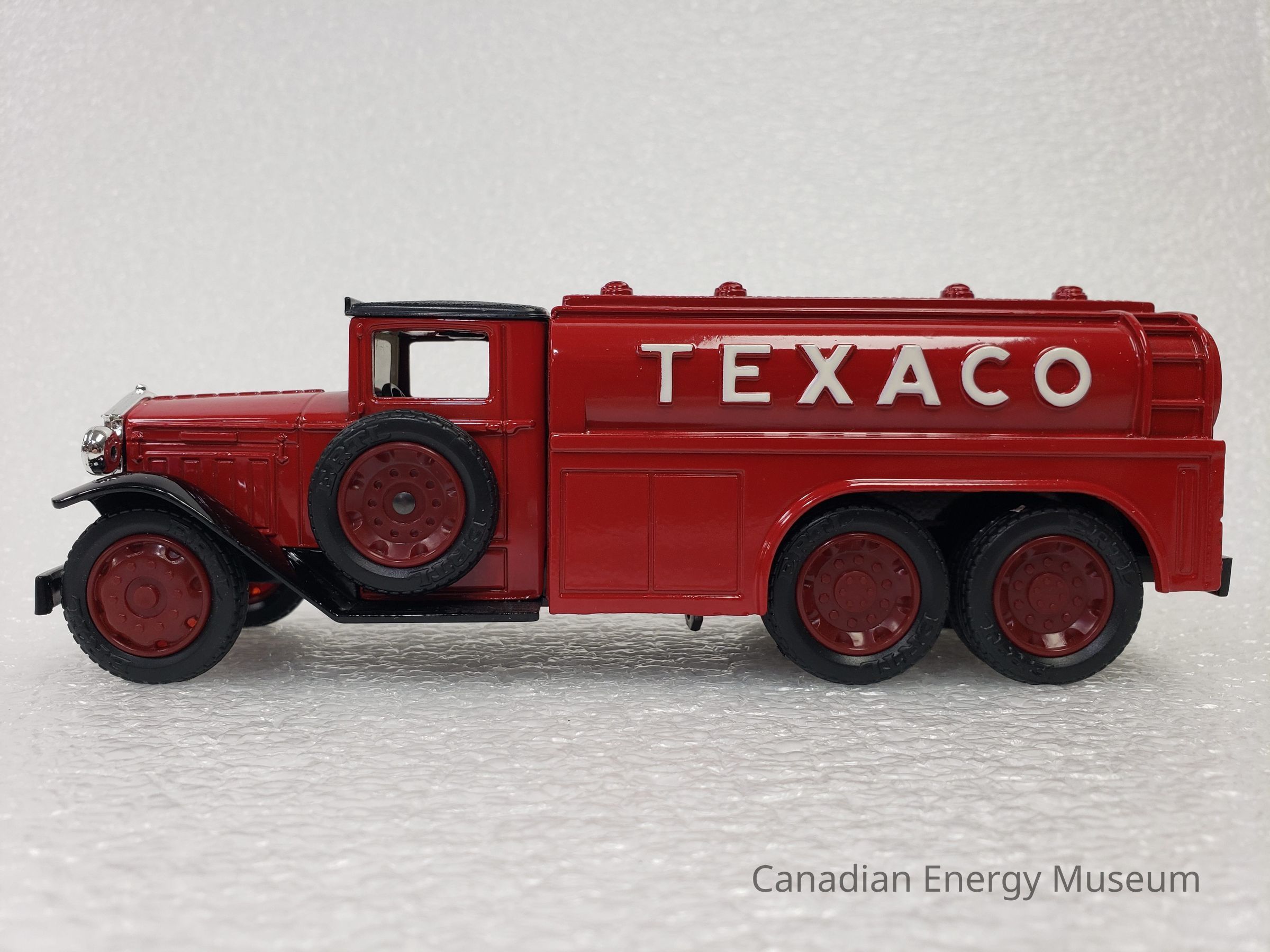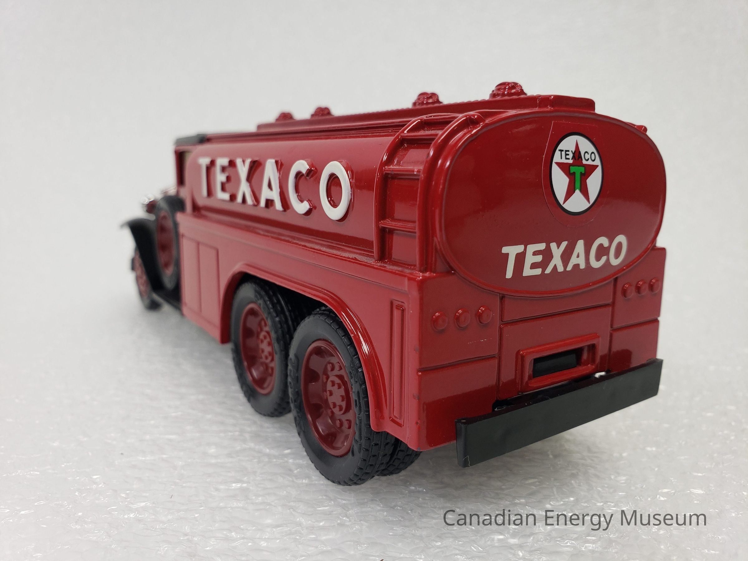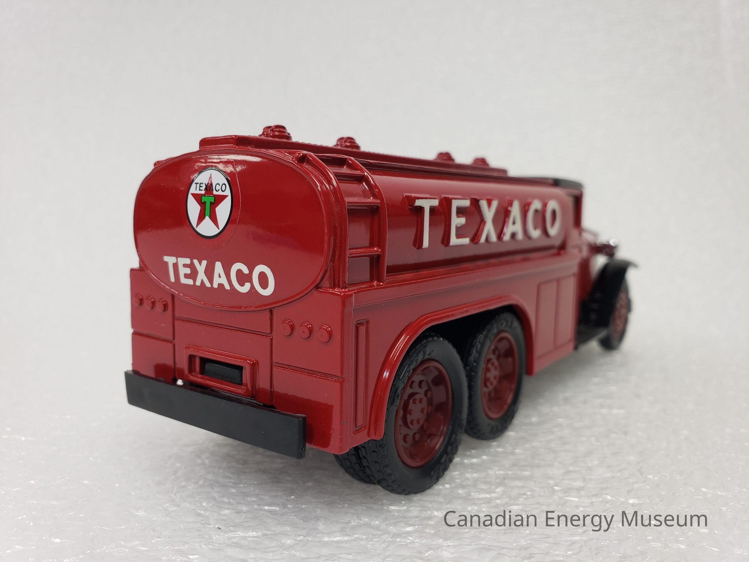 This particular model is a replica of a 1930 Diamond T Fuel Tanker (produced by Diamond Reo Trucks), which is one of the vehicles used by Texaco Jobbers (the middleman between the company that refines the petroleum products and buyers and retailers) and other distributors when delivering products in the 1930s. It is also the model of fuel tanker that was used to transport the first oil produced by Leduc #1.