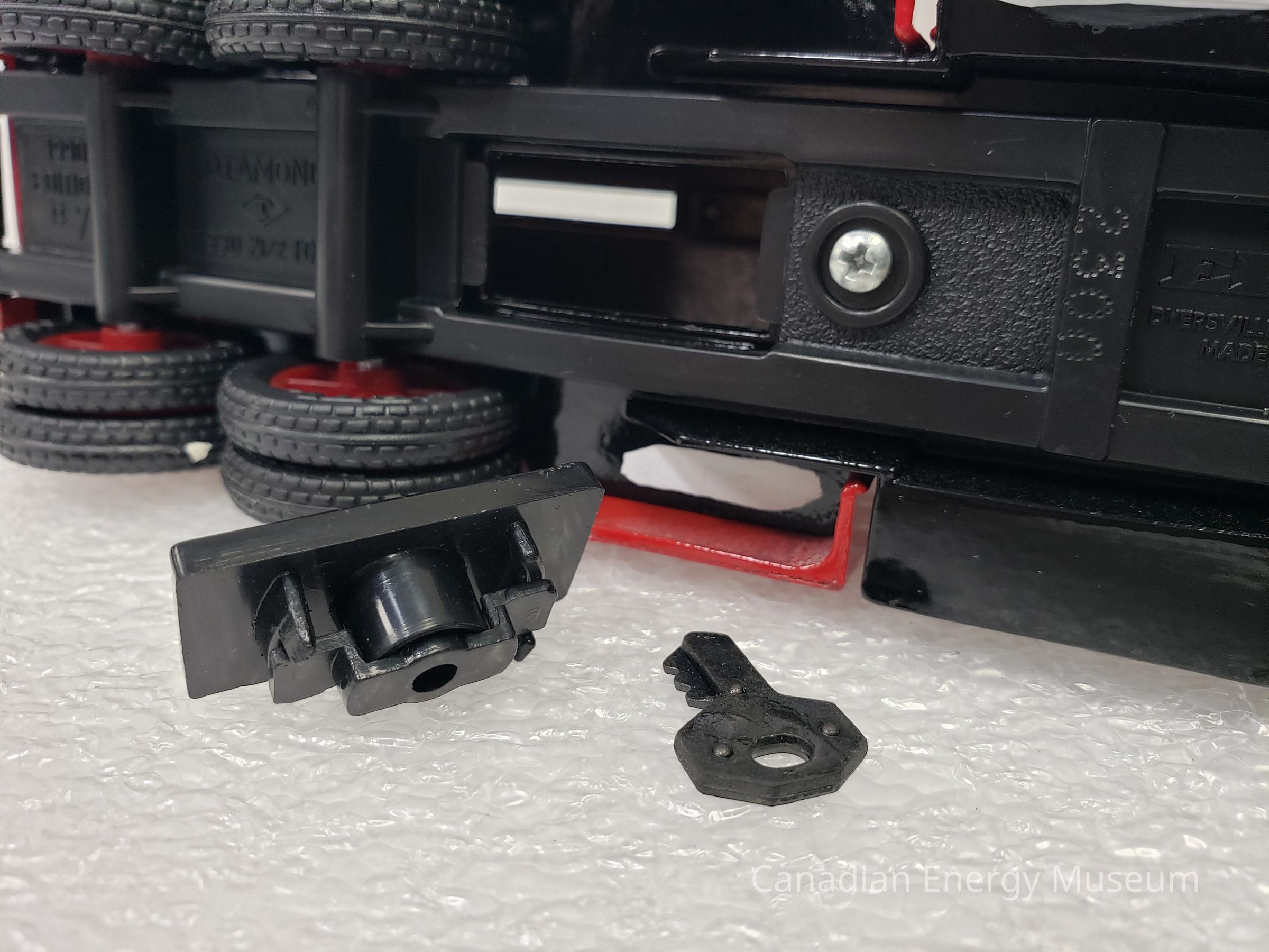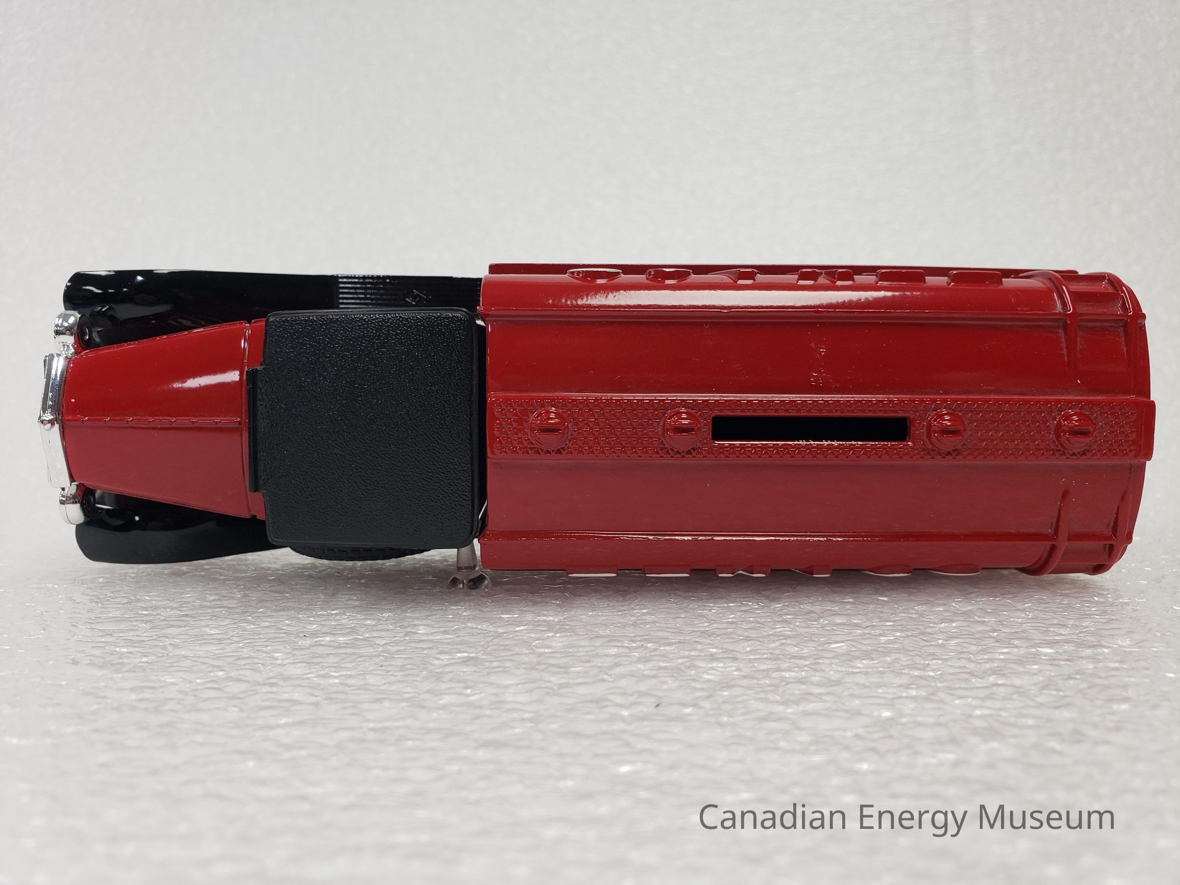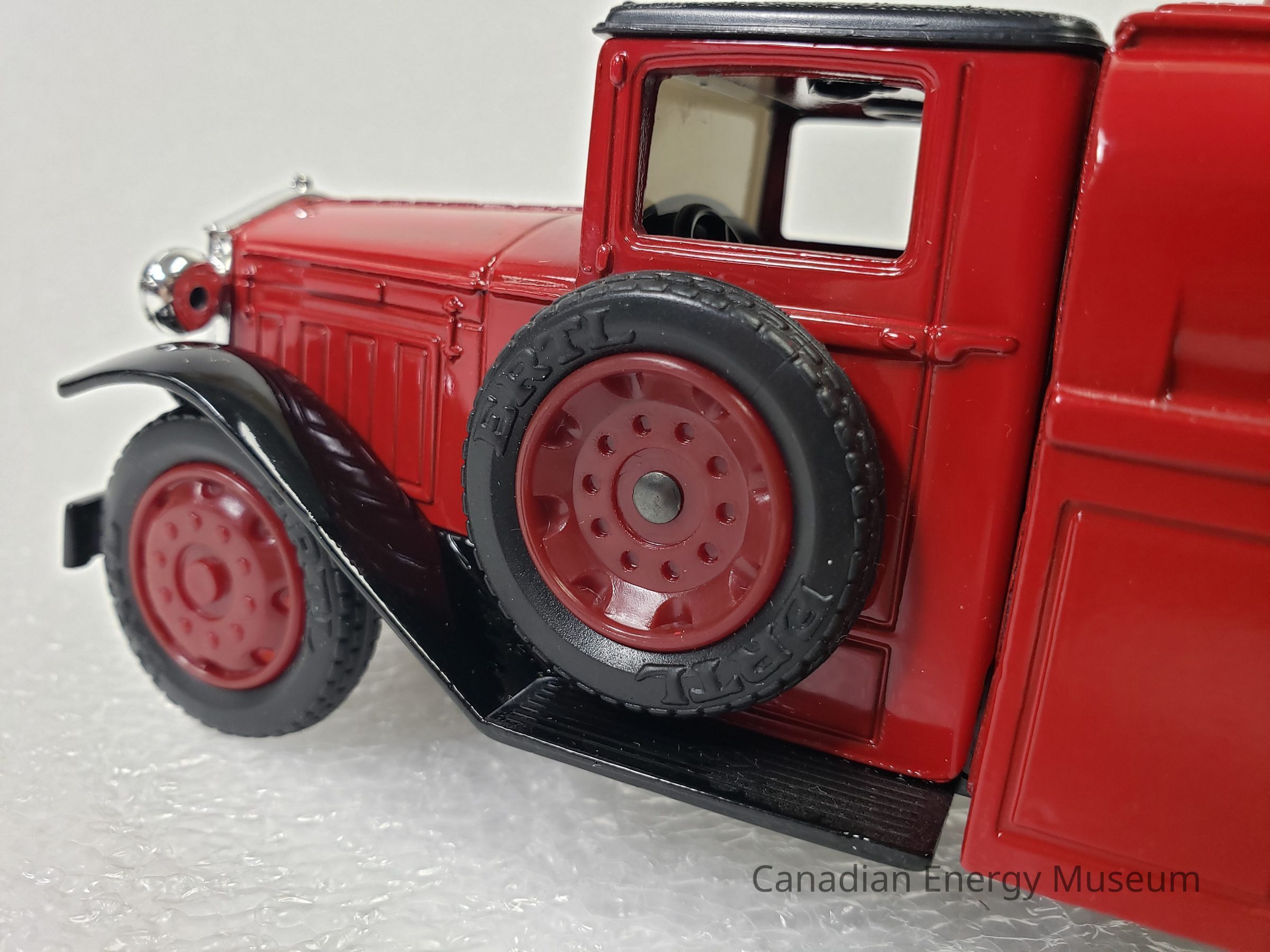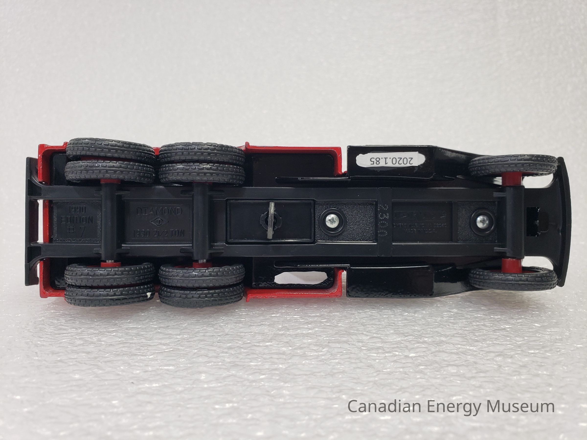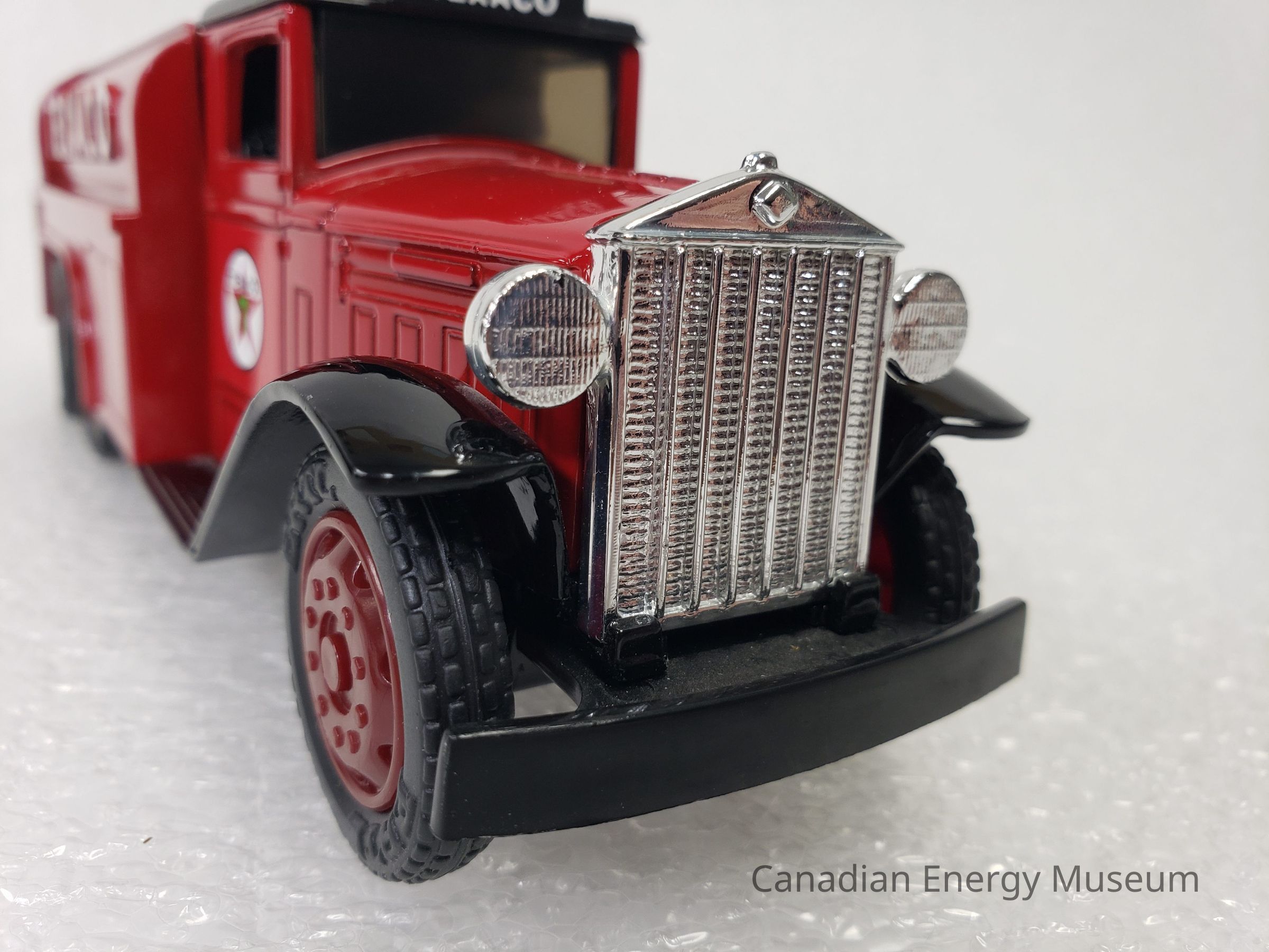This particular model is a replica of a 1930 Diamond T Fuel Tanker (produced by Diamond Reo Trucks), which is one of the vehicles used by Texaco Jobbers (the middleman between the company that refines the petroleum products and buyers and retailers) and other distributors when delivering products in the 1930s. It is also the model of fuel tanker that was used to transport the first oil produced by Leduc #1.