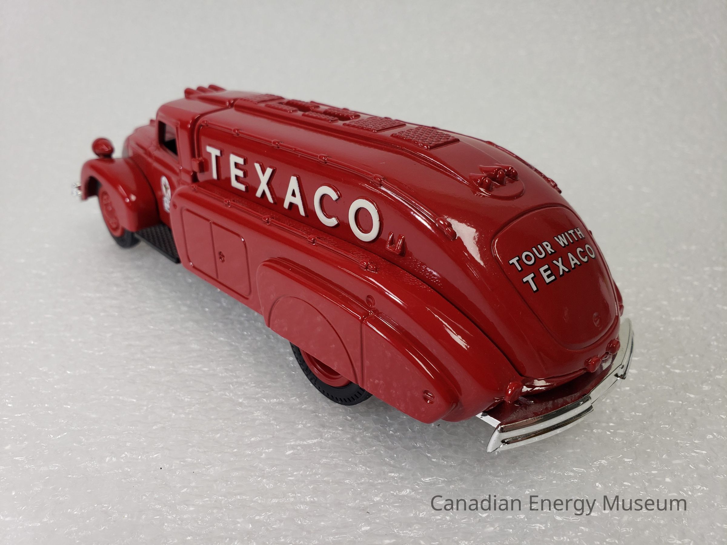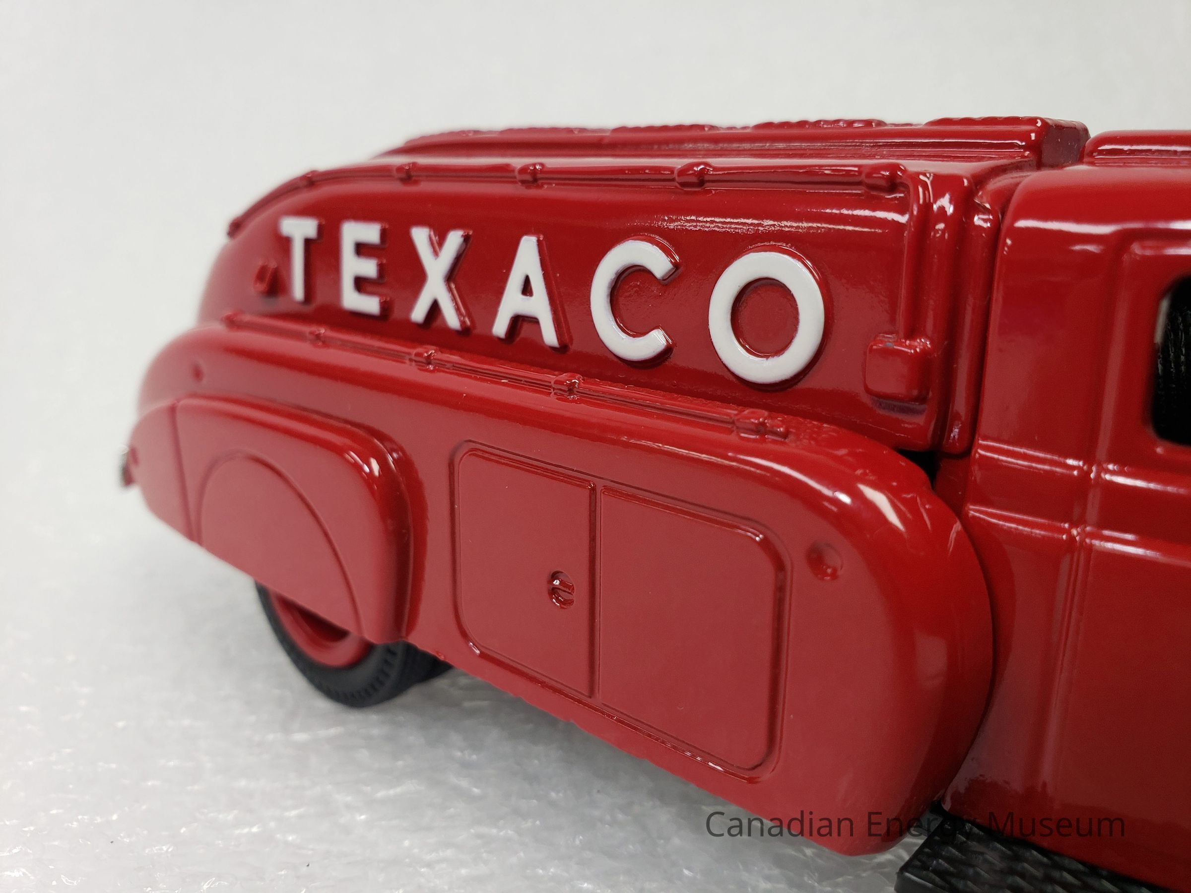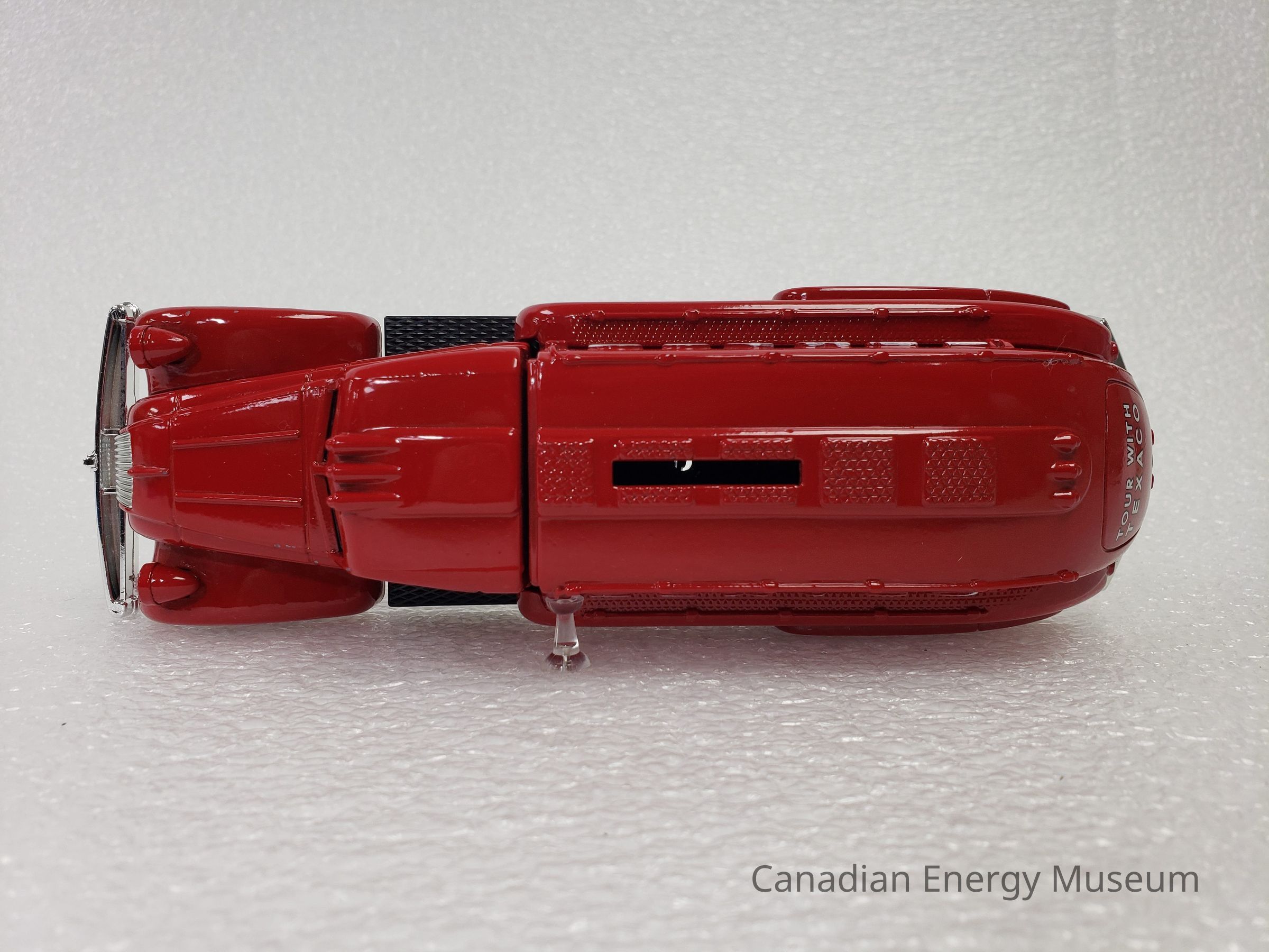 The piece is comprised of metal, plastic, and rubber. The cab and tank of the vehicle are red metal; and has moulded features in the metal including headlights (with clear plastic 'glass'), roof lights, rear lights, a raised strip along the top of the tank with five squares of diamond textured panels, handlebars along each side of the tank, and taillights. Plastic elements include those on the interior (black console, steering wheel, and bench seat), the grill (silver), the bulbs in the headlights (clear), front and rear bumpers (silver), the hubcaps (red), the driver's and passenger's side steps (black, diamond texture) and the undercarriage (black). The vehicle has branding for Texaco, in the form of a round star logo with the text "THE TEXAS COMPANY" below, on the driver's and passenger’s doors, the raised text “TEXACO” on the left and right sides of the tank, and the text "TOUR WITH TEXICO" on the rear of the tank. There are six wheels total, with two wheels at the front of the vehicle and four wheels at the back of the vehicle in a configuration of two sets of two. The tires are black rubber with the ERTL text logo in the moulding and are functional with a full range of motion. The tanker portion of the vehicle acts as a money bank, with a slit at the top, and a locking closure on the underside (key attached). On the plastic underside of the vehicle are moulded wheel axles, the model's manufacturer's marks, and the serial number (debossed stamp).