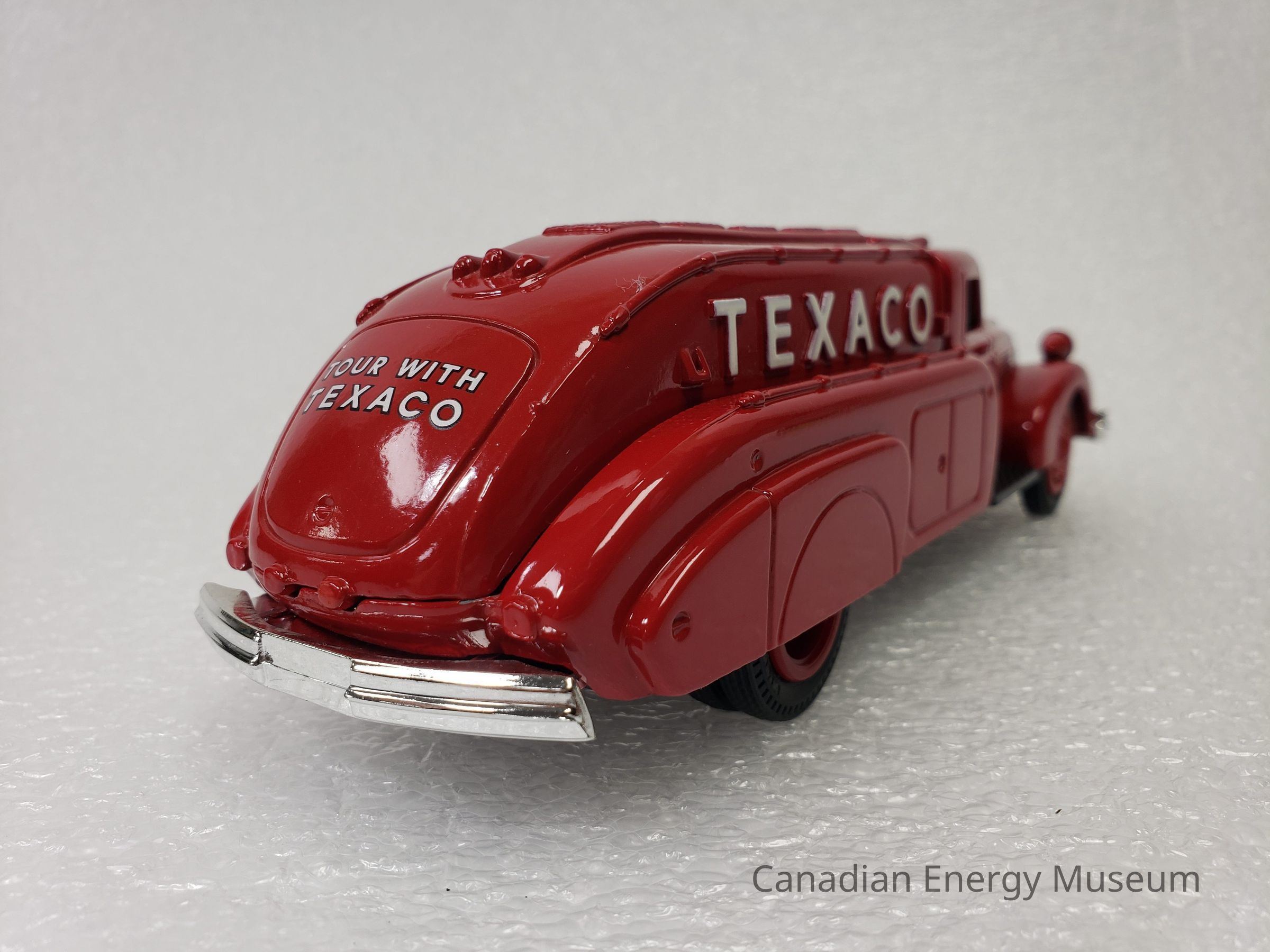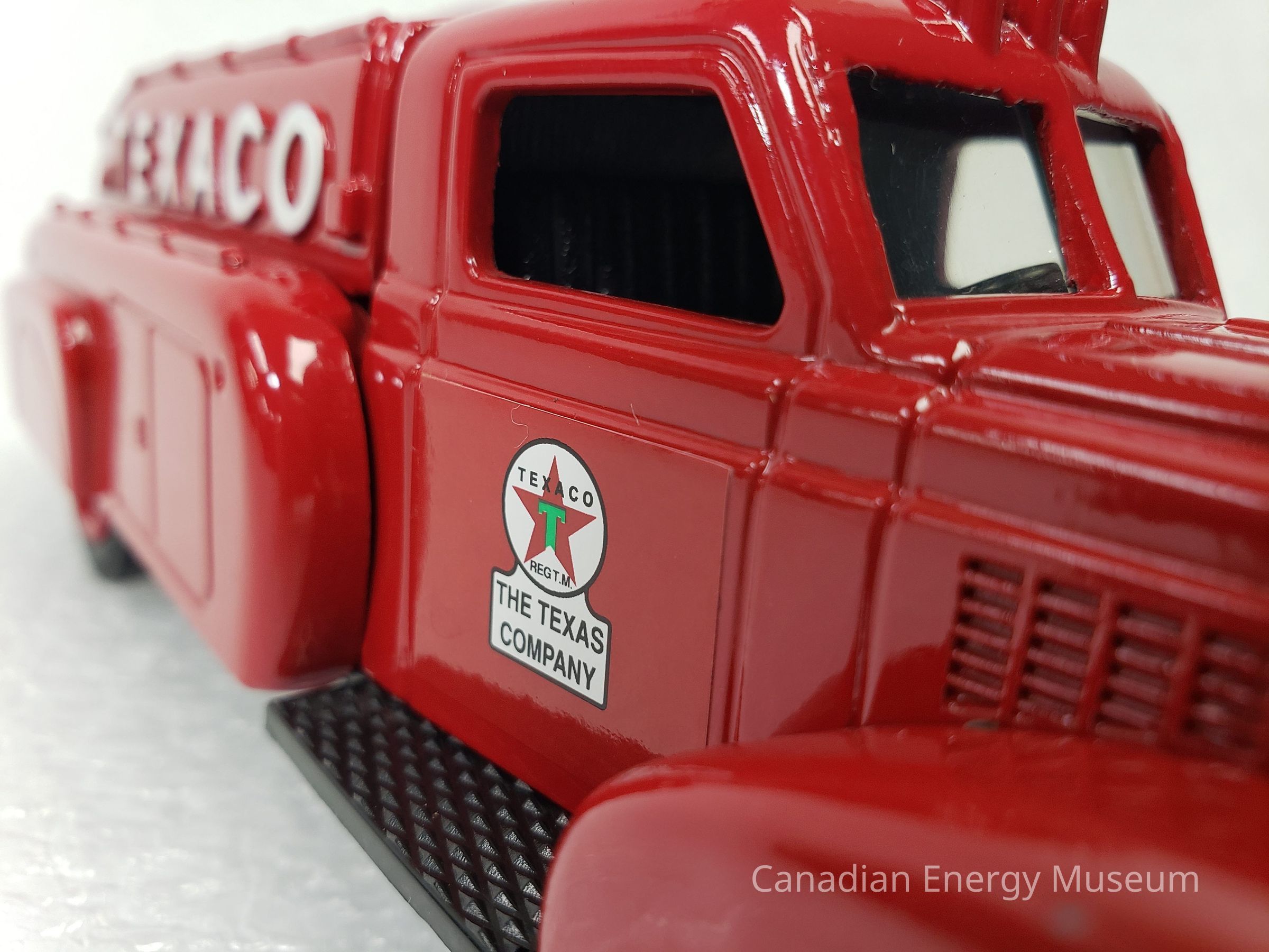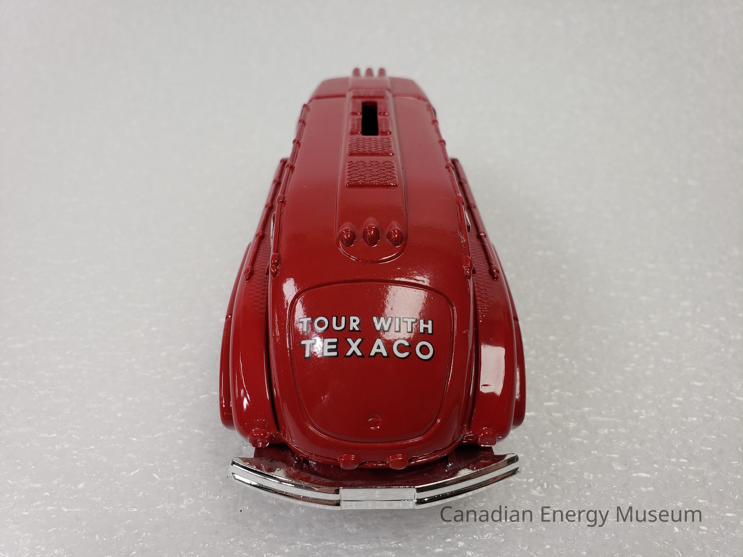 The piece is comprised of metal, plastic, and rubber. The cab and tank of the vehicle are red metal; and has moulded features in the metal including headlights (with clear plastic 'glass'), roof lights, rear lights, a raised strip along the top of the tank with five squares of diamond textured panels, handlebars along each side of the tank, and taillights. Plastic elements include those on the interior (black console, steering wheel, and bench seat), the grill (silver), the bulbs in the headlights (clear), front and rear bumpers (silver), the hubcaps (red), the driver's and passenger's side steps (black, diamond texture) and the undercarriage (black). The vehicle has branding for Texaco, in the form of a round star logo with the text "THE TEXAS COMPANY" below, on the driver's and passenger’s doors, the raised text “TEXACO” on the left and right sides of the tank, and the text "TOUR WITH TEXICO" on the rear of the tank. There are six wheels total, with two wheels at the front of the vehicle and four wheels at the back of the vehicle in a configuration of two sets of two. The tires are black rubber with the ERTL text logo in the moulding and are functional with a full range of motion. The tanker portion of the vehicle acts as a money bank, with a slit at the top, and a locking closure on the underside (key attached). On the plastic underside of the vehicle are moulded wheel axles, the model's manufacturer's marks, and the serial number (debossed stamp).