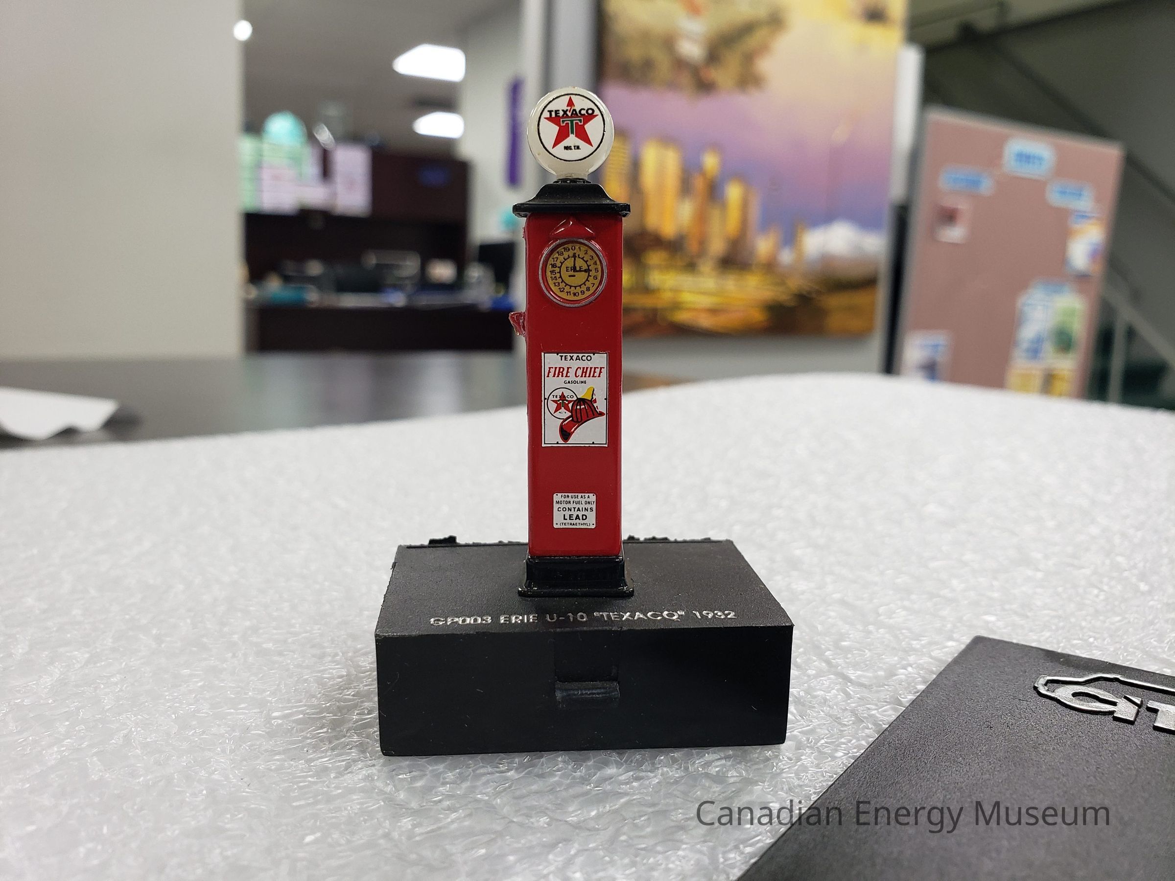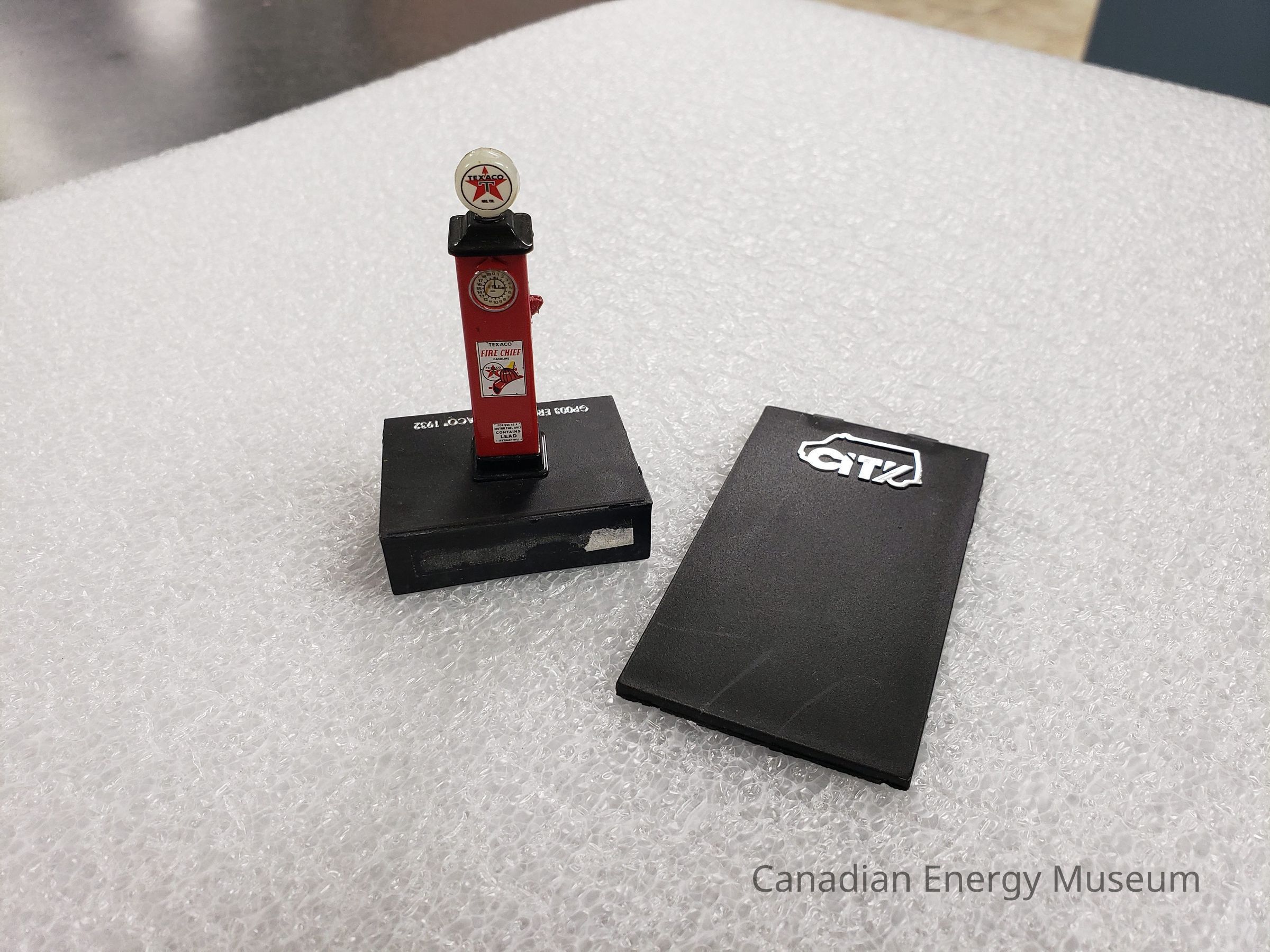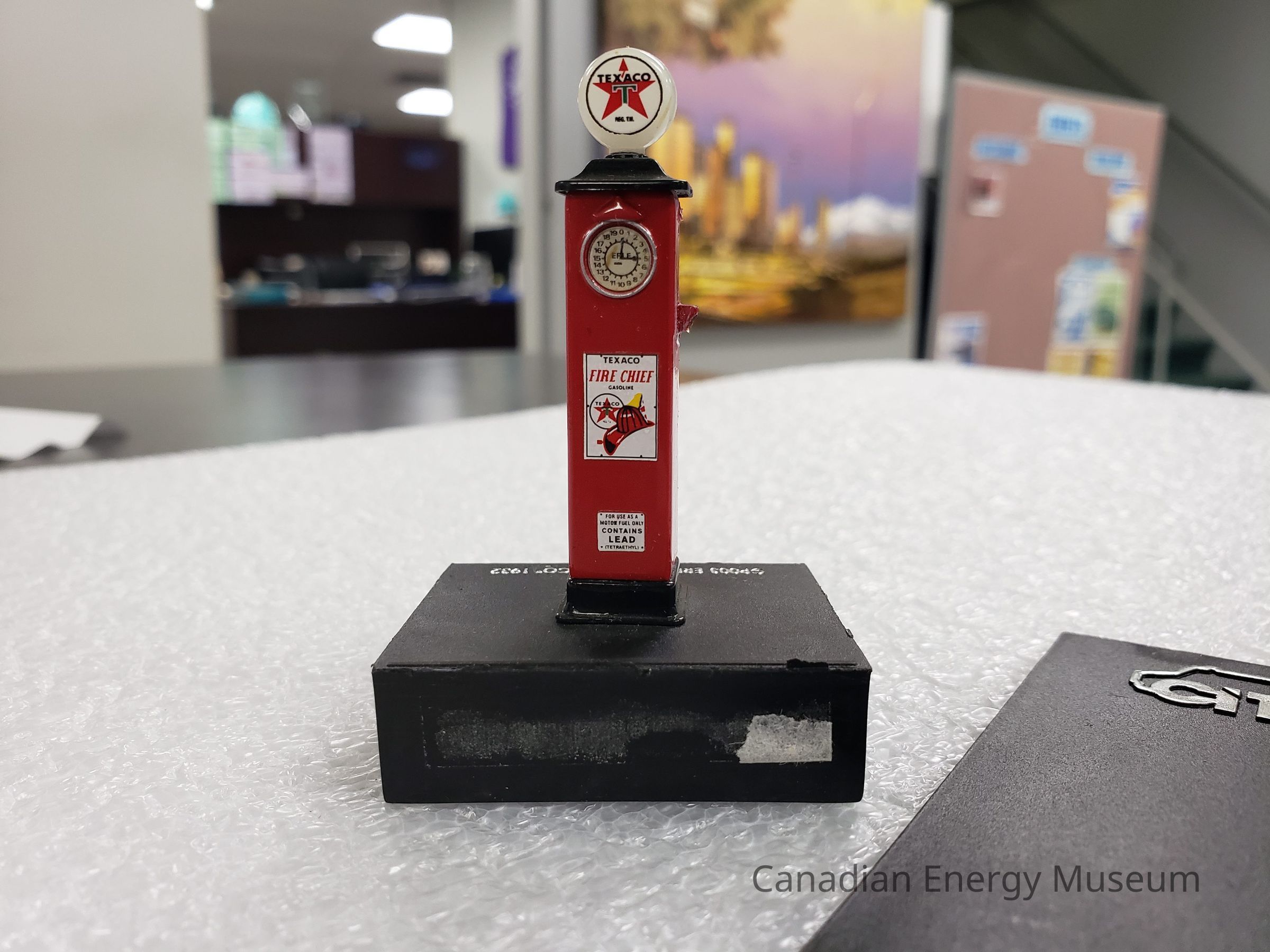 A broken scale model of a Texaco gas pump.