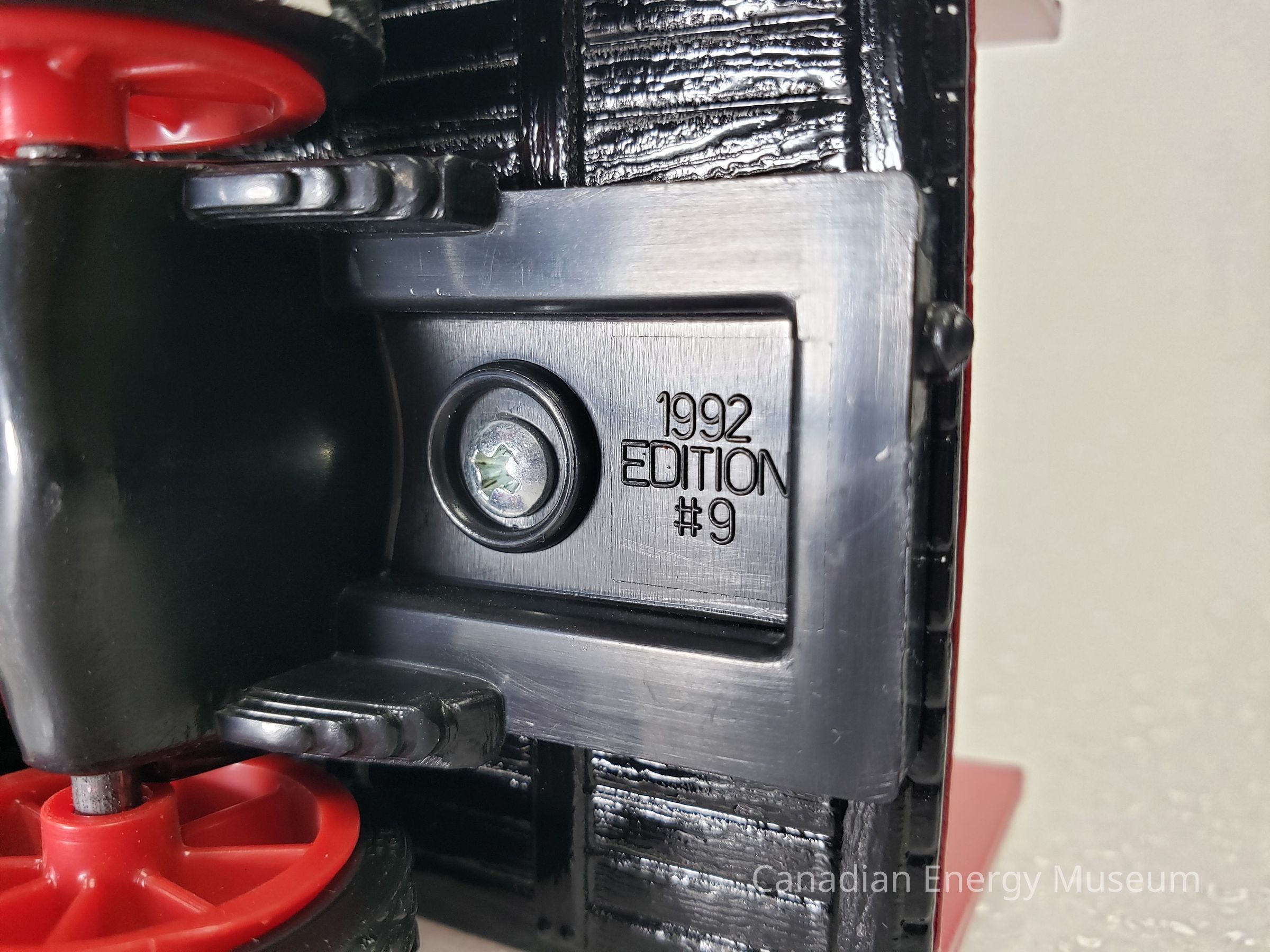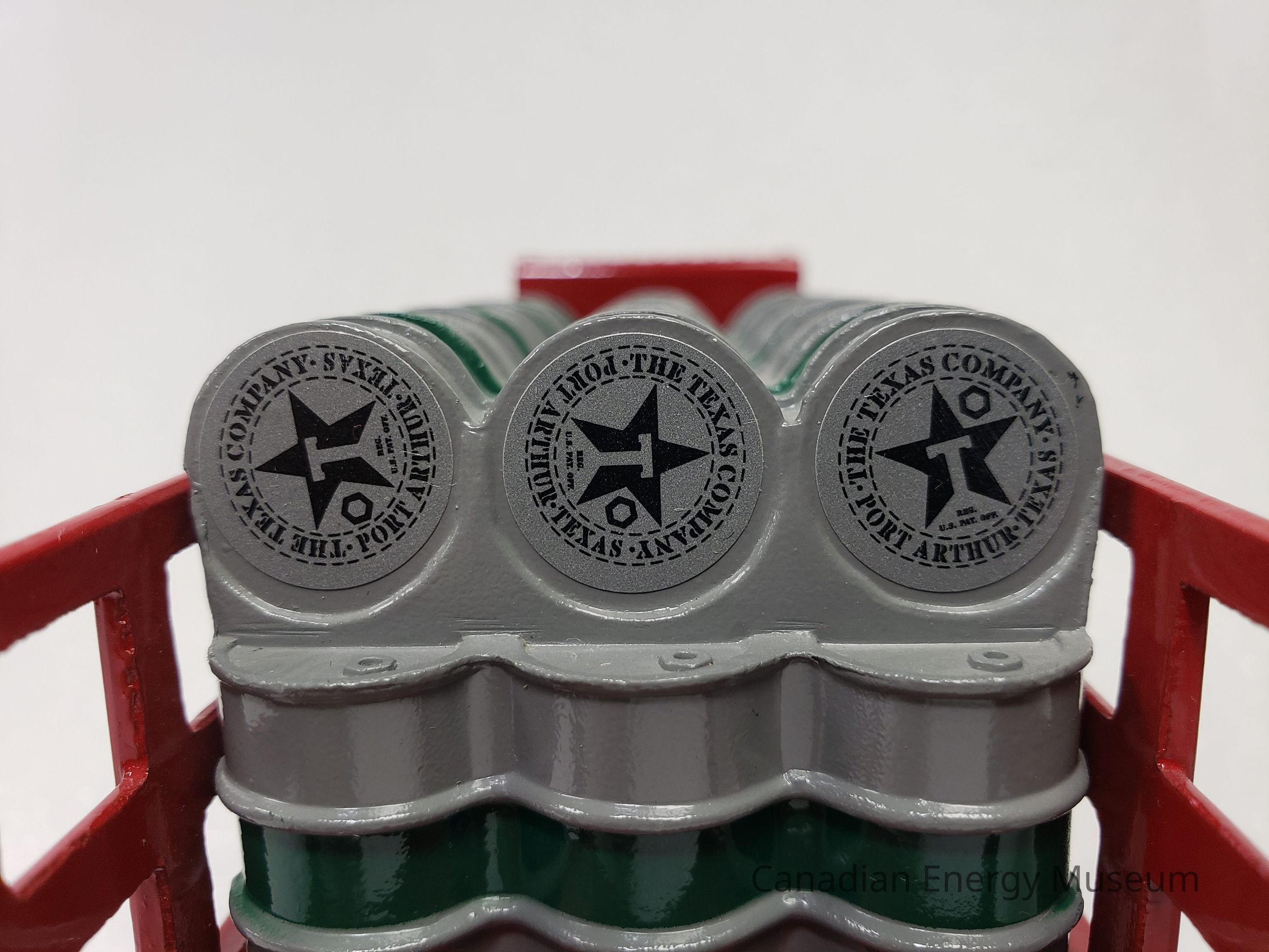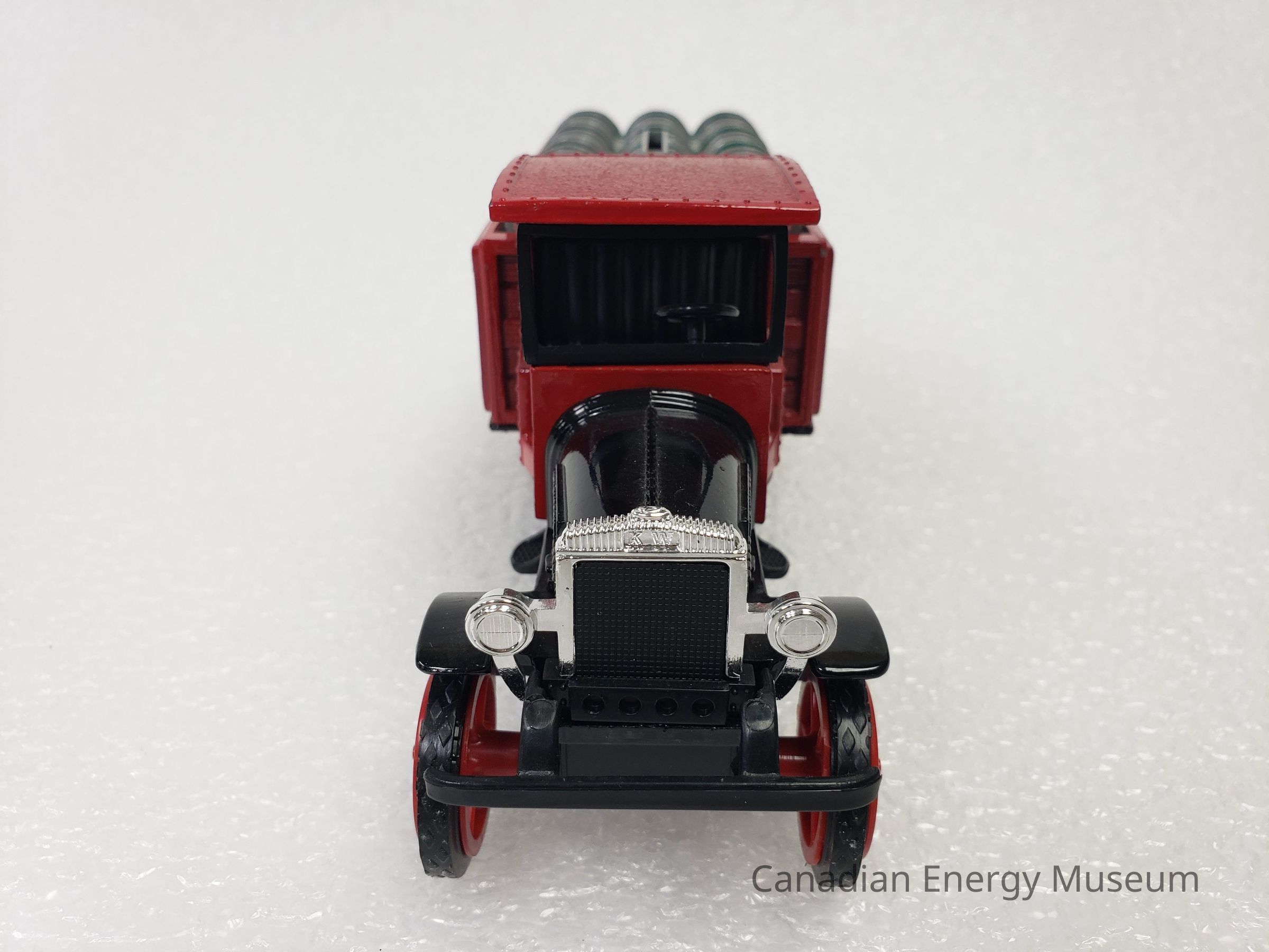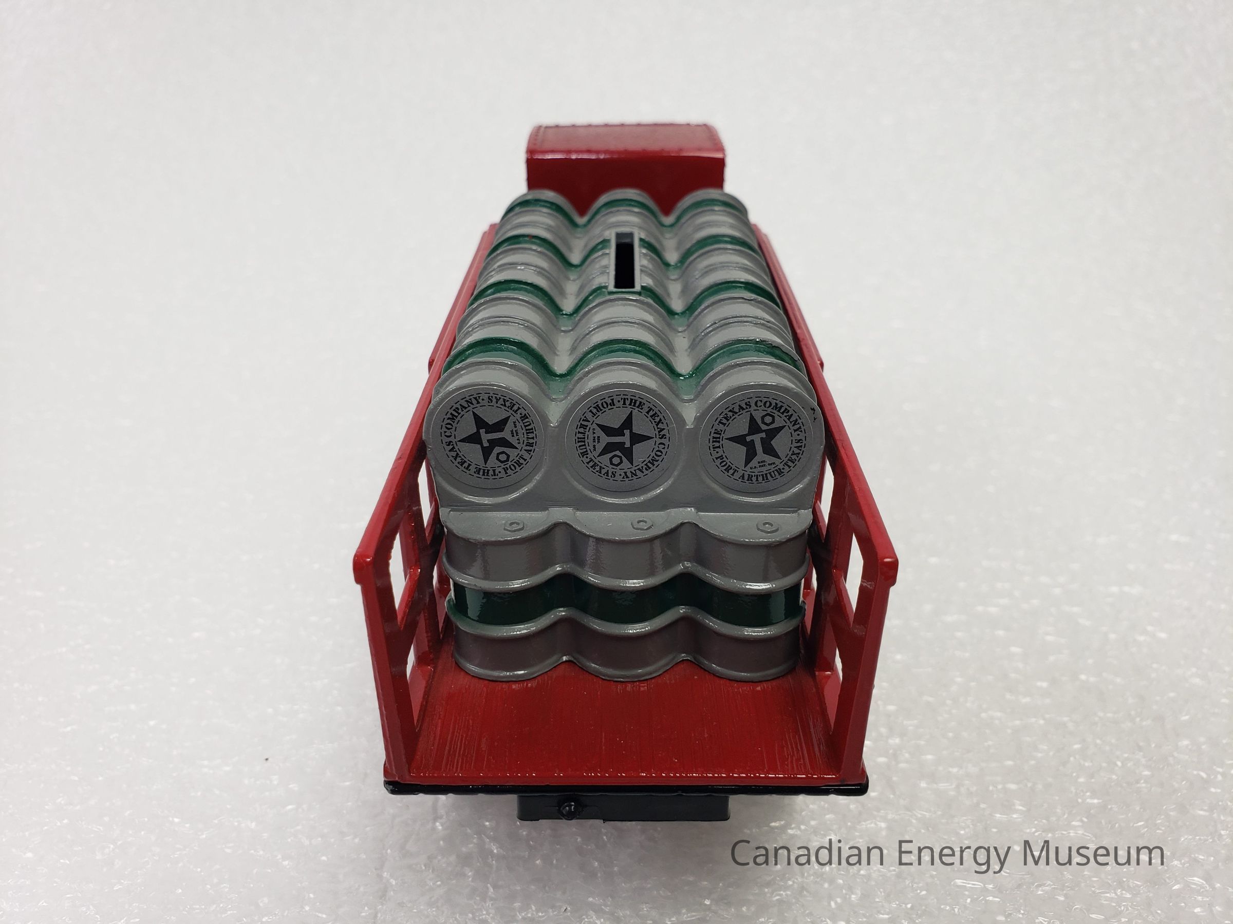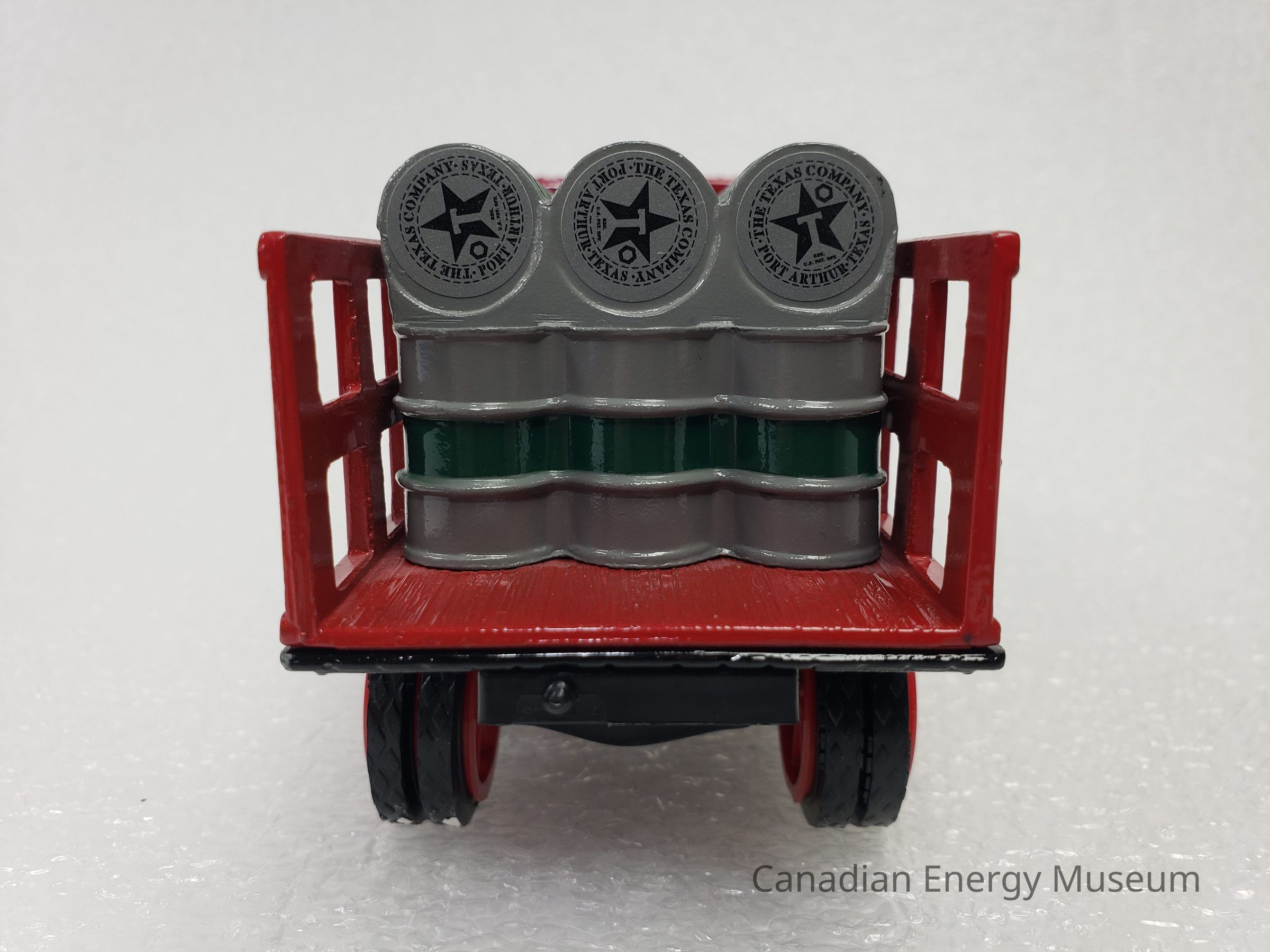 The piece is comprised of metal, plastic, and rubber. The cab, truck bed, and barrels of the vehicle are die-cast metal in red, black, white, grey, and green. The hood of the cab and front mudguards are black; the cab, truck bed and sides are red; and the barrels are grey with green detailing. The cab is open, with no doors or widescreen; a flat roof with a rivel-design border and canvas textured top; and small steps on either side of the cab. The truck bed is long, with a wood panelling texture on the top and bottom of the bed, and front section of the siding, while the back section of the siding is an open lattice. In the truck bed are 30 oil barrels (18 standing at the base, and 12 laying on top). The vehicle has branding for Texaco, in the form of a round star logo by the driver's and passenger’s doors; the raised text “TEXACO” and round star logo (red square sticker) on the left and right sides of the truck bed sides; and the round star logo branding (round grey sticker) on the ends of the barrels, which read "THE TEXAS COMPANY; PORT ARTHUR, TEXAS". Plastic elements include those on the interior (black console, steering wheel, and bench seat), the widescreen frame (no 'glass'), the grill and headlights (silver and black), the front bumper (black), the wheel spokes (red), and the undercarriage (black). There are 10 wheels total, with 2 wheels at the front of the vehicle, and eight wheels at the back of the vehicle in a configuration of four sets of two. The tires are black rubber with the ERTL text logo in the moulding and are functional with a full range of motion. The oil barrel portion of the vehicle acts as a money bank, with a slit at the top, and a locking closure on the underside (key attached). On the plastic underside of the vehicle are moulded wheel axles and the model's manufacturer's marks.