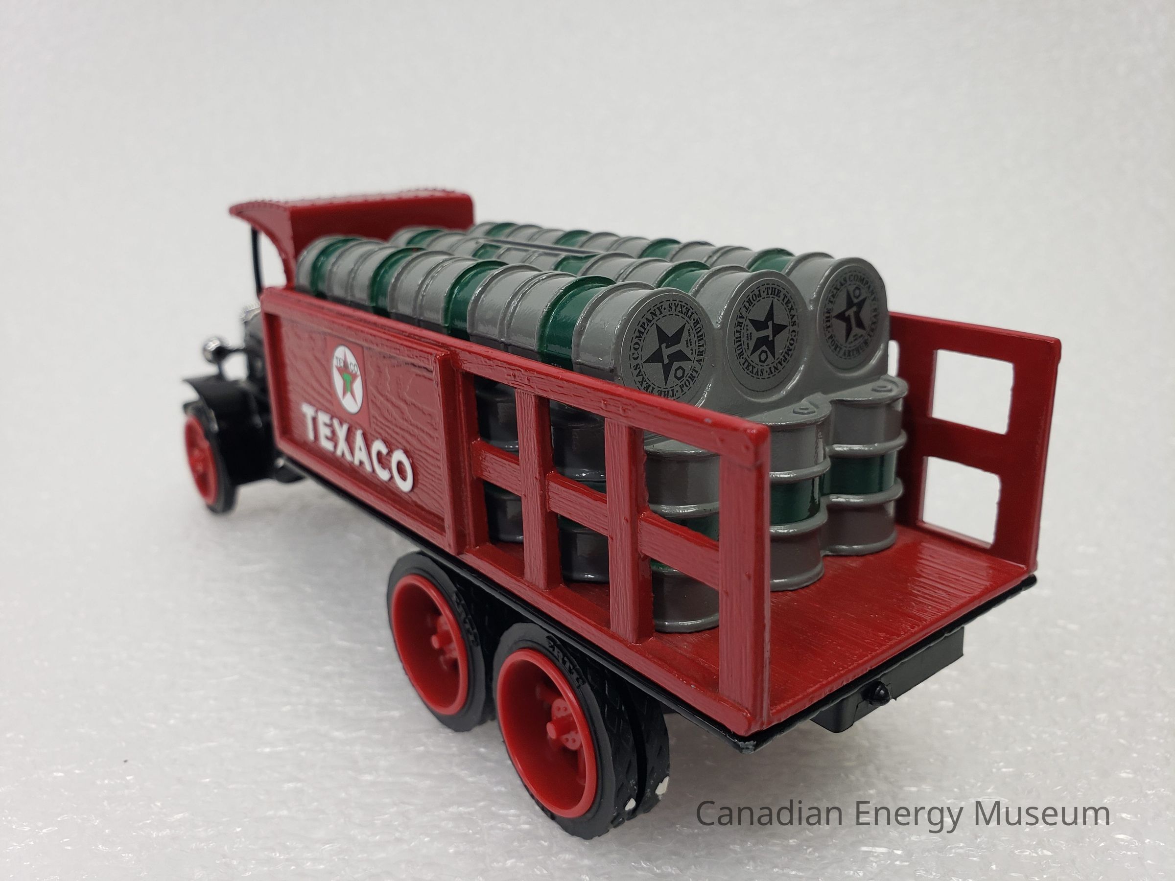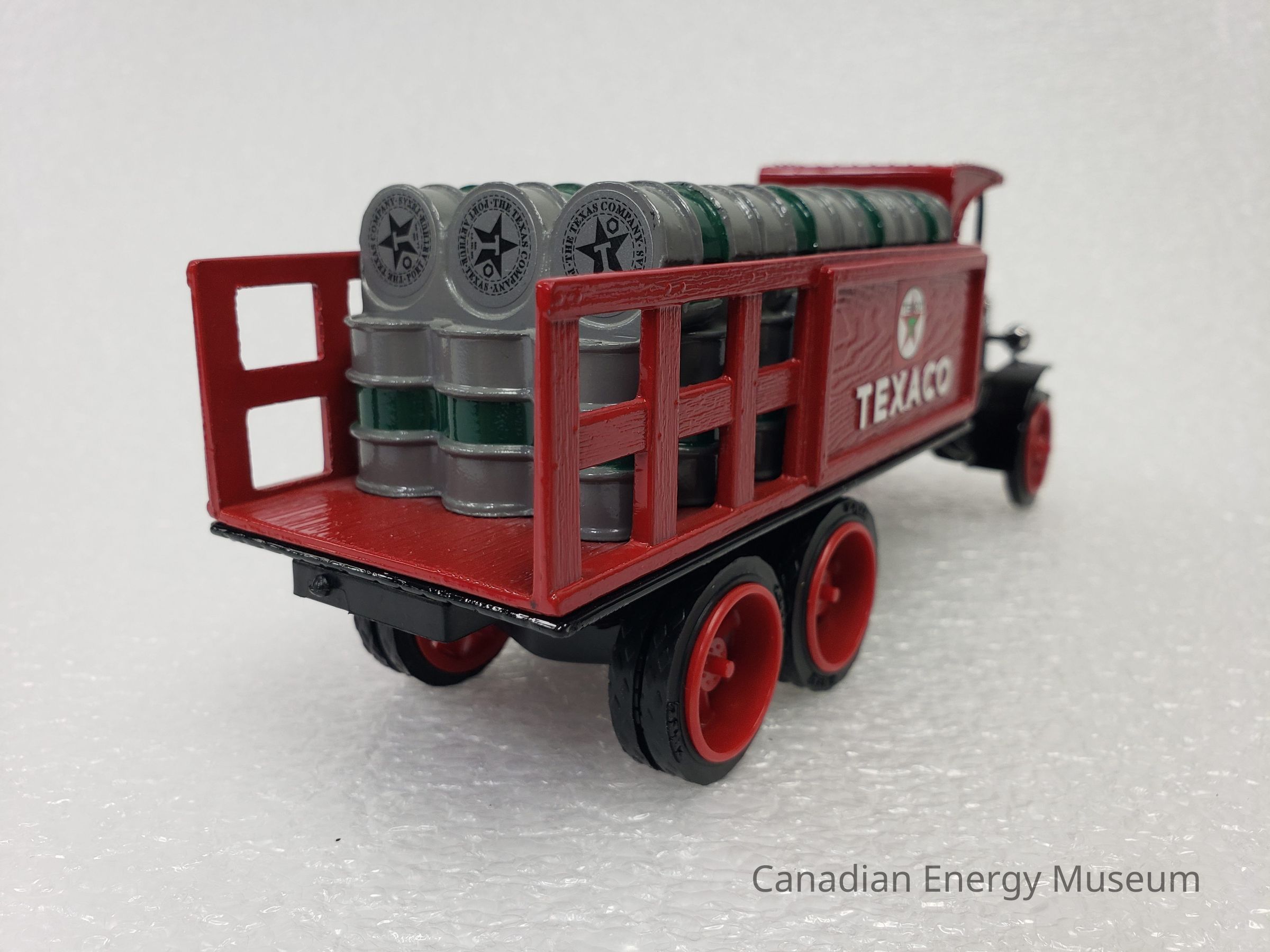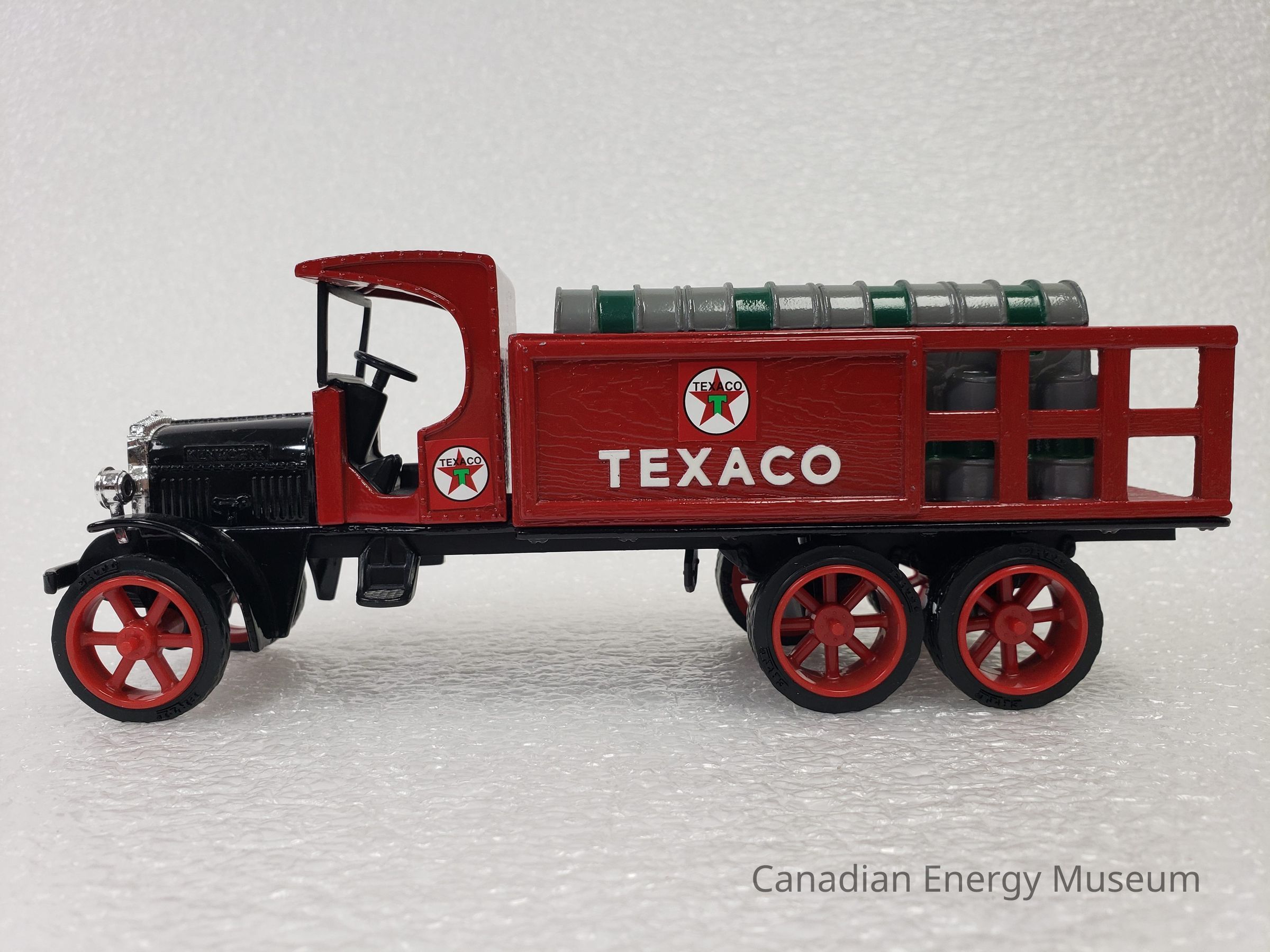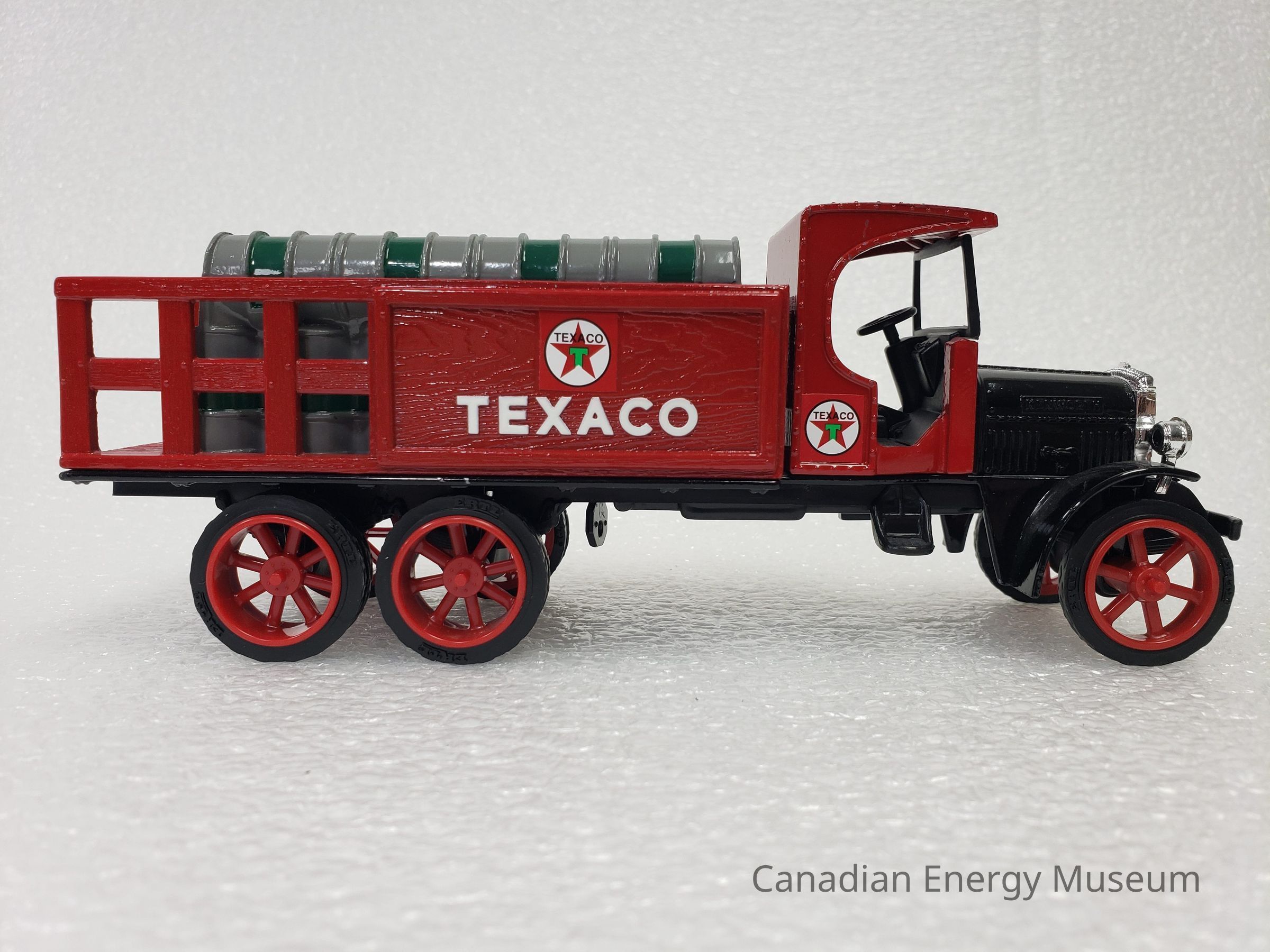 This particular model is a replica of a 1925 Kenworth Stake Truck (with Texaco branded barrels), was one of the vehicles used by Texaco Jobbers (the middleman between the company that refines the petroleum products and buyers and retailers) and other distributors when delivering products in the 1920s and 1930s.
