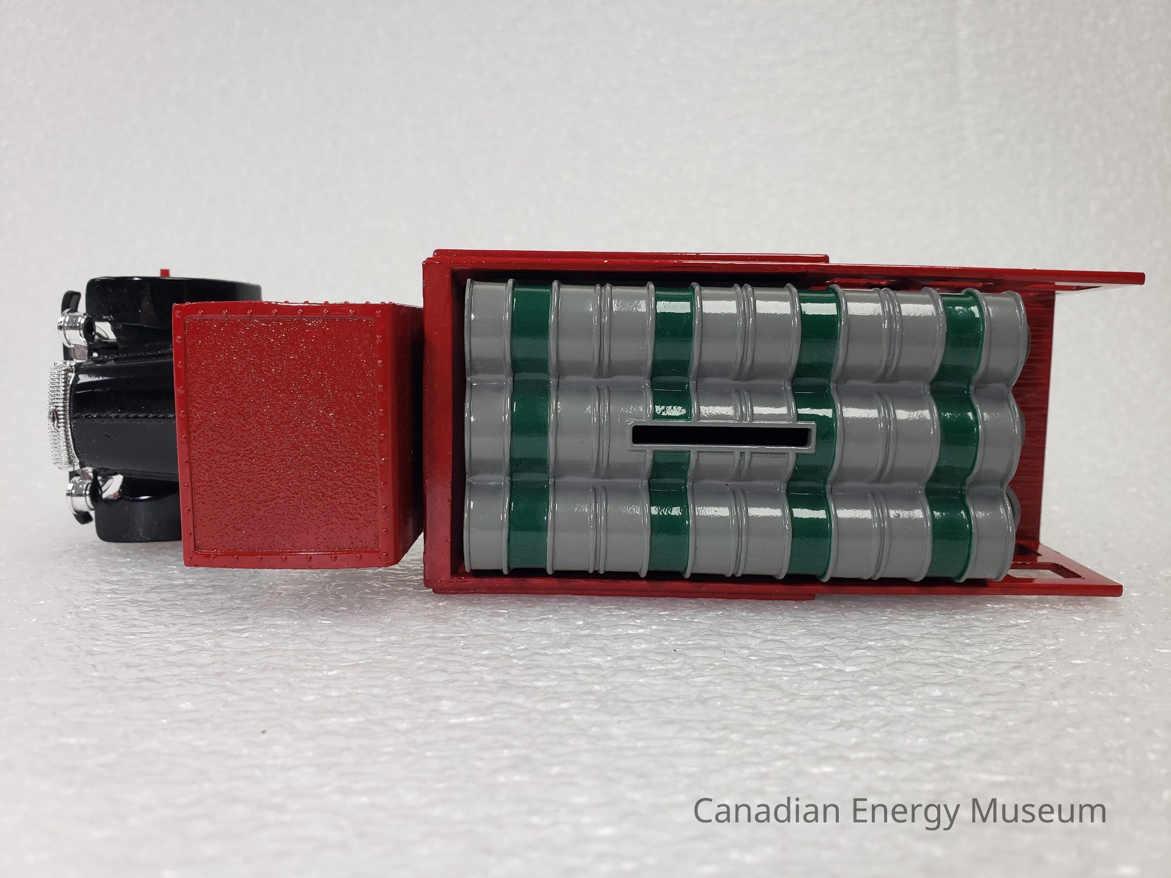 Old Description (Kelsey Dalrymple, 2/18/2020): Still bank in the shape of a replica 1925 Kenworth stake truck and trailer. Truck is red and black, with a red mock-wood bed. Grey and green barrels in back of truck have slot in top for coins. Truck is labeled Texaco with the Texaco logo on the bed andCollection