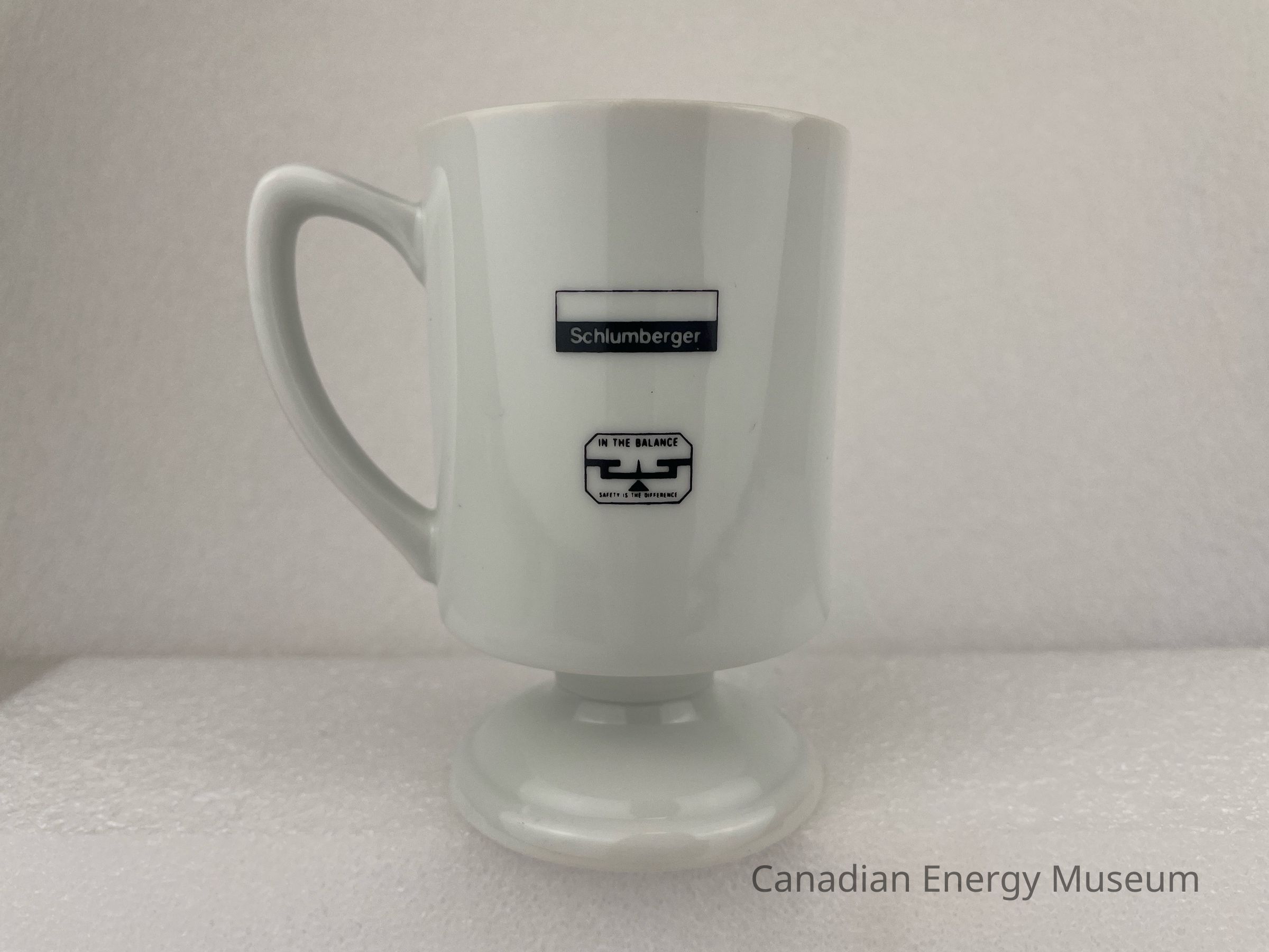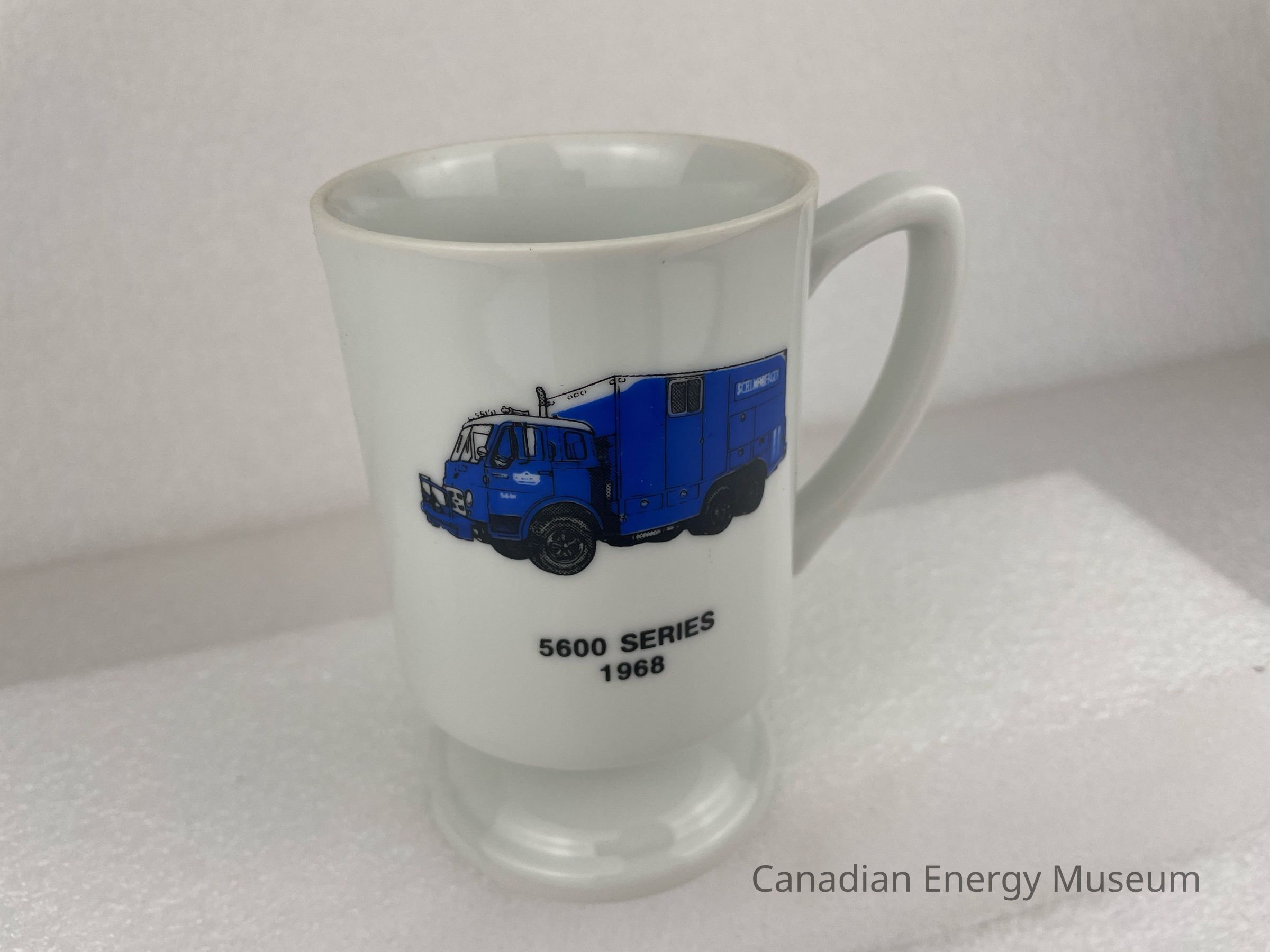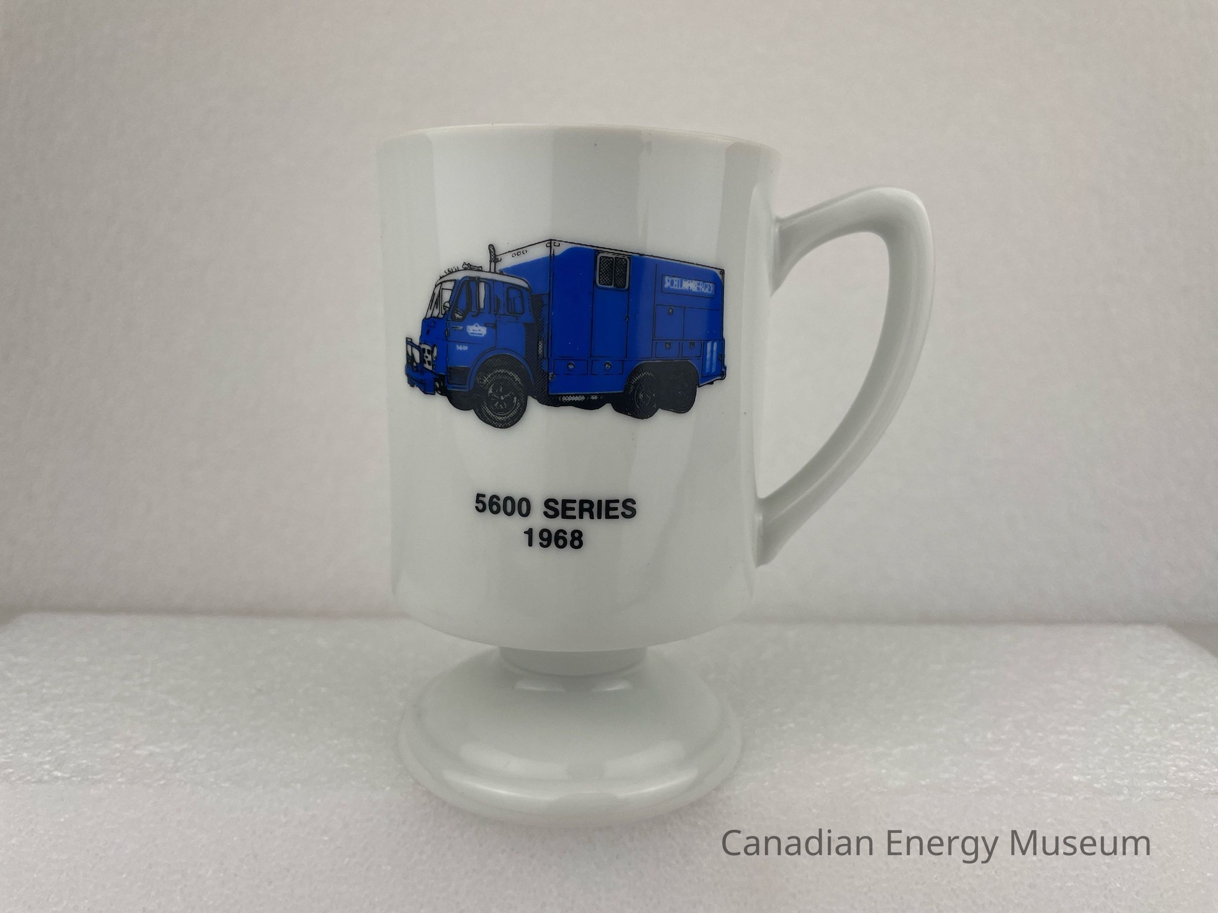 A white ceramic mug with a squat stem and base. The front of the mug features a blue, black and white illustration of a truck with black text underneath reading, "5600 SERIES 1968". The back of the mug displays a small white and black rectangle with white text, "Schlumberger". An octagonal shape sits underneath the rectangle with black text reading, "IN THE BALANCE SAFETY IS THE DIFFERENCE".Collection