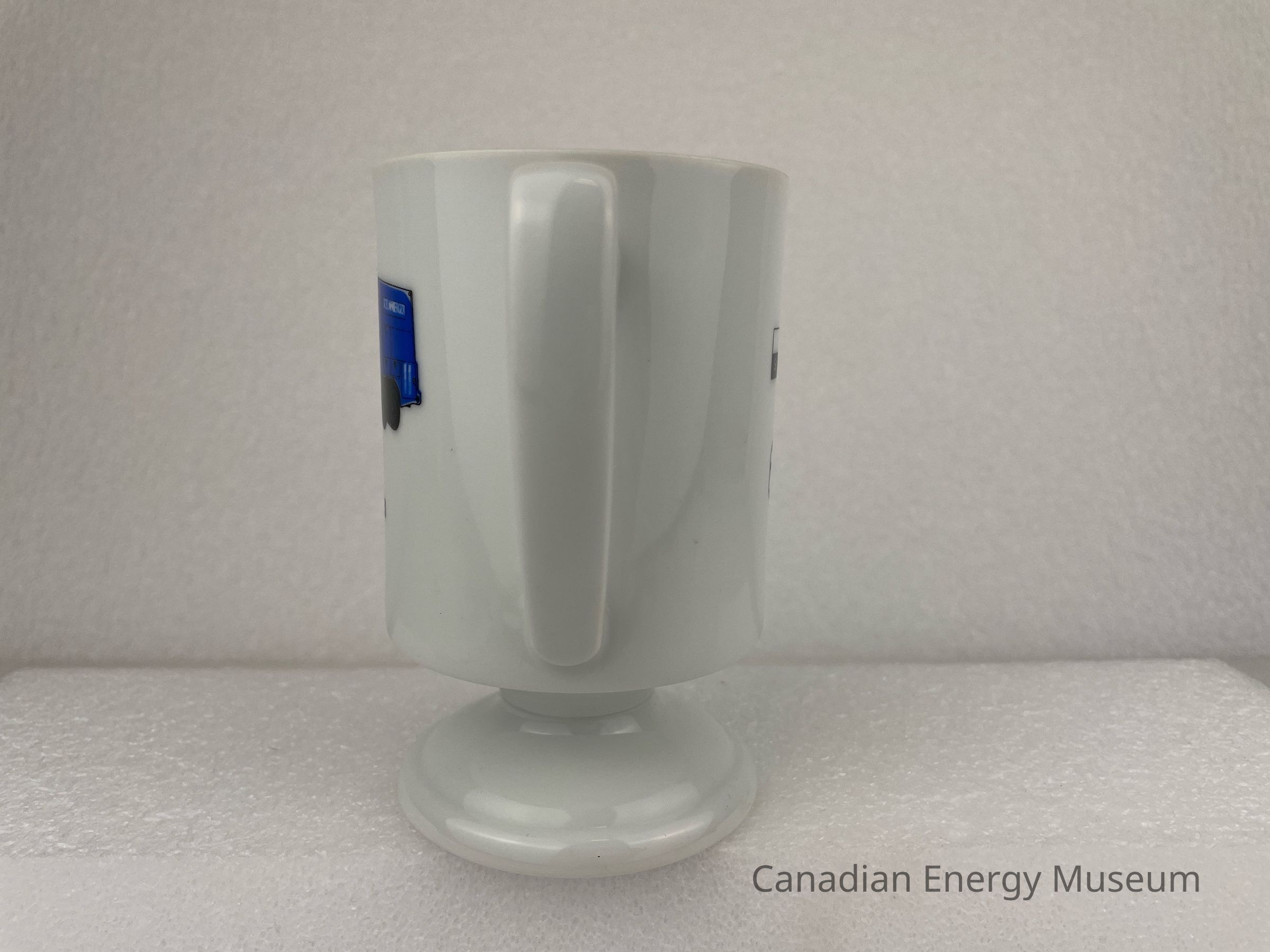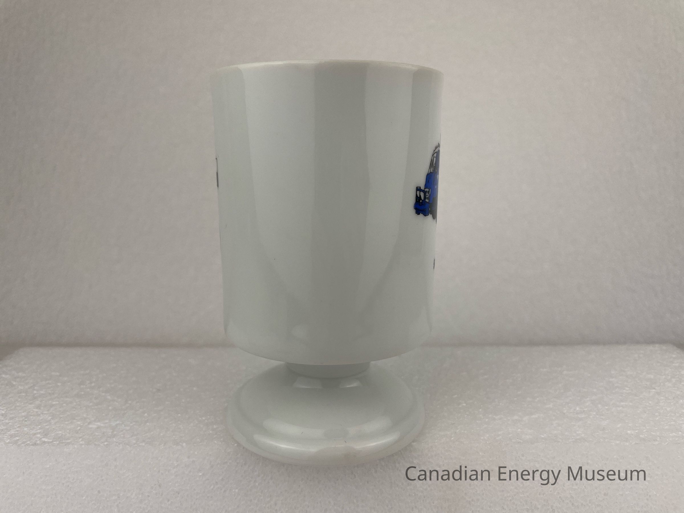 Drinkware, Mug, Ceramic, White, Blue, Truck, 1960sDescription