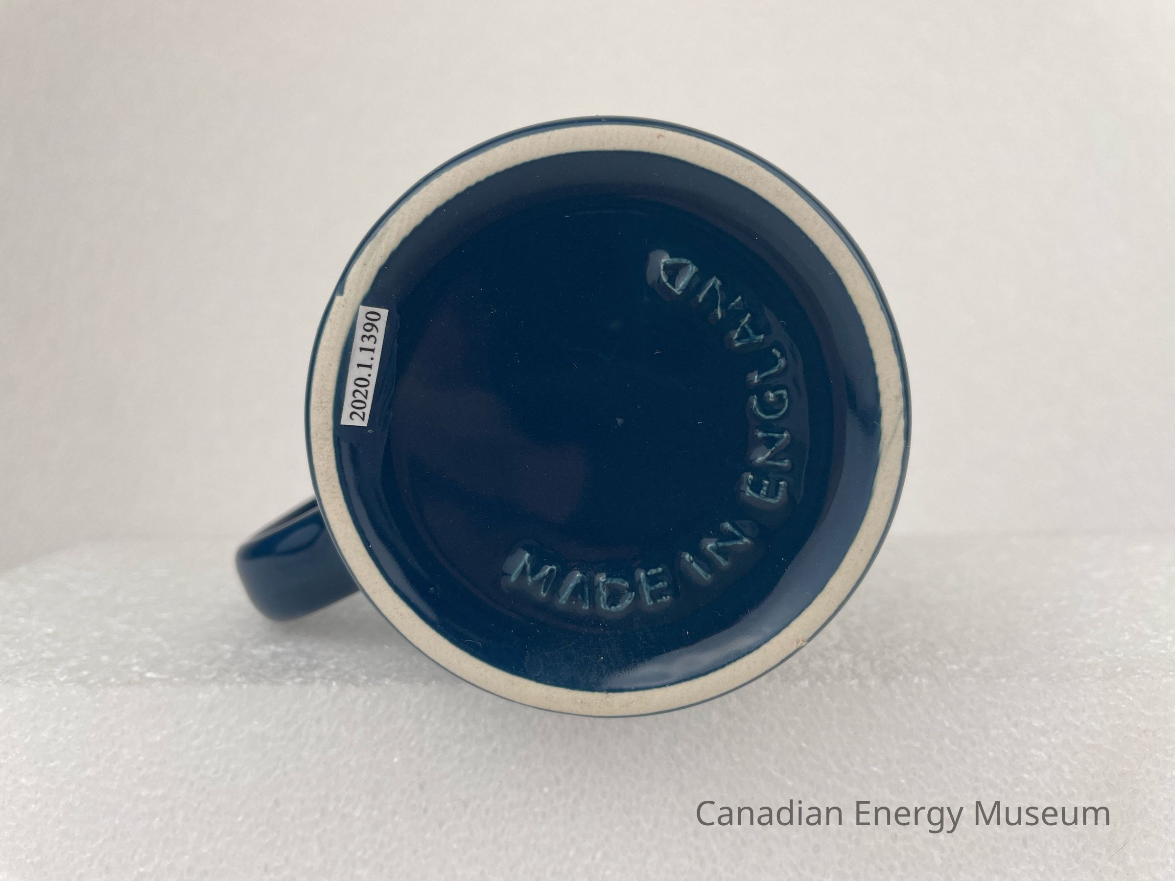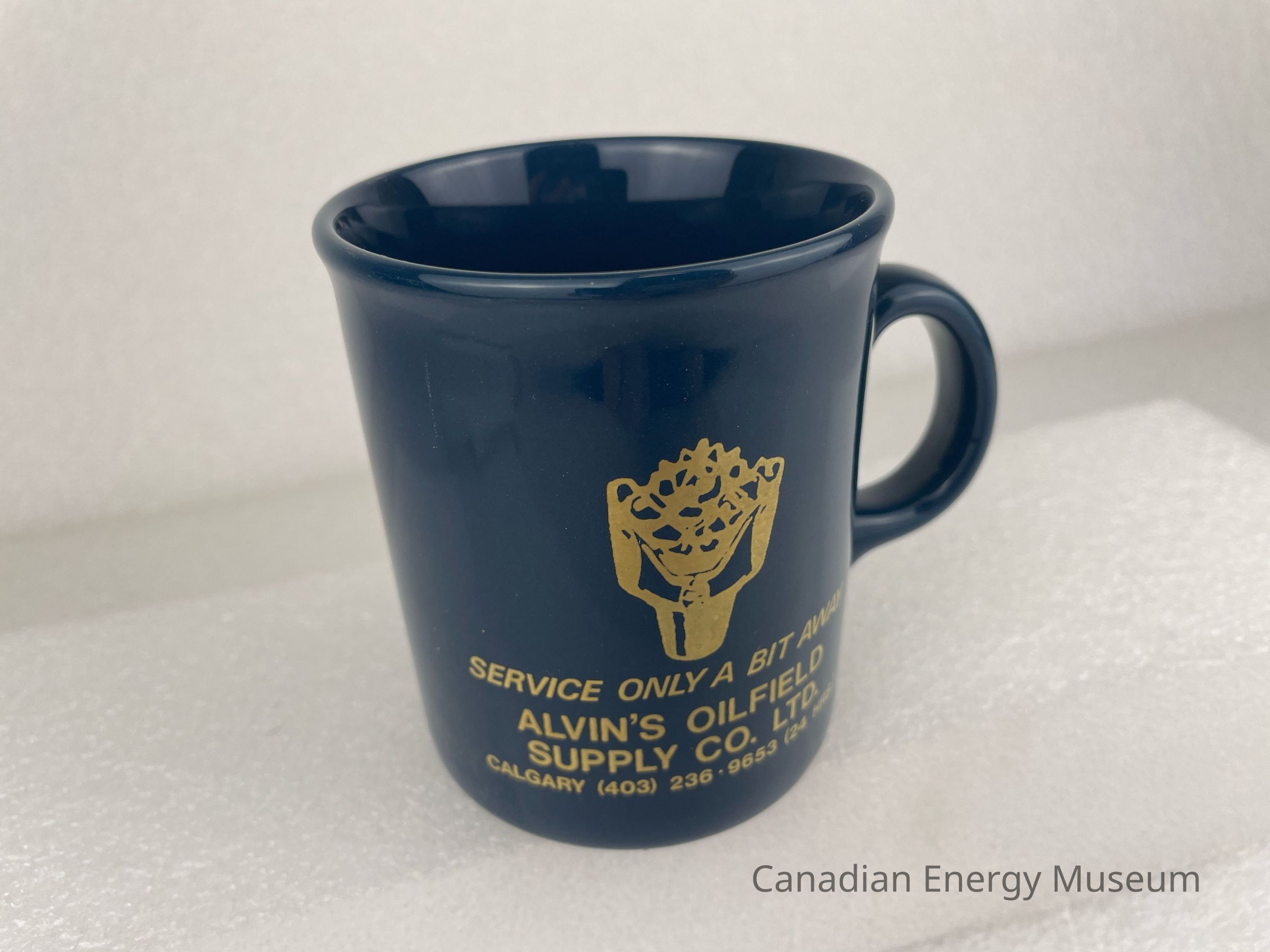 A navy ceramic mug with a handle branded to Alvin's Oilfield Supply Co. Ltd. The front of the mug features a gold illustration of a drill bit with gold text underneath reading "SERVICE ONLY A BIT AWARD / ALVIN'S OILFIELD SUPPLY CO. LTD." with smaller text at the bottom reading, "CALGARY 9403) 236 . 9653 (24 HRS.)". The bottom of the mug is raised text reading, "MADE IN ENGLAND".Collection