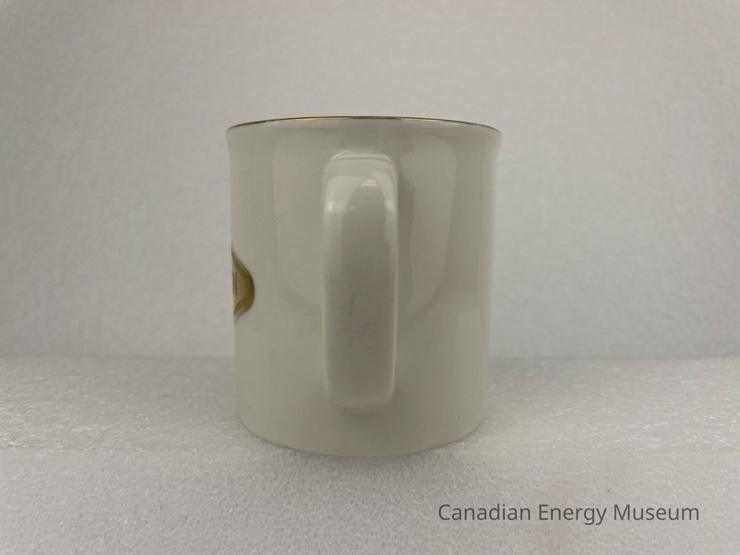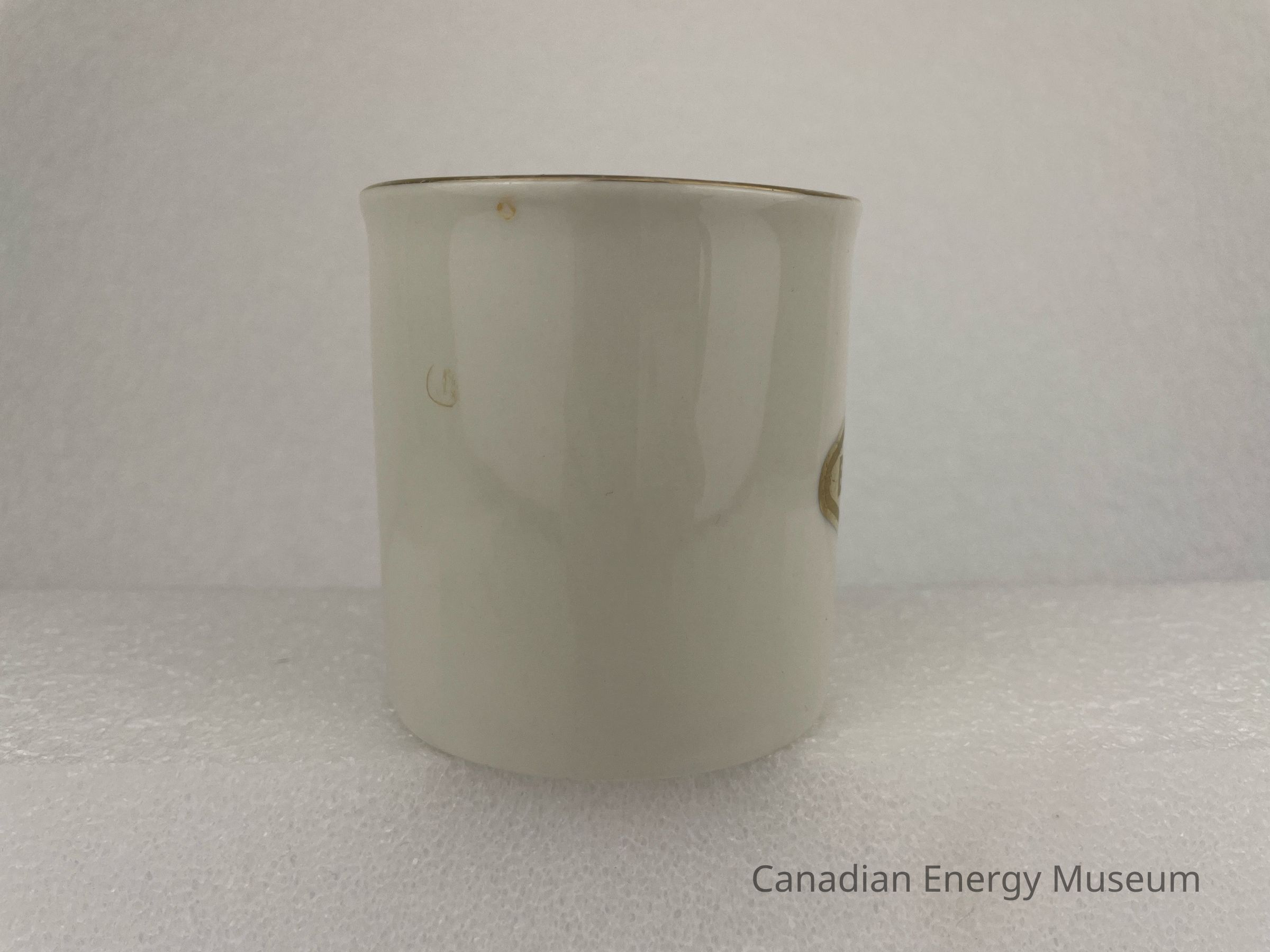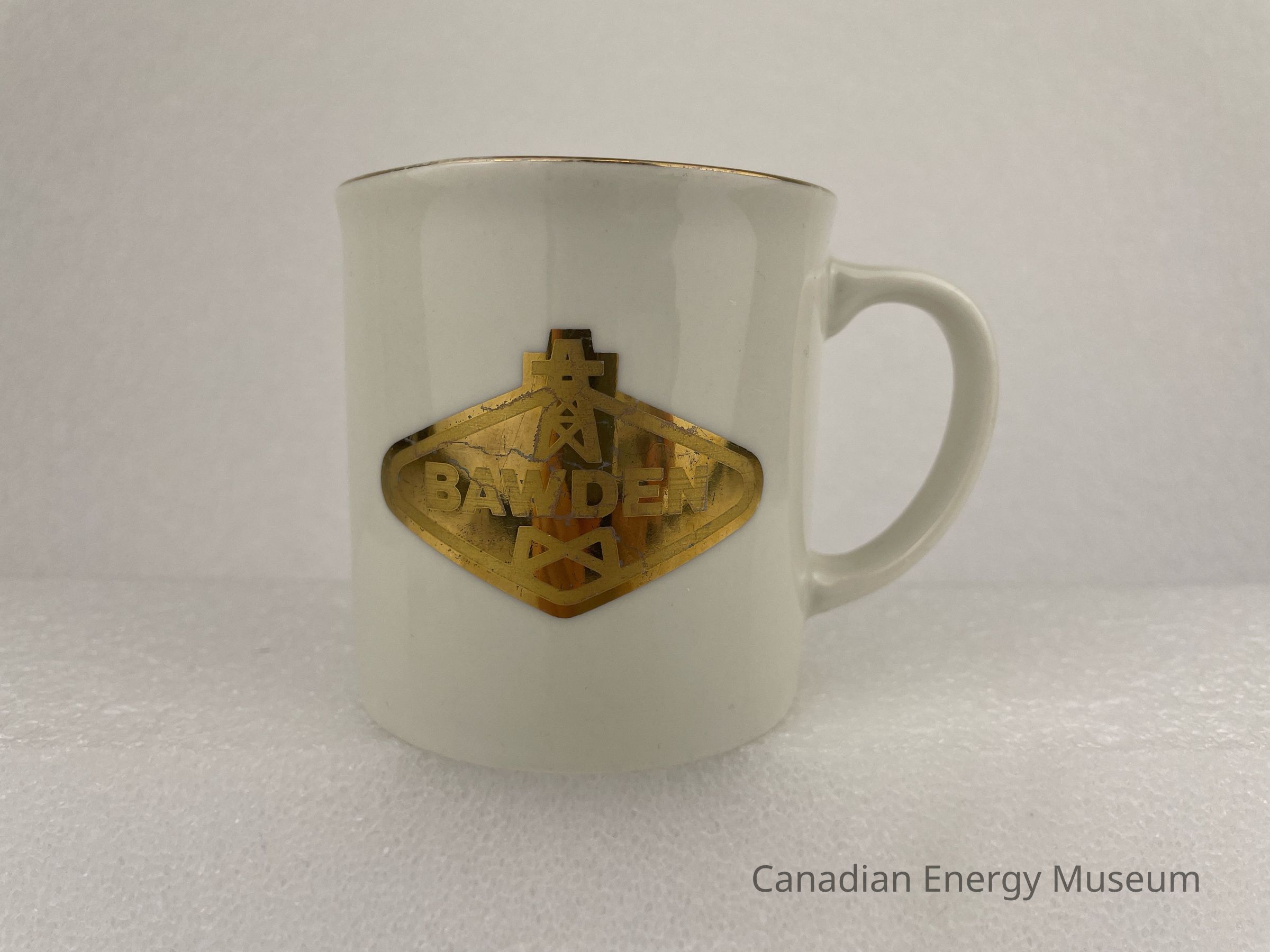 A fine ivory china mug with a gold rim branded to Bawden. The front of the mug features a gold horizontal diamond shape with an oil derrick in the centre and text reading, "BAWDEN".Collection