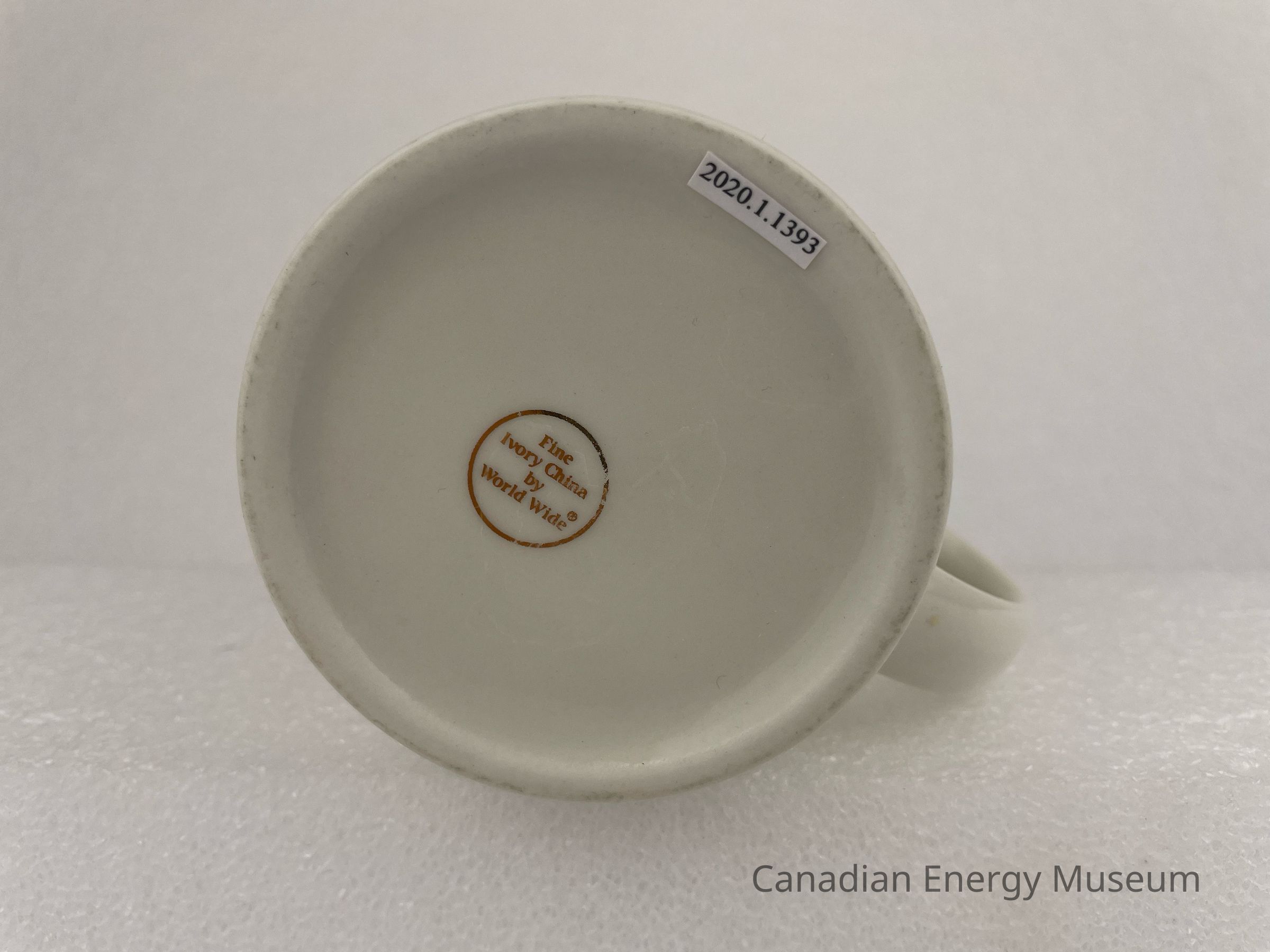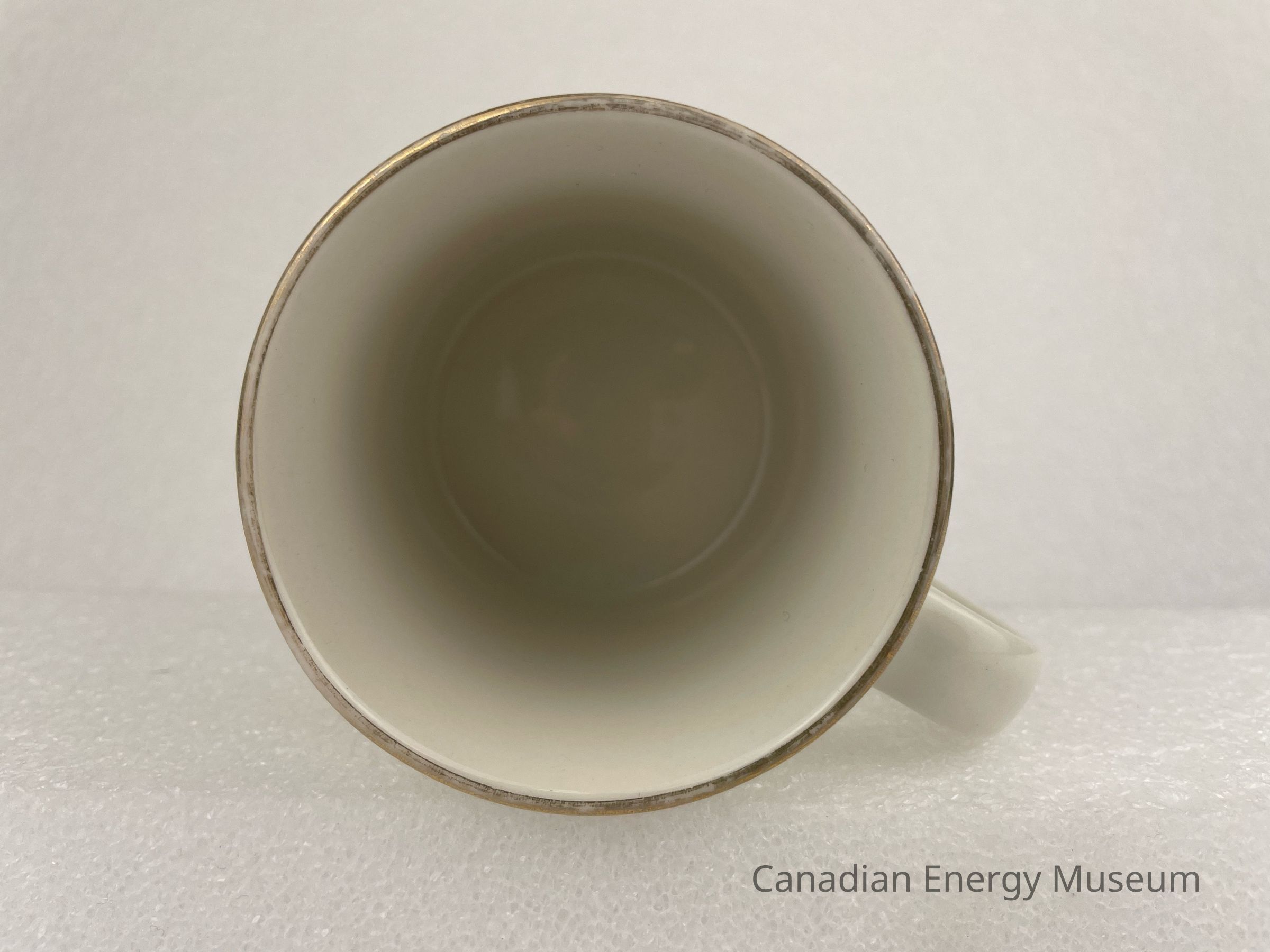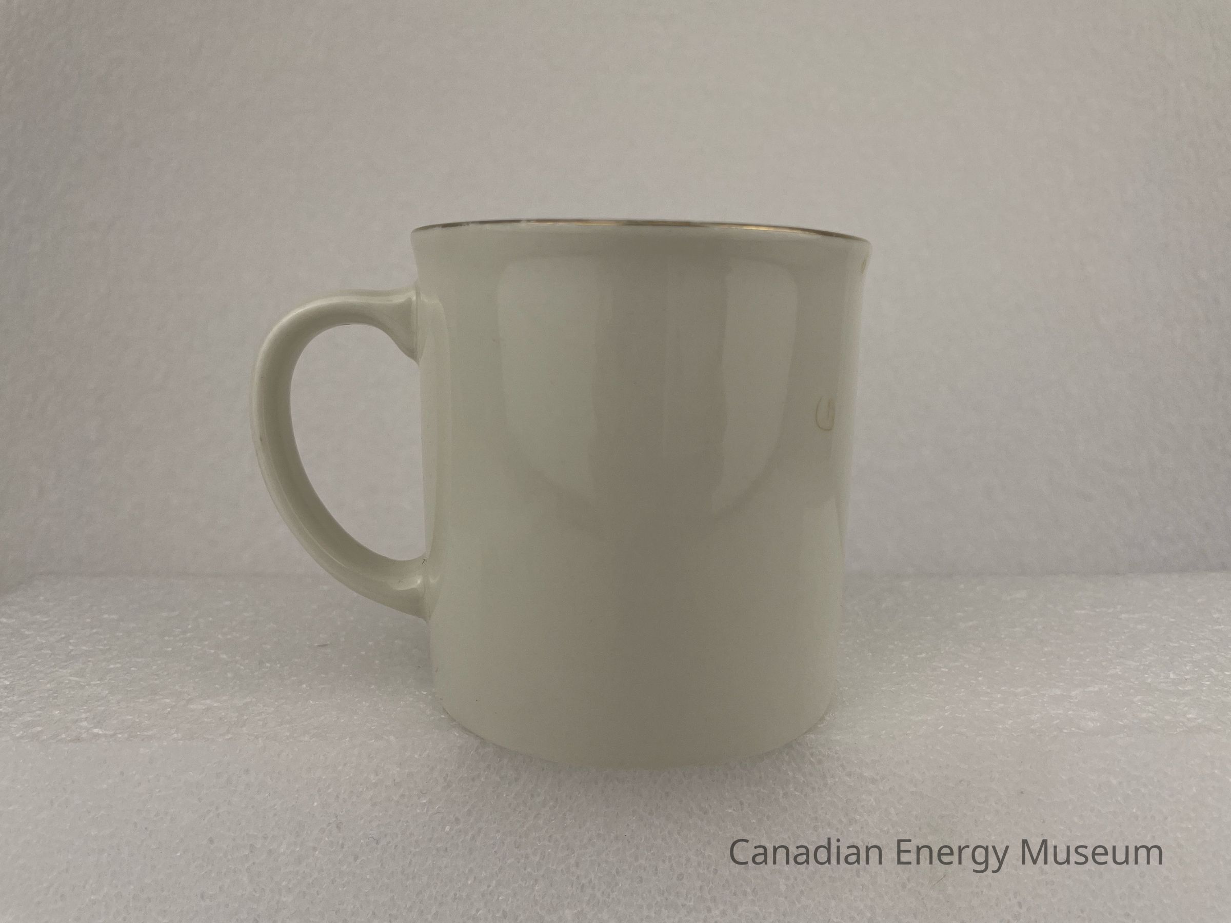 A fine ivory china mug with a gold rim branded to Bawden. The front of the mug features a gold horizontal diamond shape with an oil derrick in the centre and text reading, "BAWDEN".Collection