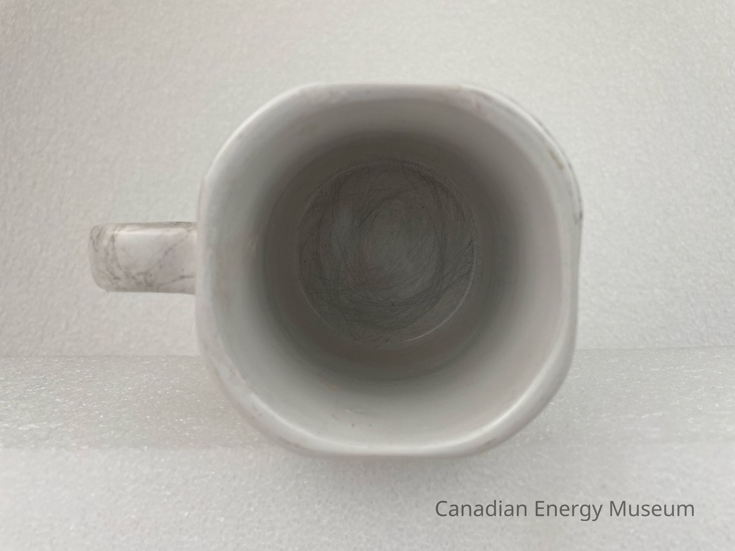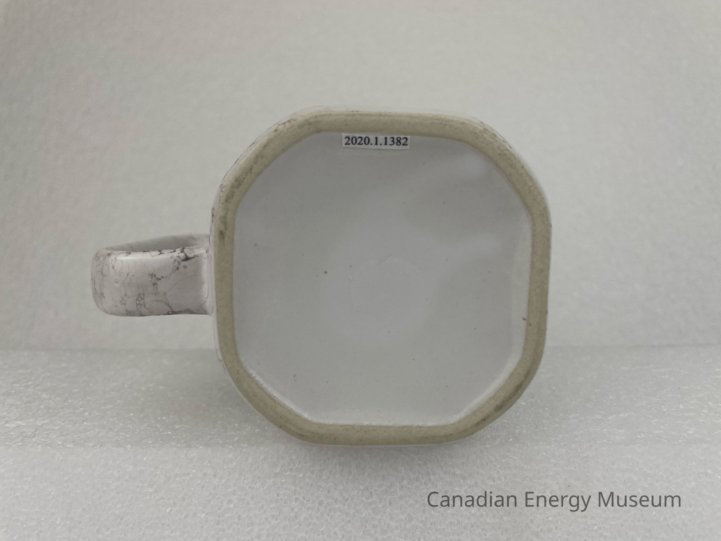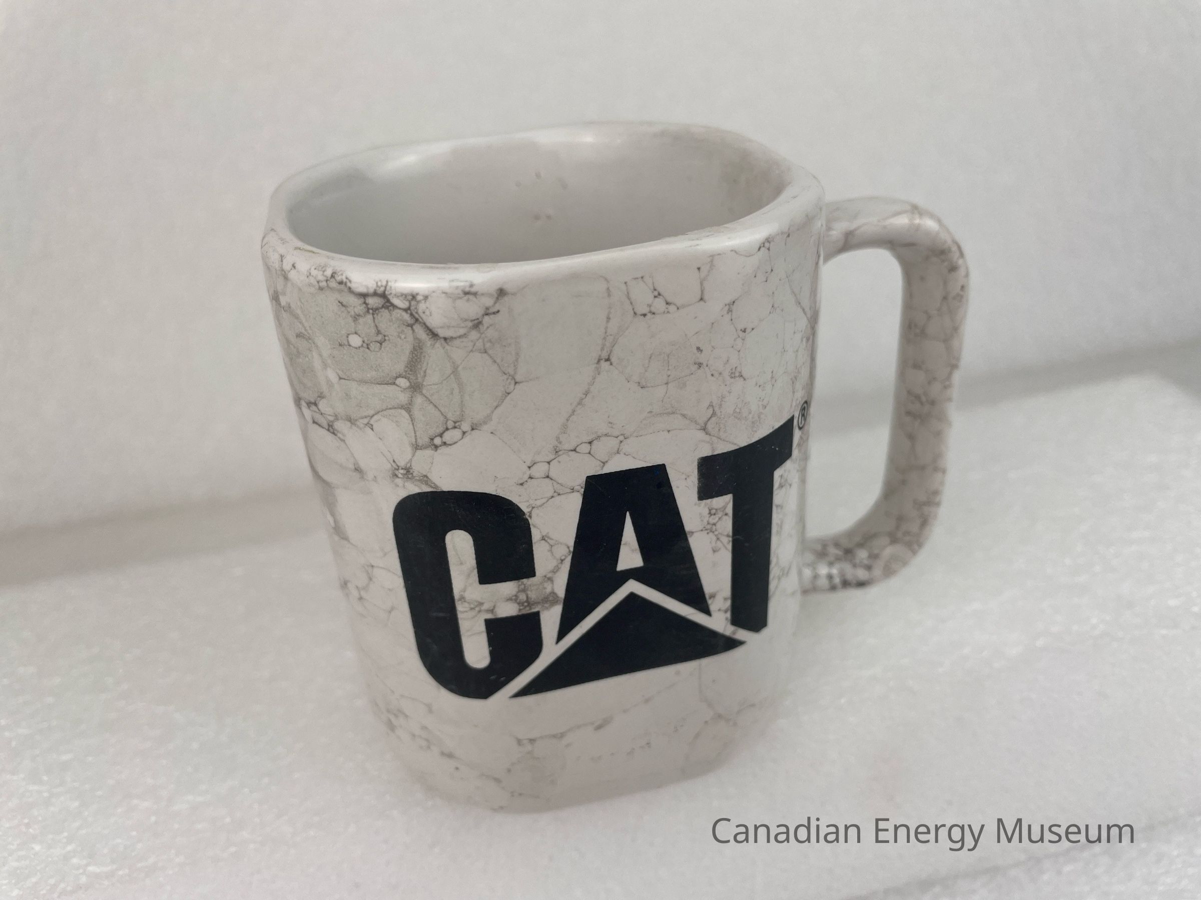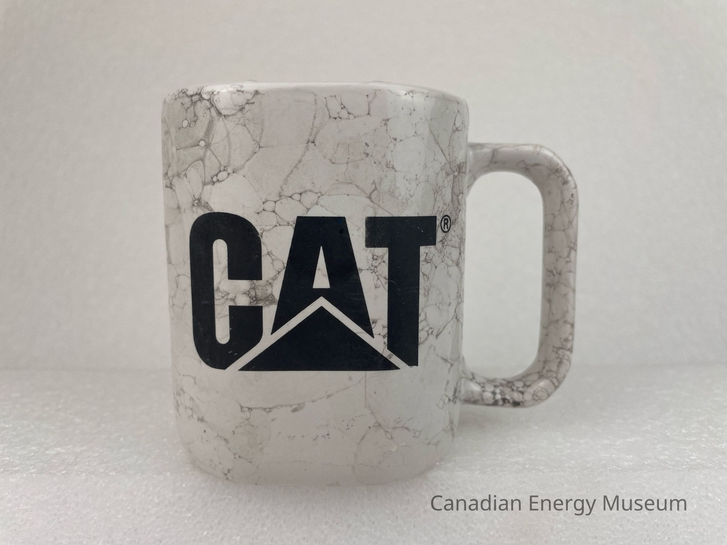 A white, marble ceramic mug with an octagonal body and a square-shaped handle. The front of the mug features the black CAT logo - a black triangle with "CAT" underneath.Collection