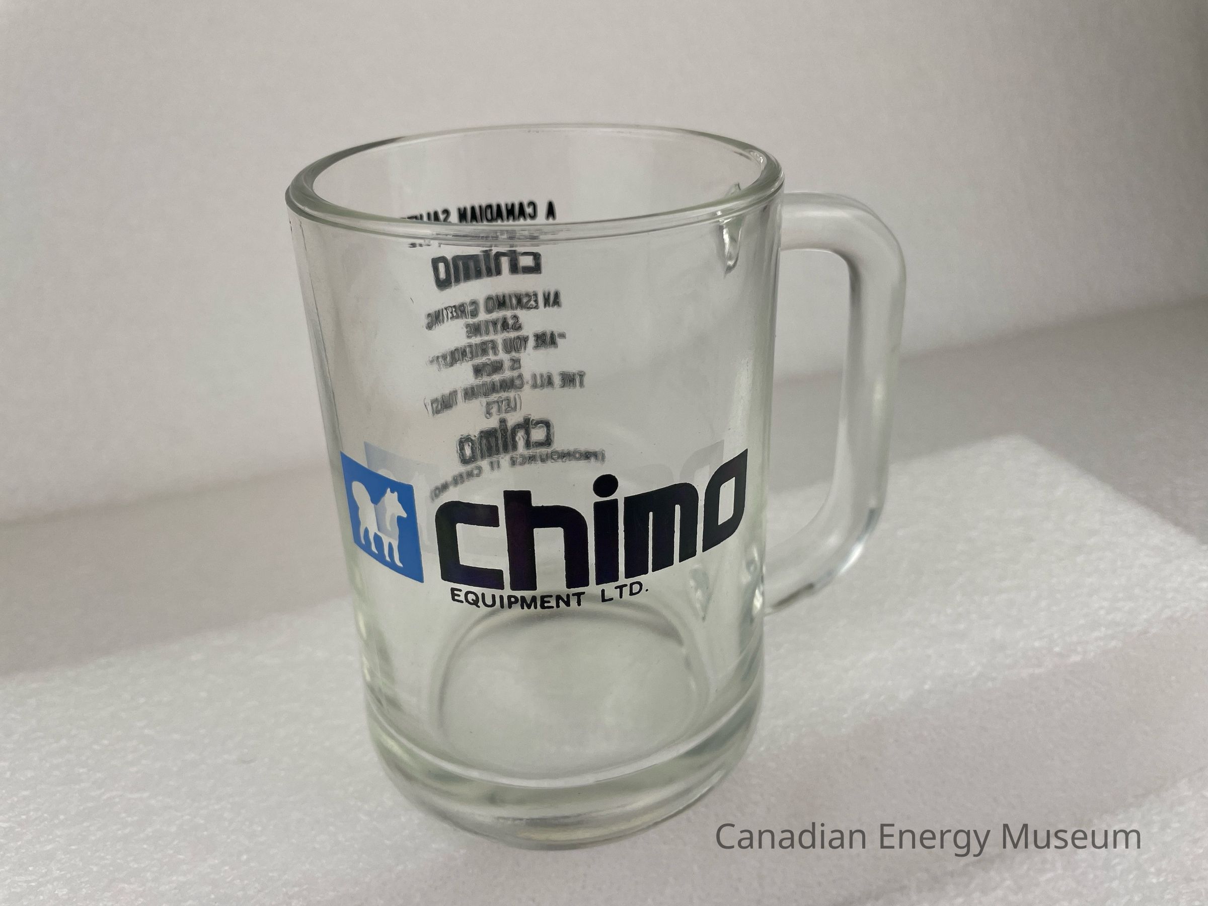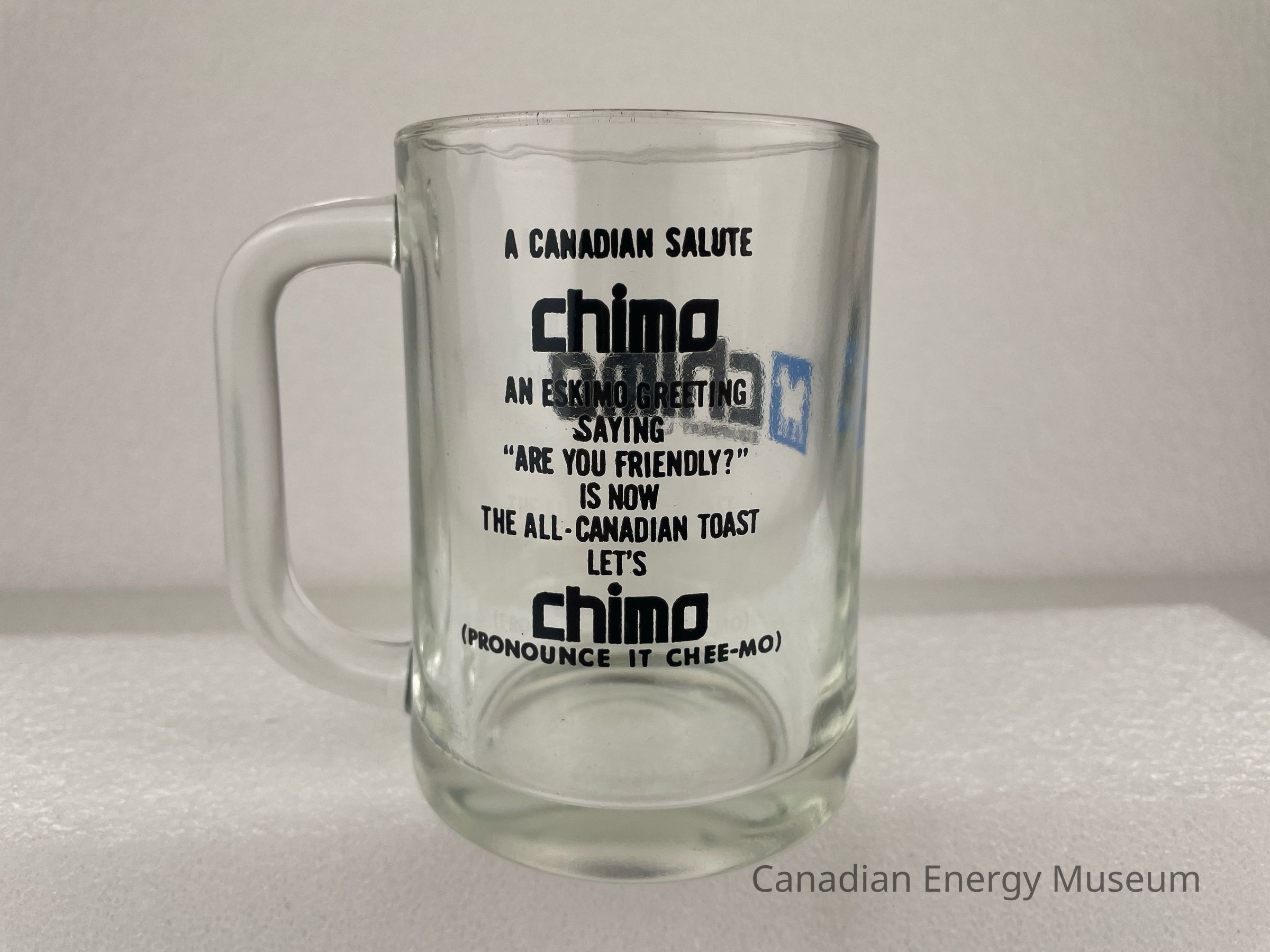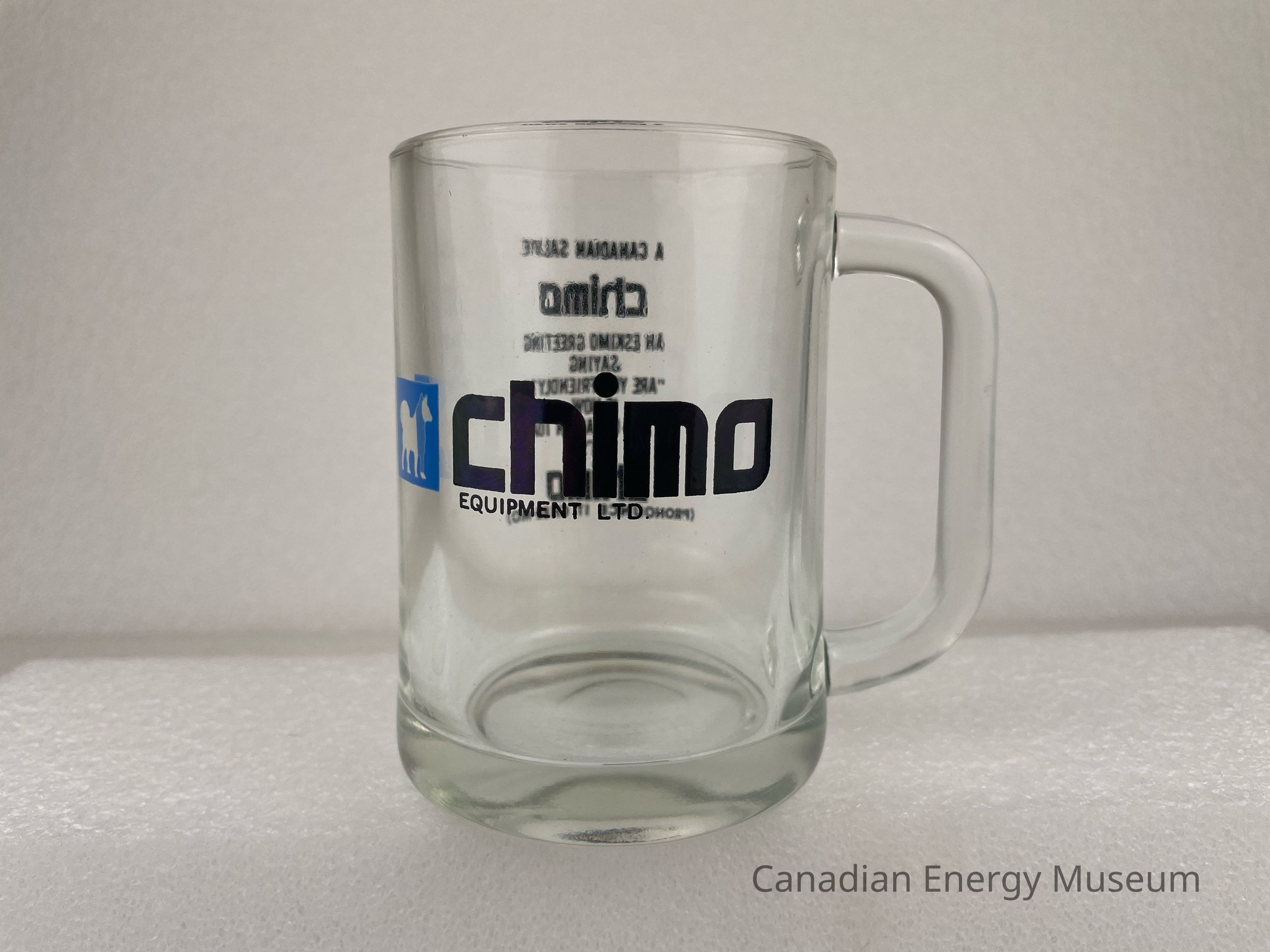 Old Description: Glass beer mug with handle. Black text on one side: Chimo Equipment Ltd. with blue square and silhouette of a husky in the center. Opposite side has black text that reads: A Canadian Salute / Chimo / A Eskimo Greeting / Saying / "Are You Friendly?" / Is Now / The All-Canadian Toast / Let's / Chimo / (Pronounce It Chee-Mo).Collection