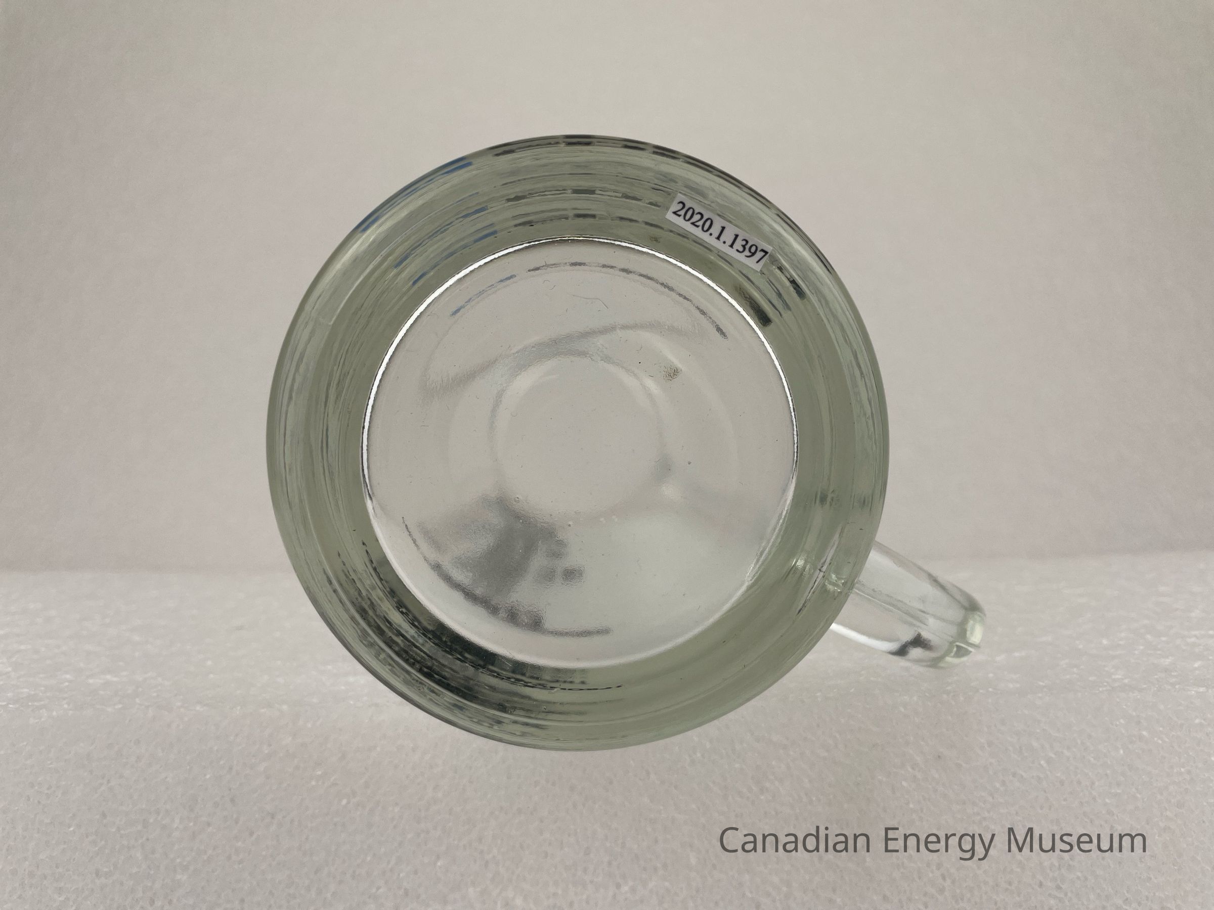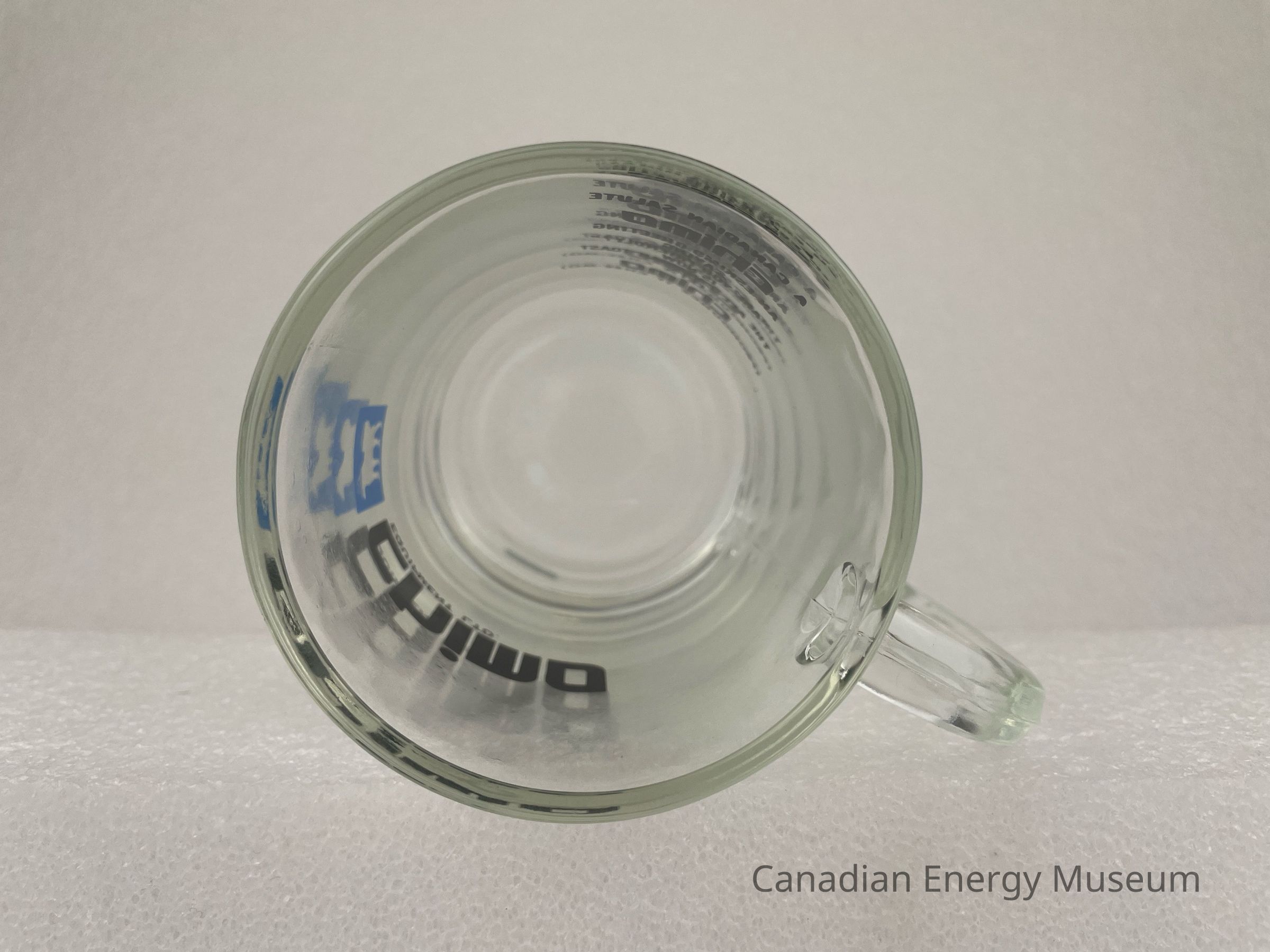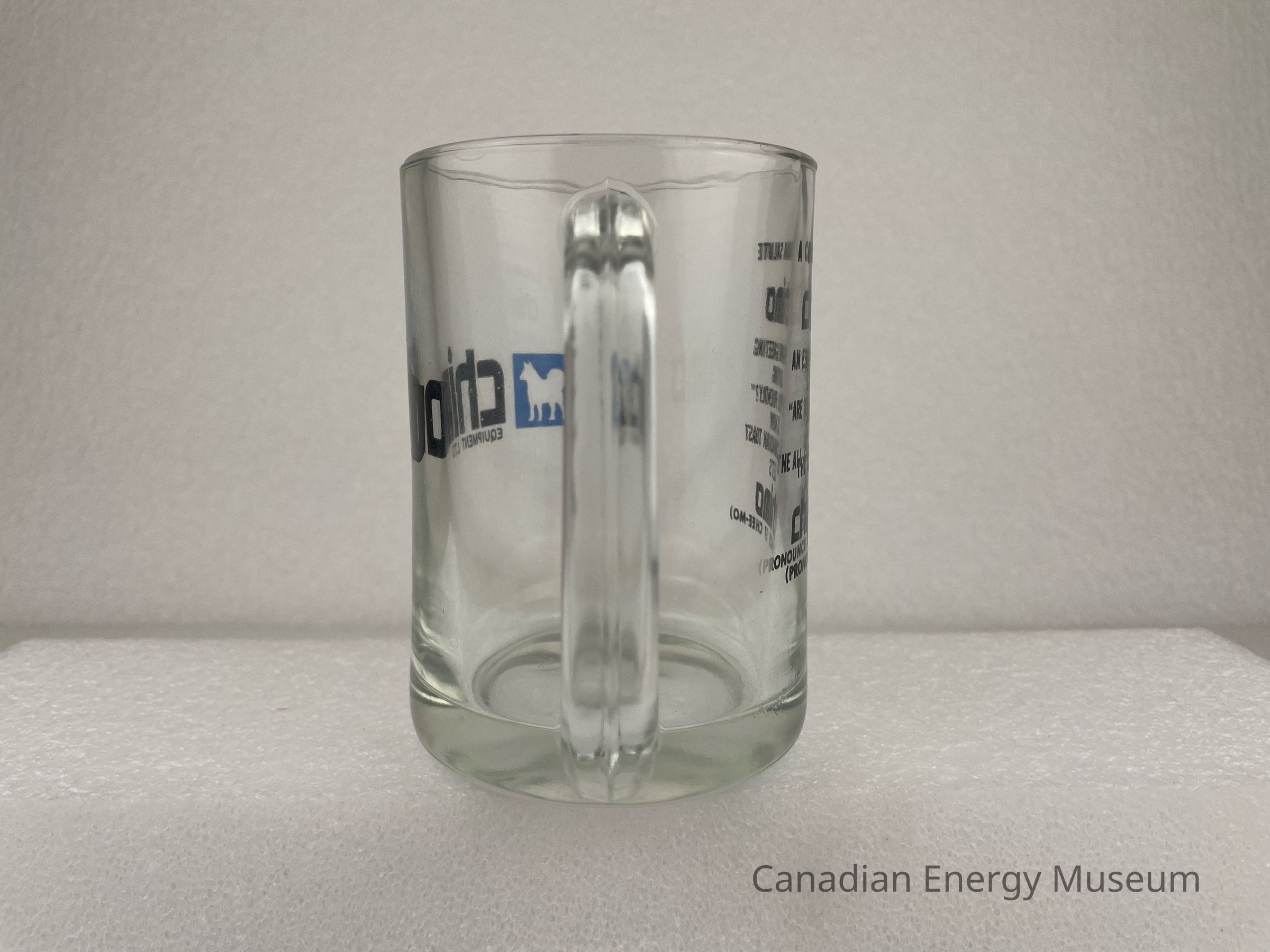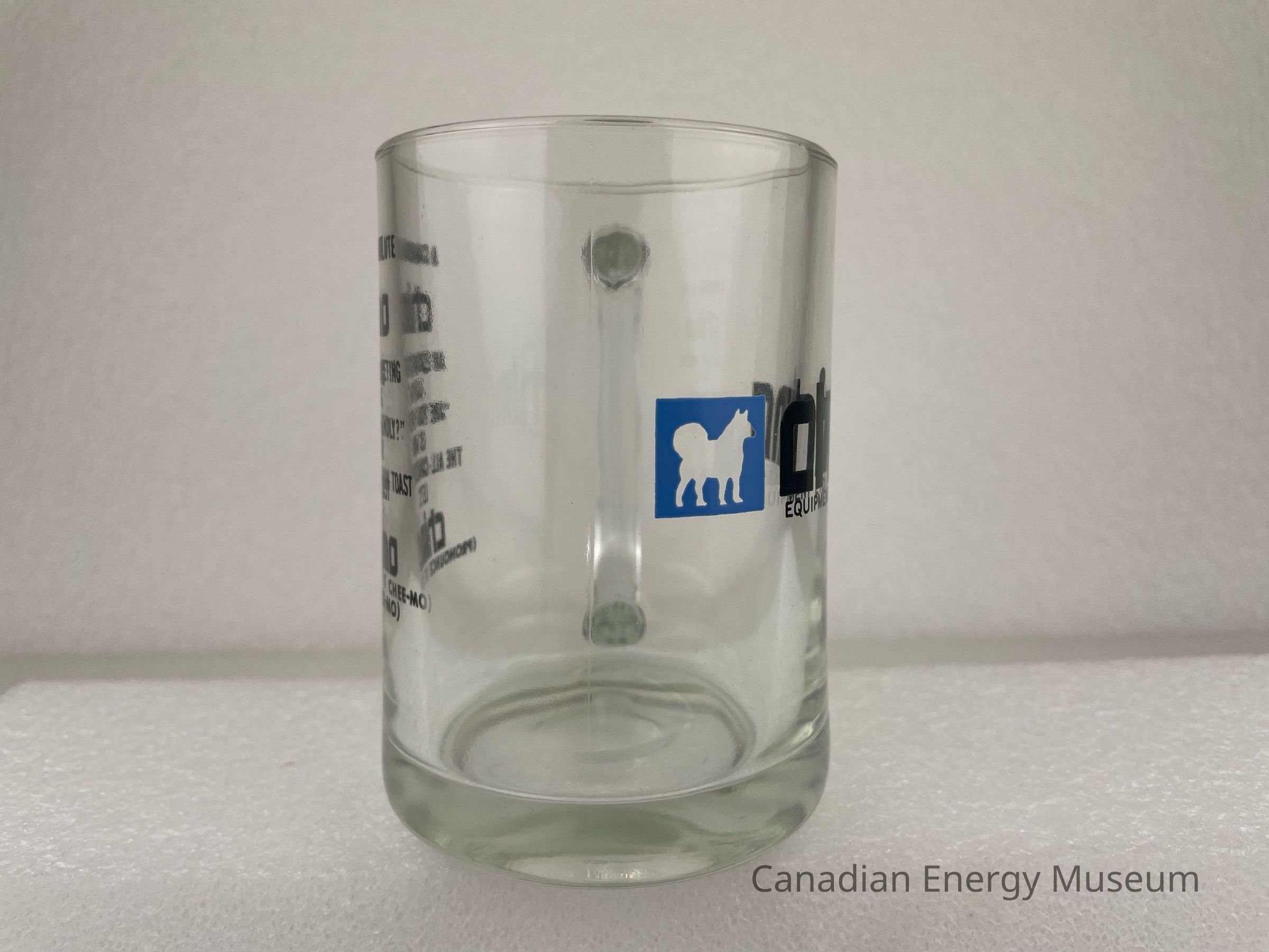Old Description: Glass beer mug with handle. Black text on one side: Chimo Equipment Ltd. with blue square and silhouette of a husky in the center. Opposite side has black text that reads: A Canadian Salute / Chimo / A Eskimo Greeting / Saying / "Are You Friendly?" / Is Now / The All-Canadian Toast / Let's / Chimo / (Pronounce It Chee-Mo).Collection