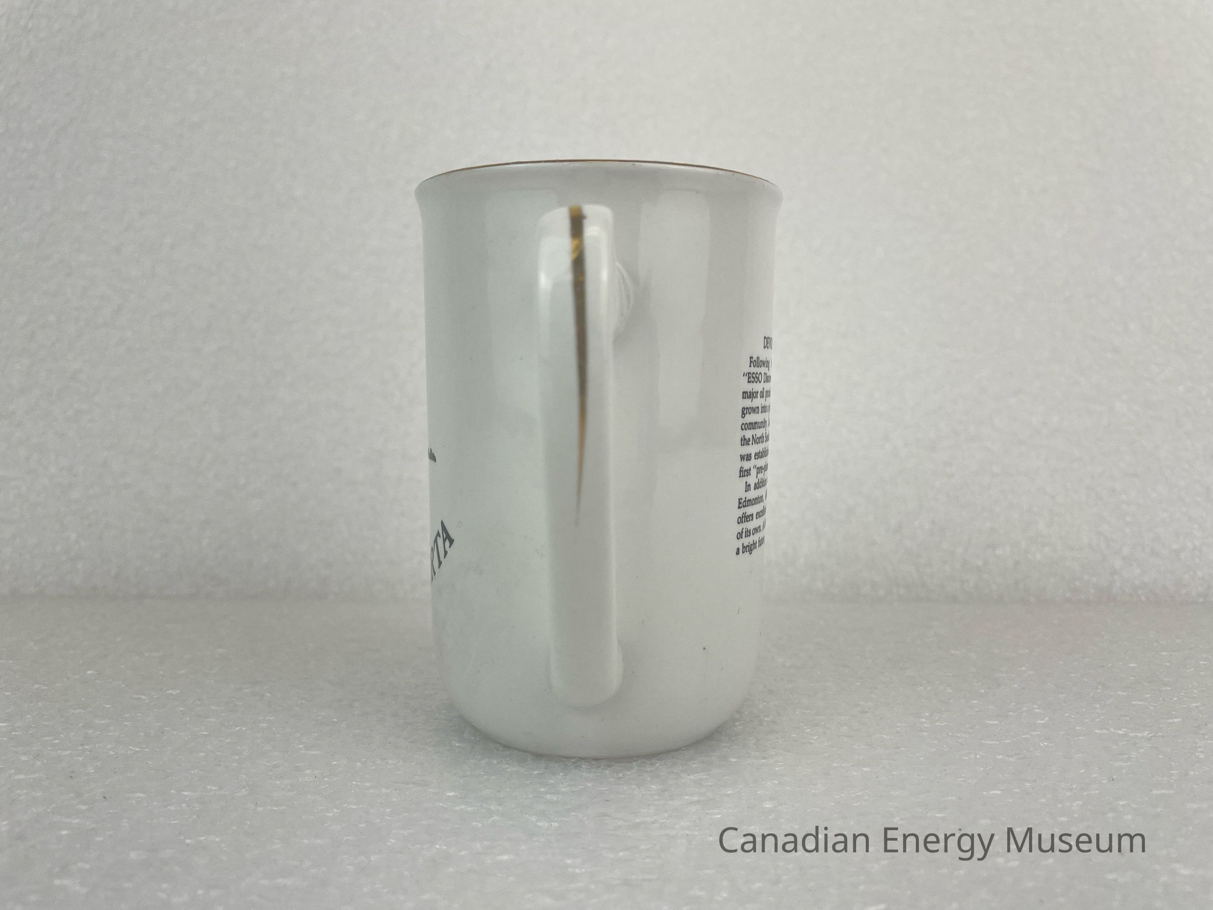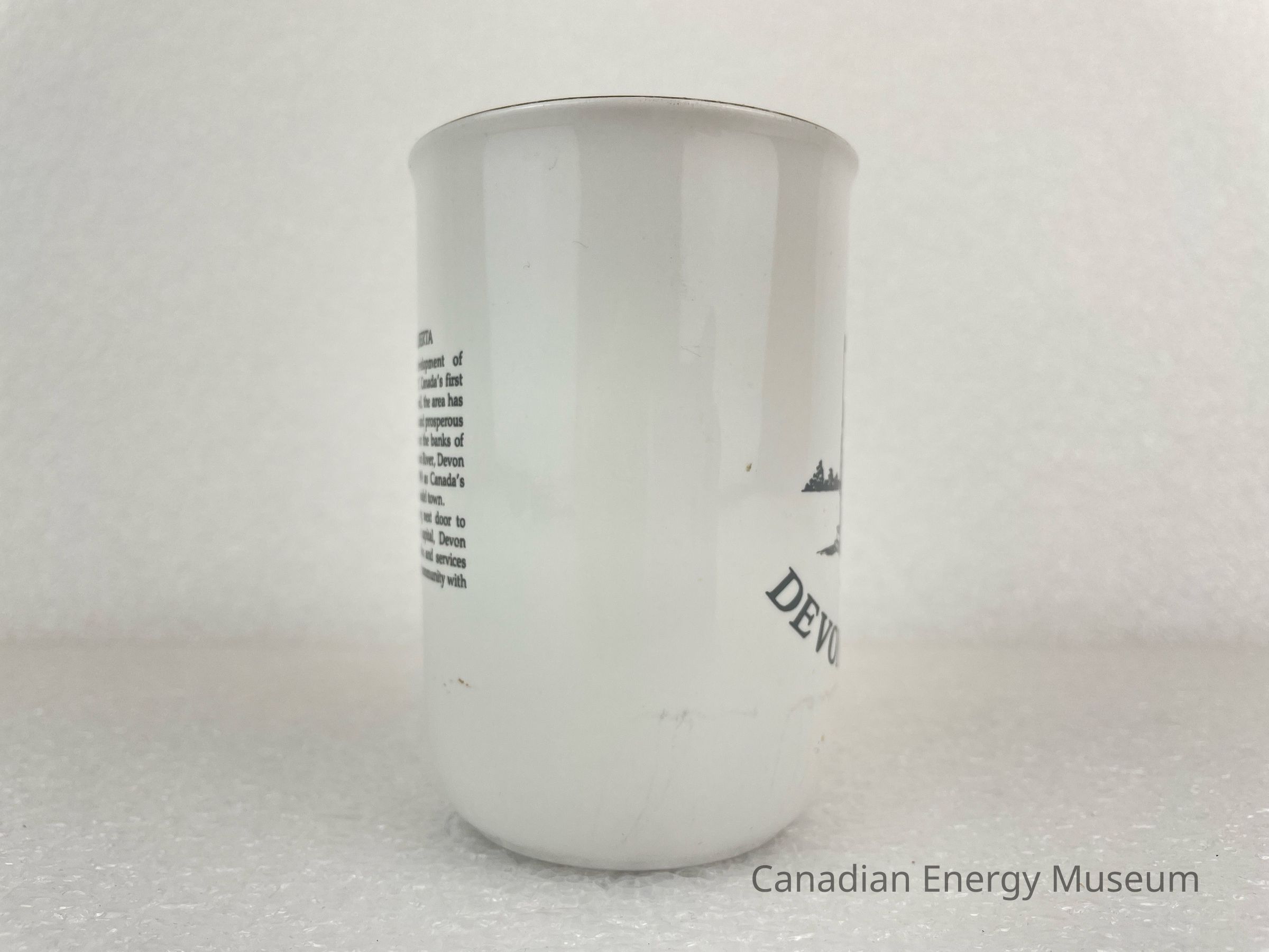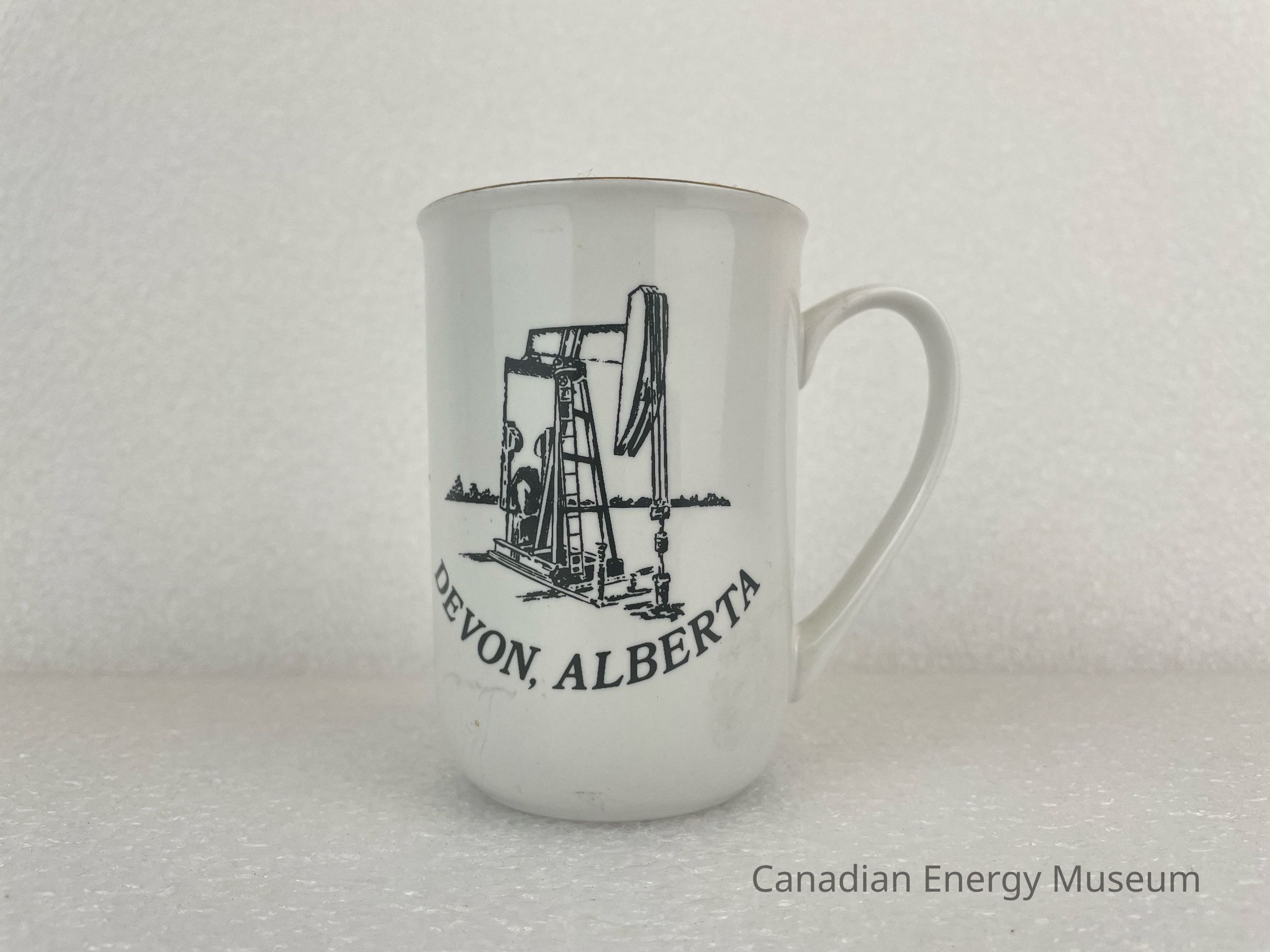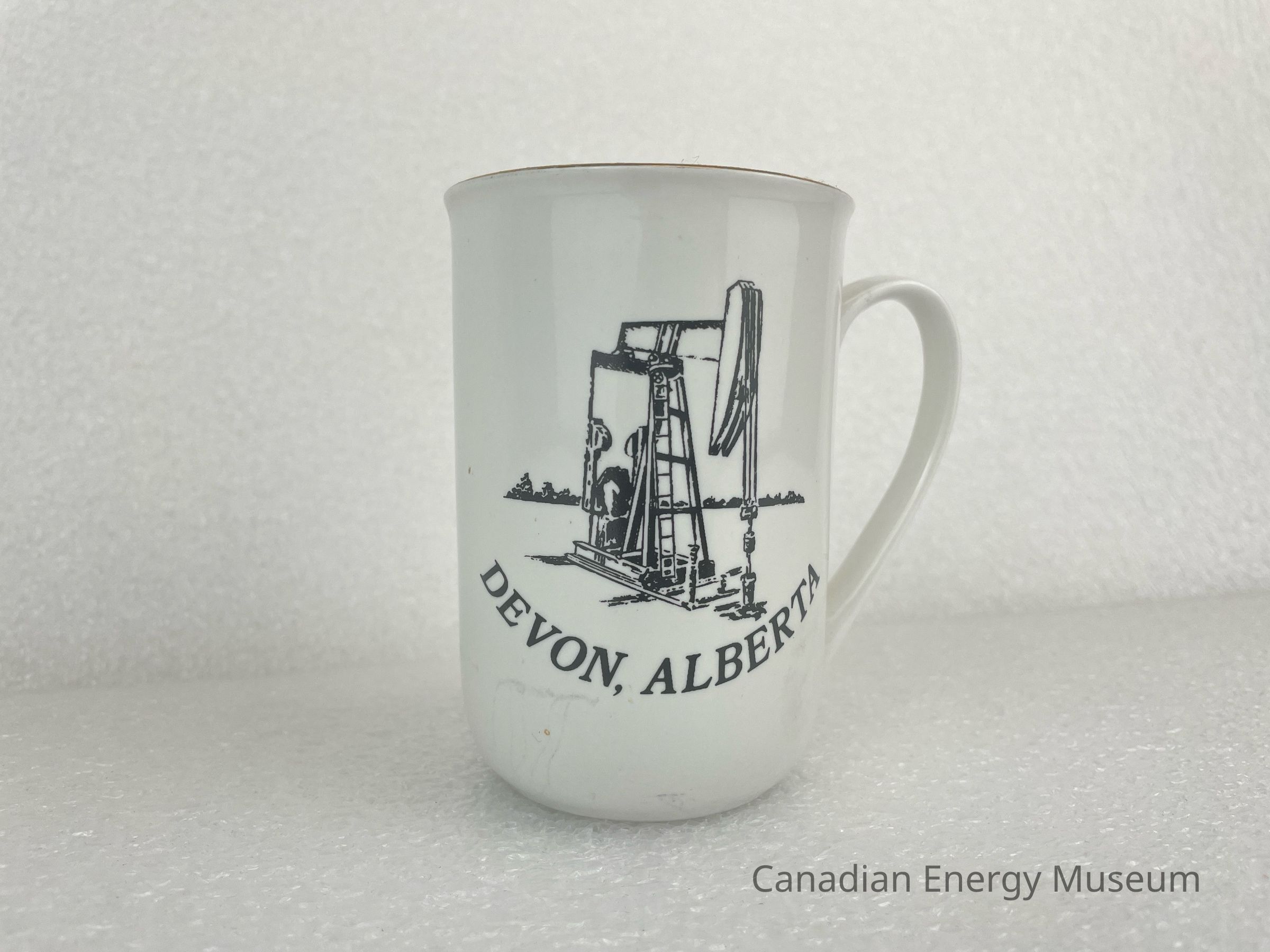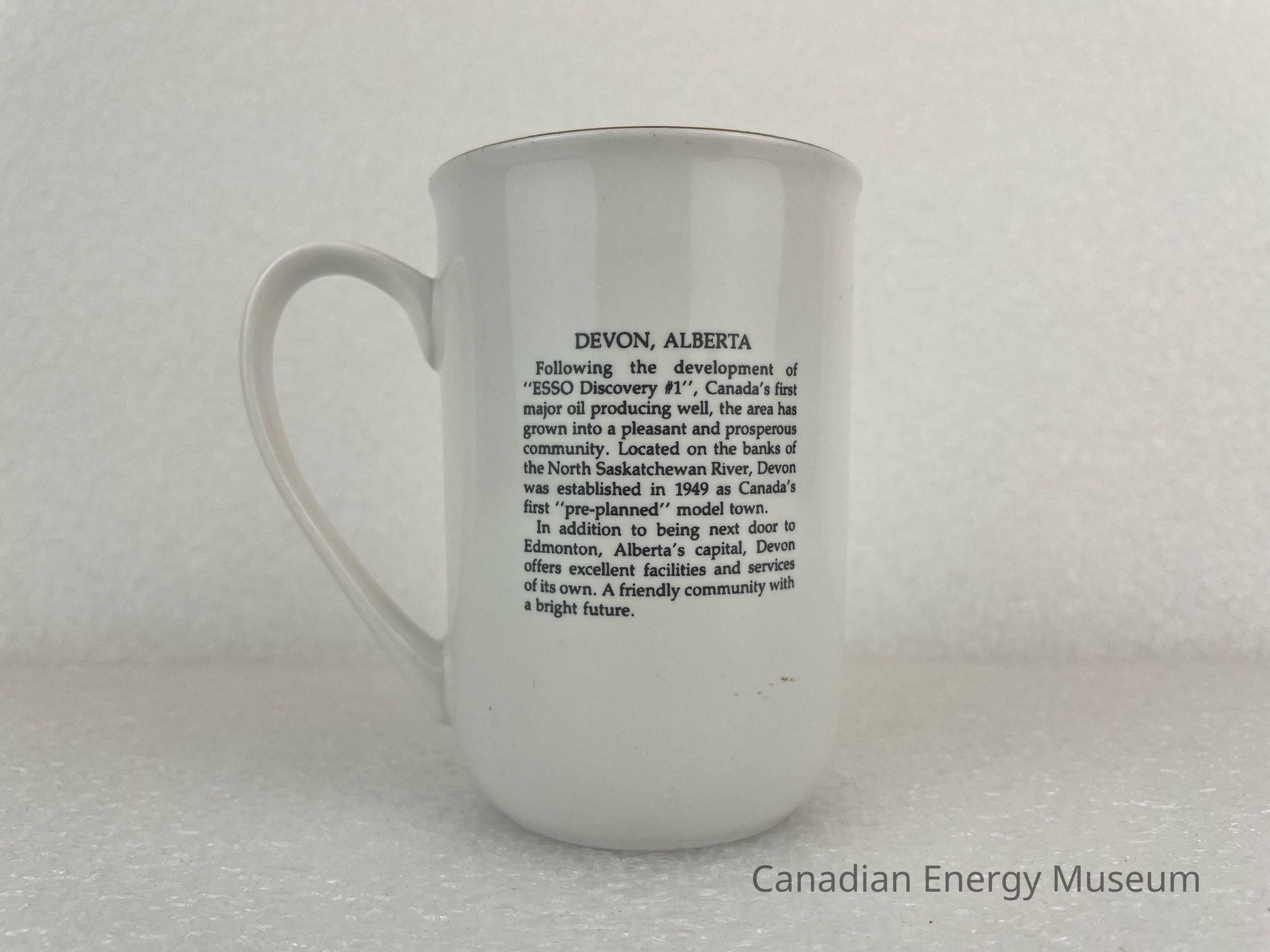 A white ceramic mug with a handle made from AALCO. The front of the mug features a black illustration of a pumpjack with upward arching black text underneath reading, "DEVON, ALBERTA". The back of the mug displays black text in small font reading, "DEVON, ALBERTA / Following the development of "ESSO Discovery #1", Canada's first major oil producing well, the area has grown into a pleasant and prosperous community. Located on the banks of the North Saskatchewan River, Devon was established in 1949 as Canada's first "pre-planned" model town. / In addition to being next door to Edmonton, Alberta's capital, Devon offers excellent facilities and services of its own. A friendly community with a bright future." The rim of the mug is gold and the handle displays a golden detail.
