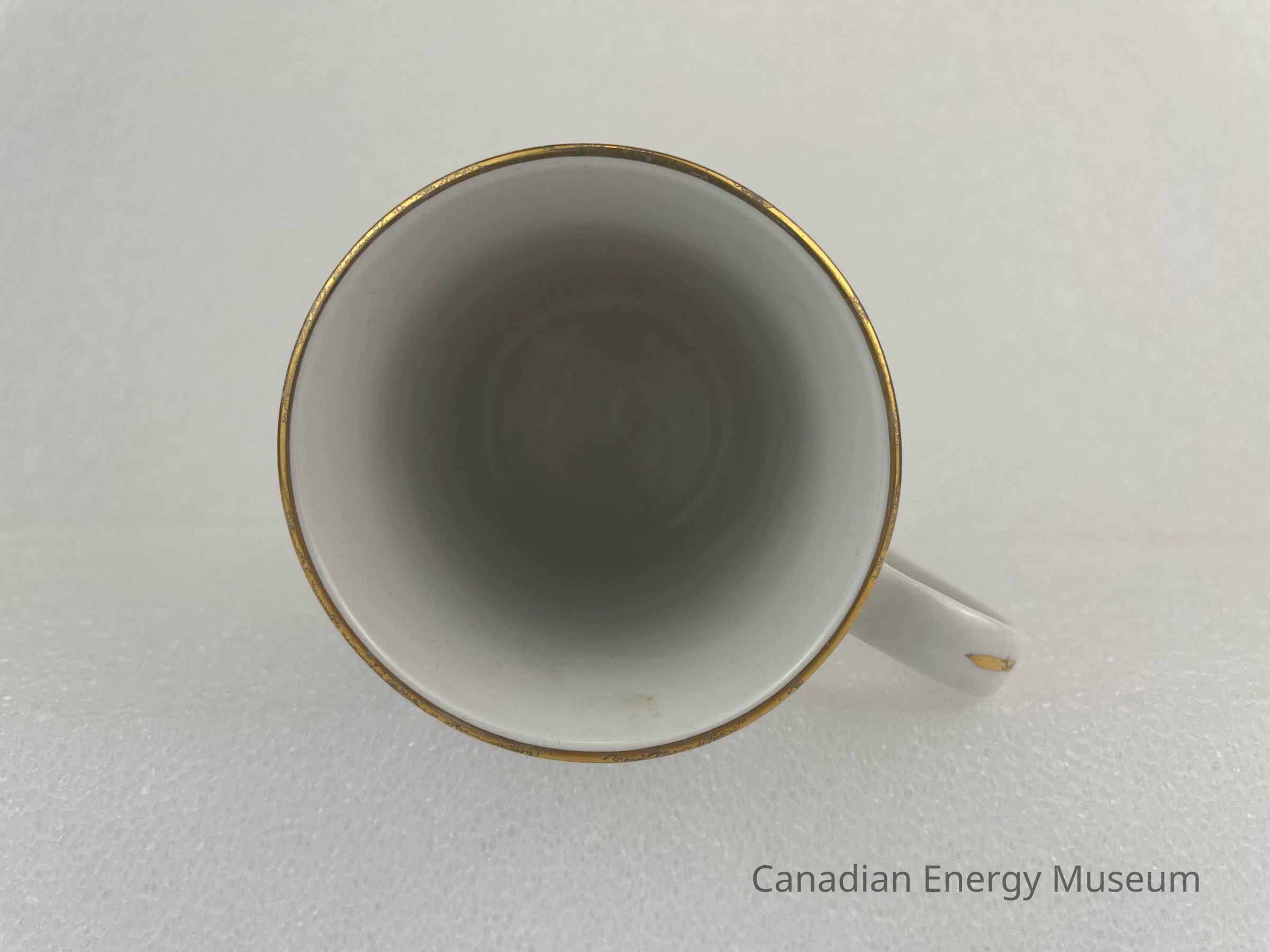 Drinkware, Mug, Ceramic, White, Gold, Black, Pumpjack, Devon, AlbertaDescription