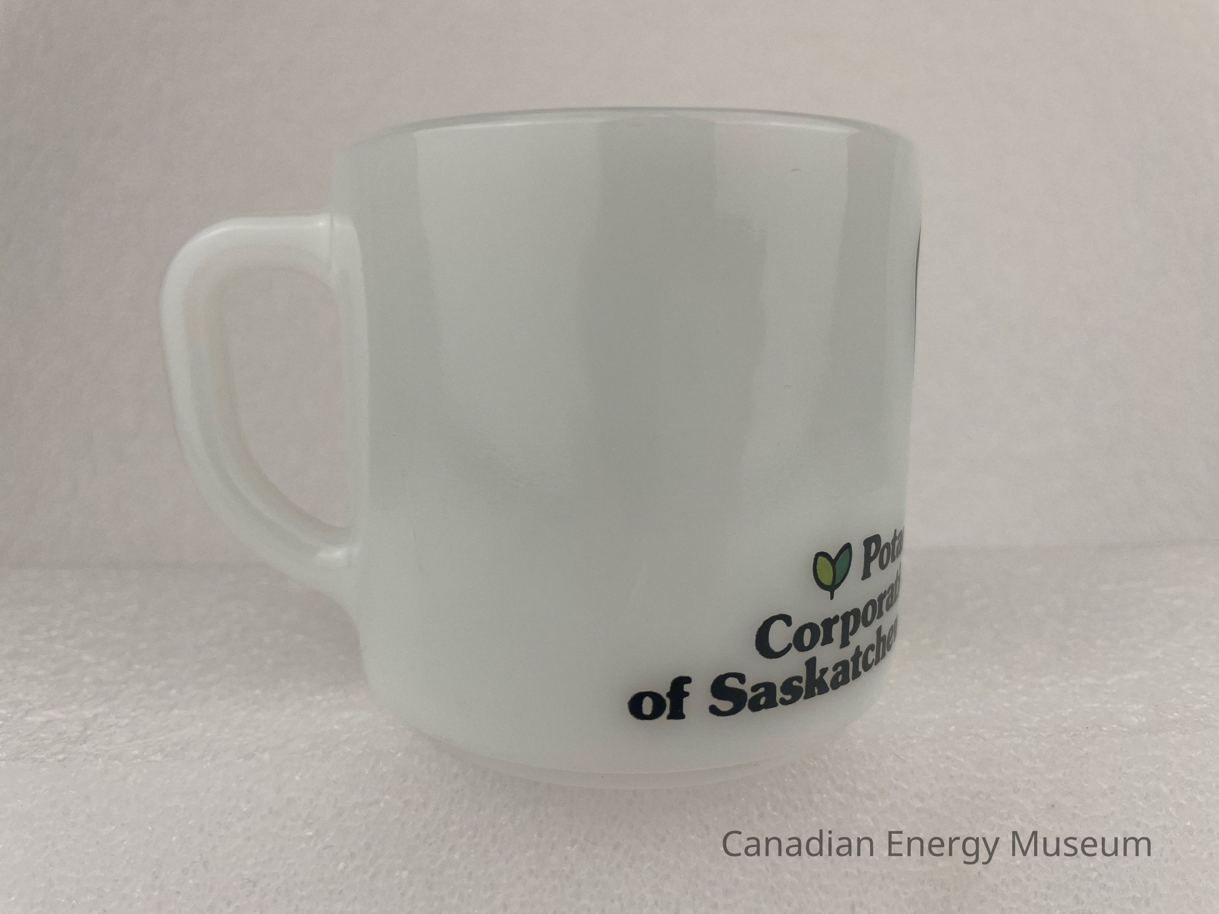 A white glass mug with a handle branded to Potash Corporation of Saskatchewan. The mug features a large slanted "P" made up of 3 lines of the colour green. Next to the left base of the large "P" is black text reading, "Potash Corporation of Saskatchewan", with a small illustration of a green shoot next to "Potash".Collection
