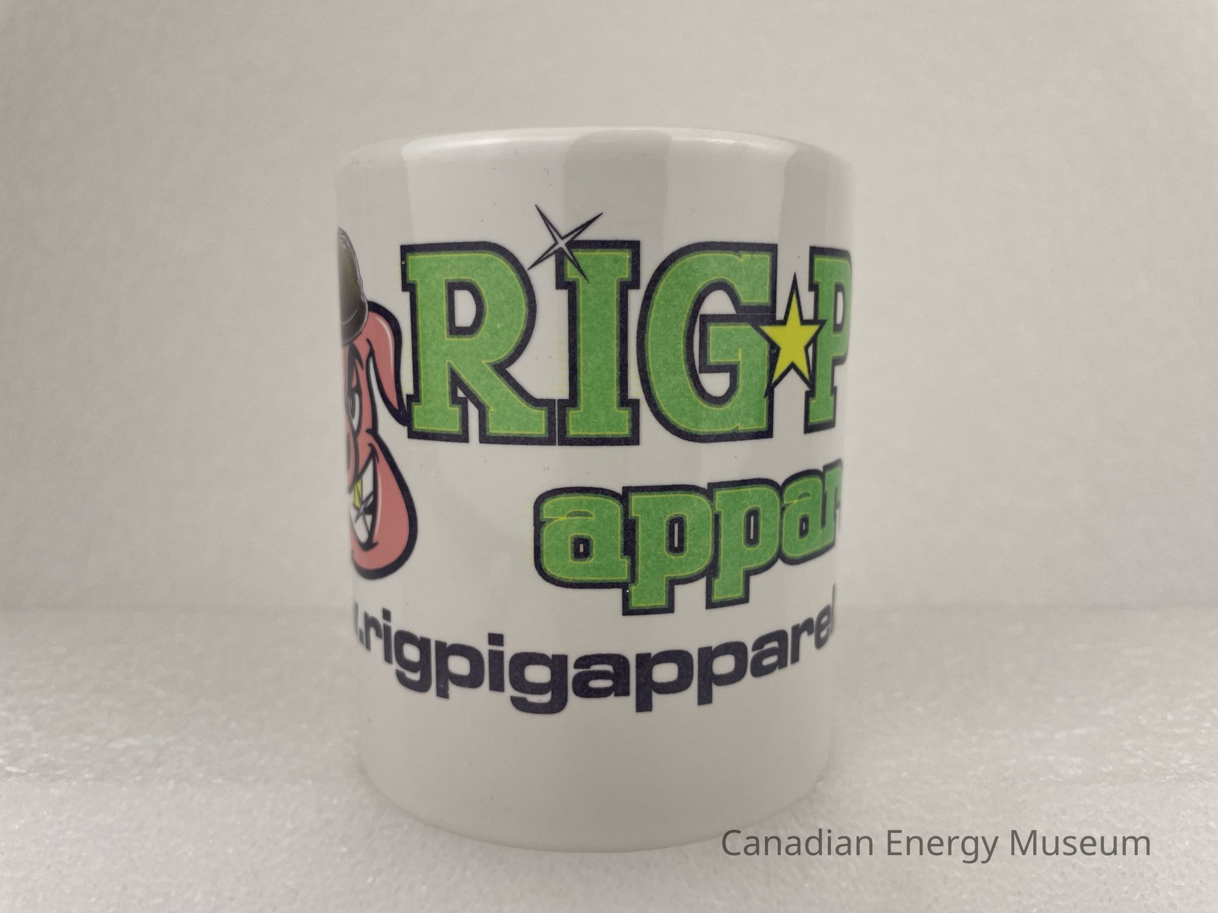 A white ceramic mug with a handle branded to Rig Pig Apparel. The mug features a large, pink, white and black illustration of a pig grinning with a golden tooth and a black hard hat. Next to the pig in large green text that spreads across the mug reads, "RIG PIG Apparel", with a yellow star in the middle of "RIG" and "PIG". At the bottom, in black text, reads, "www.rigpigapparel.com".Collection