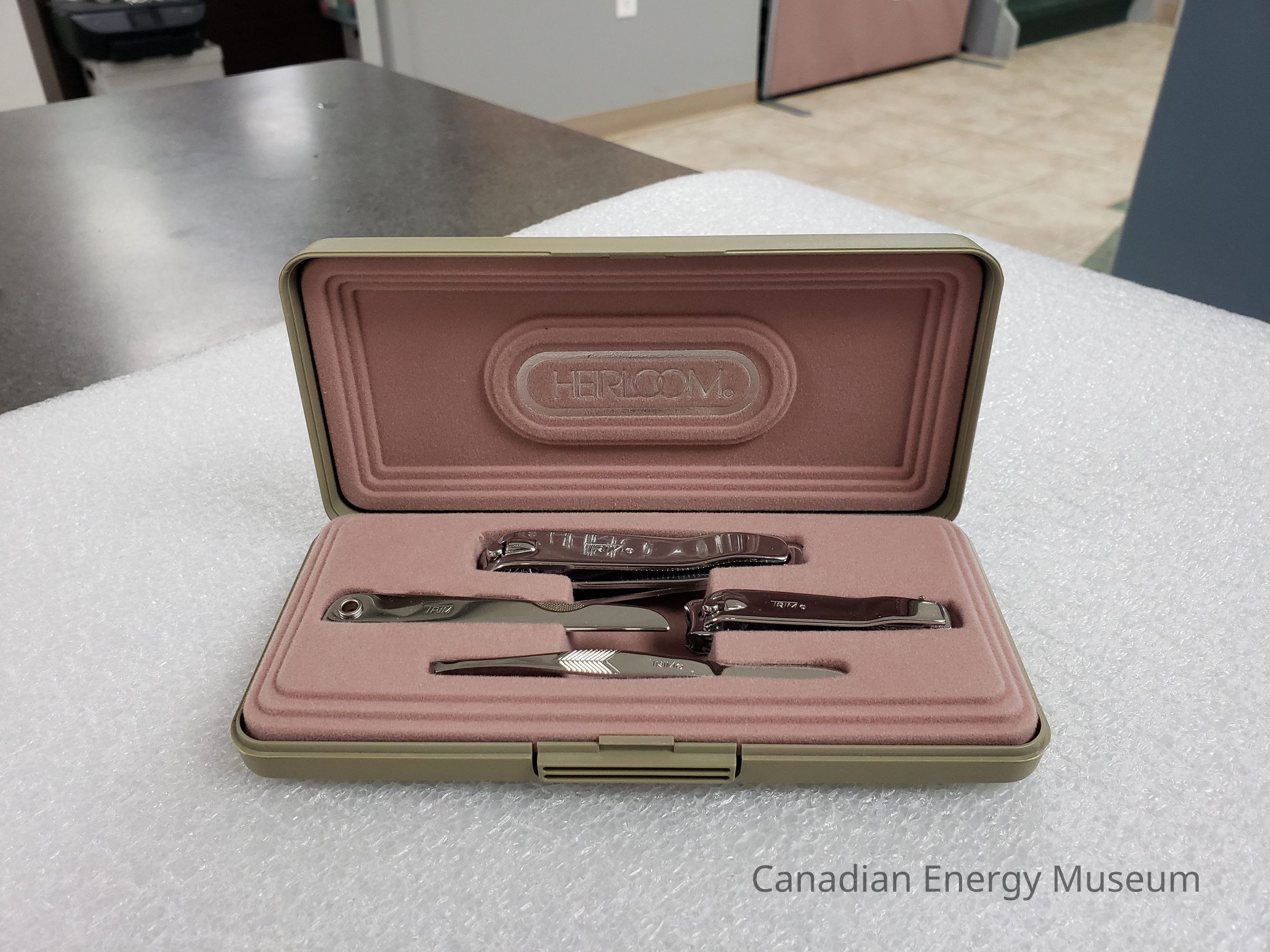 Features: Set of four nail tools (large nail clippers, small nail clippers, folding nail file, and tweezers). Each tool is in plain chrome-colouring, bearing the text logo reading "Trim". Tools are seated in specially shaped spaces within the hard case. Housing is flocked, molded plastic in dusty pink. Edges of the housing is shaped into three steps (2mm high/deep). The inside of the lid has matching molded dusty pink plastic (flocked), with inverse step-shaped edges. At the centre of the lid interior is a raised section with the text "HEIRLOOM" surounded by an oval, both in silver.