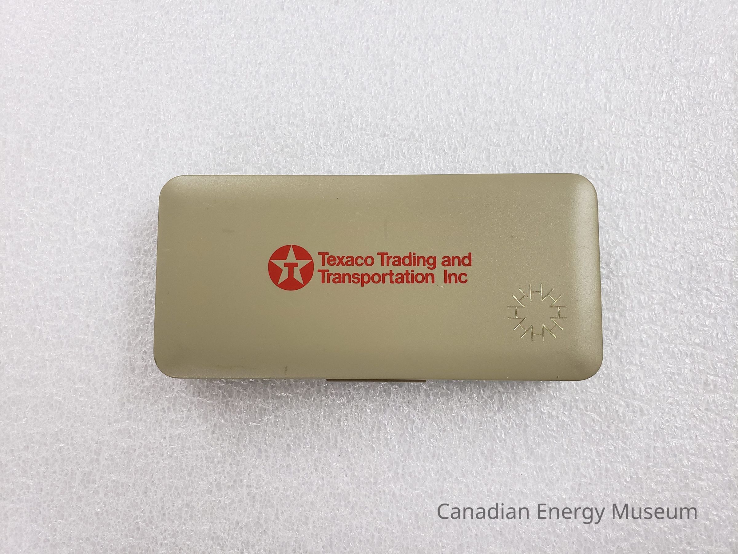 The exterior is a rectangular hard clam-shell. The plastic khaki and lightly textured. The case opens on a simple two-piece hinge, with a front clasp (pressed in to release lid and open). On the top of the exterior (centred) is the Texaco logo (red circle, with an interior uncoloured/khaki star and red "T" within the star) to the left, and the following text in red to the right: "Texaco Trading and Transportation Inc". In the bottom-right is also a radial line design in gold.Collection
