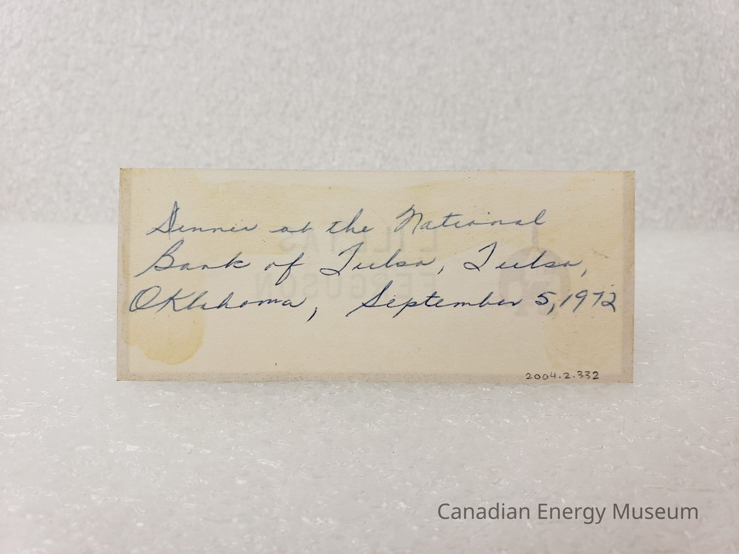 A place card, made out to Lillias M. Ferguson. Features glittery golden border and the national Bank of Tulsa logo in gold print, with "LILLIAS FERGUSON" typewritten in black ink. On the reverse is a handwritten note in blue ballpoint reading "Dinner at the National Bank of Tulsa, Tulsa, Oklahoma, September 5, 1972".