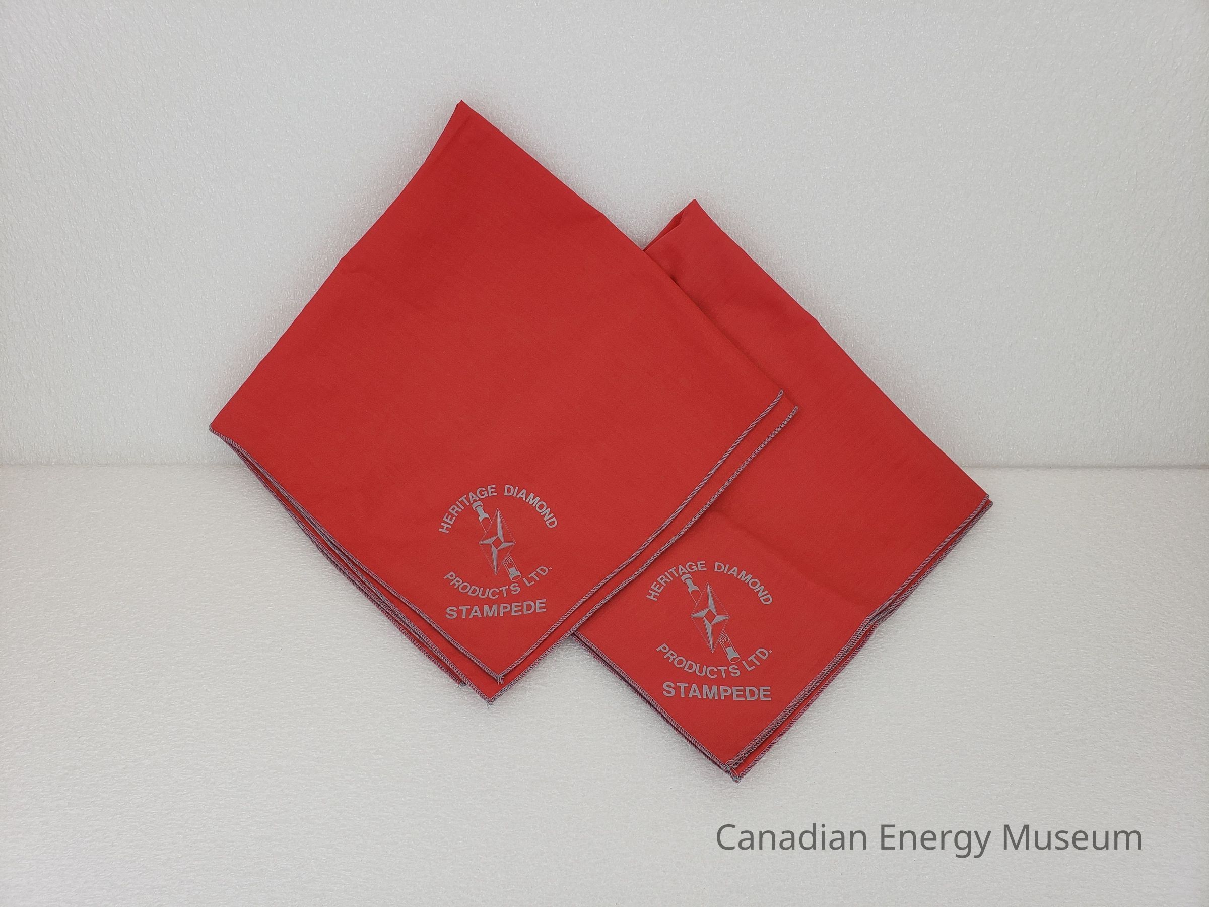 Design: A red fabric napkin, branded to Heritage Diamond Product Ltd. The square napkins are folded into quarters, with a printed design on two opposite corners. The one corner has the grey/silver printed design of an elongated diamond shape with a bar-like piece of equipment behind it. In a circle around the design is the curved text "HERITAGE DIAMOND" at the top and "PRODUCT LTD." at the bottom. Below is also printed "STAMPEDE". On the opposite corner is a large grey/silver printed square, with the imprint of the above design on it. Along the edge of the napkin is grey/silver stitching.Collection