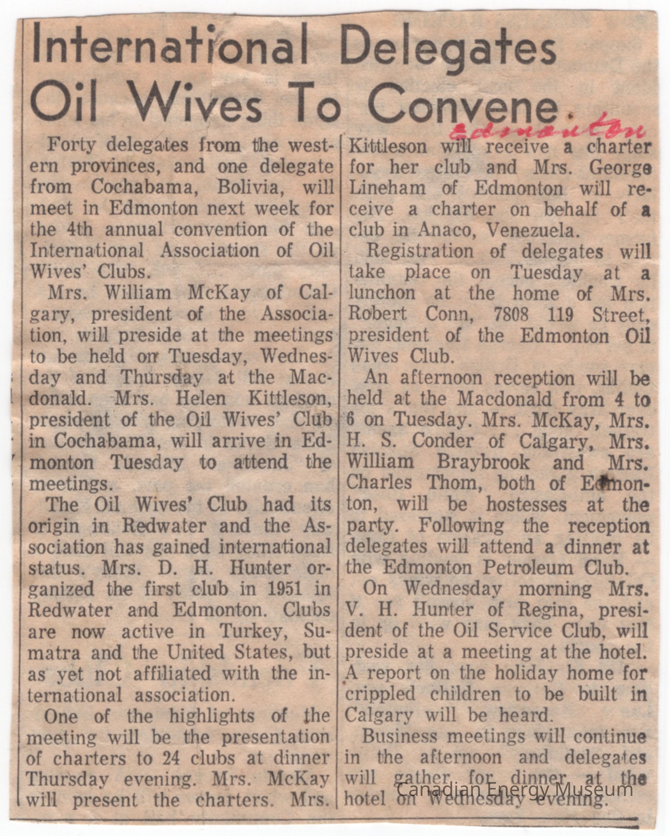[News Clipping] "International Delegates Oil Wives To Convene", EdmontonEntry/Object ID