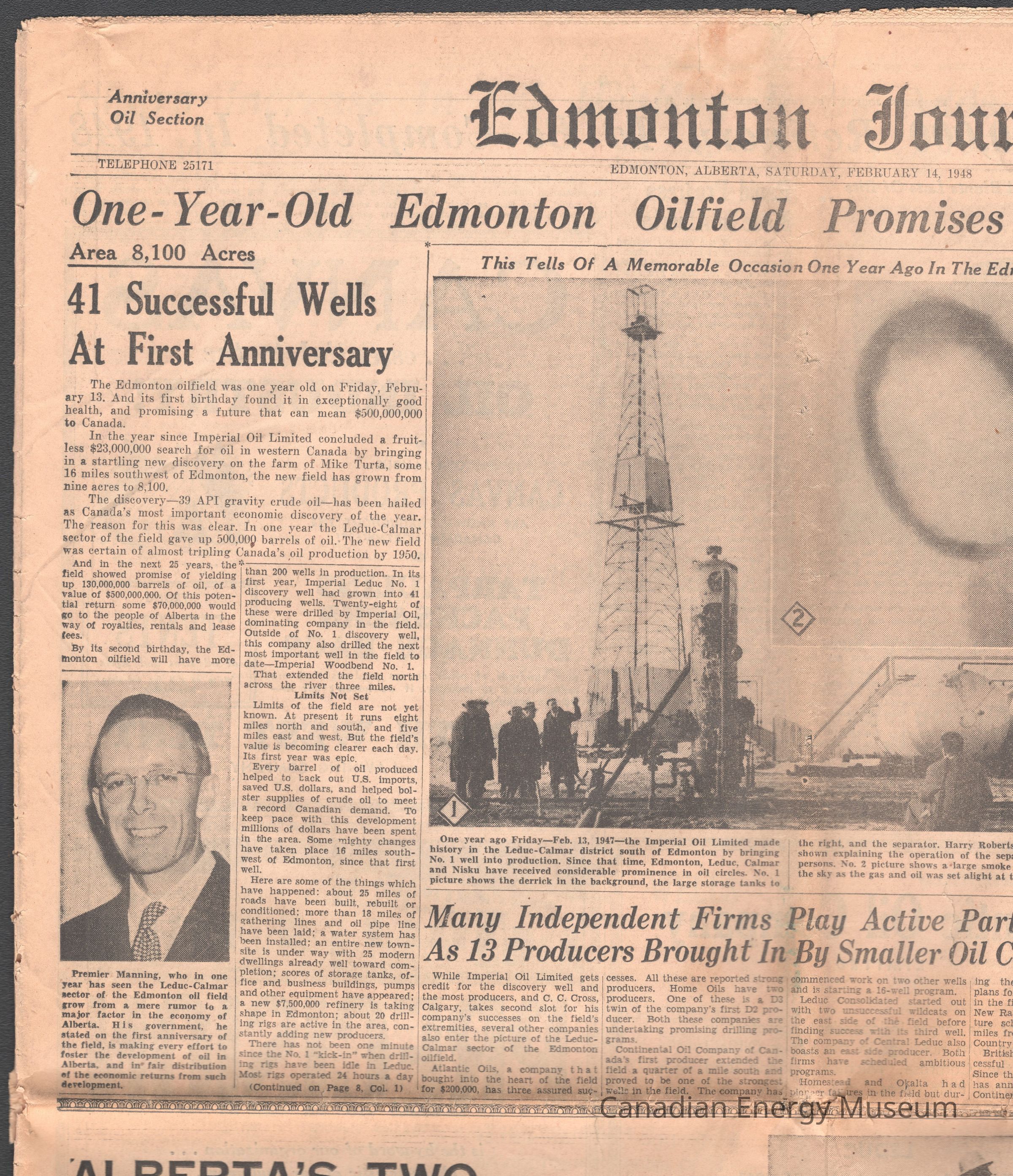 A copy of the 14 July 1948 issue of the Edmonton Journal. The front page article is titled "One-Year-Old Edmonton Oilfield Promises To Yield $500,000,000".Collection